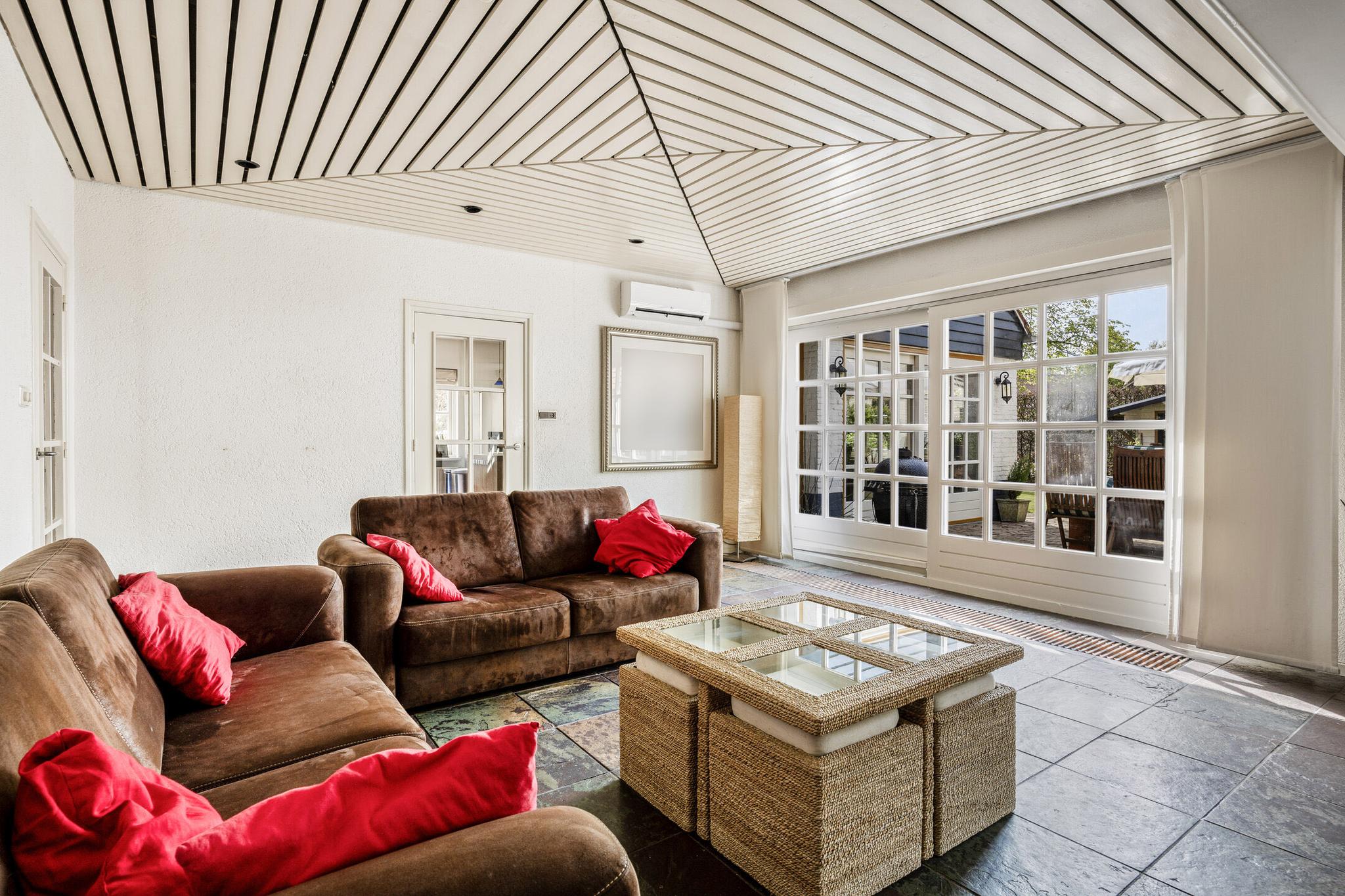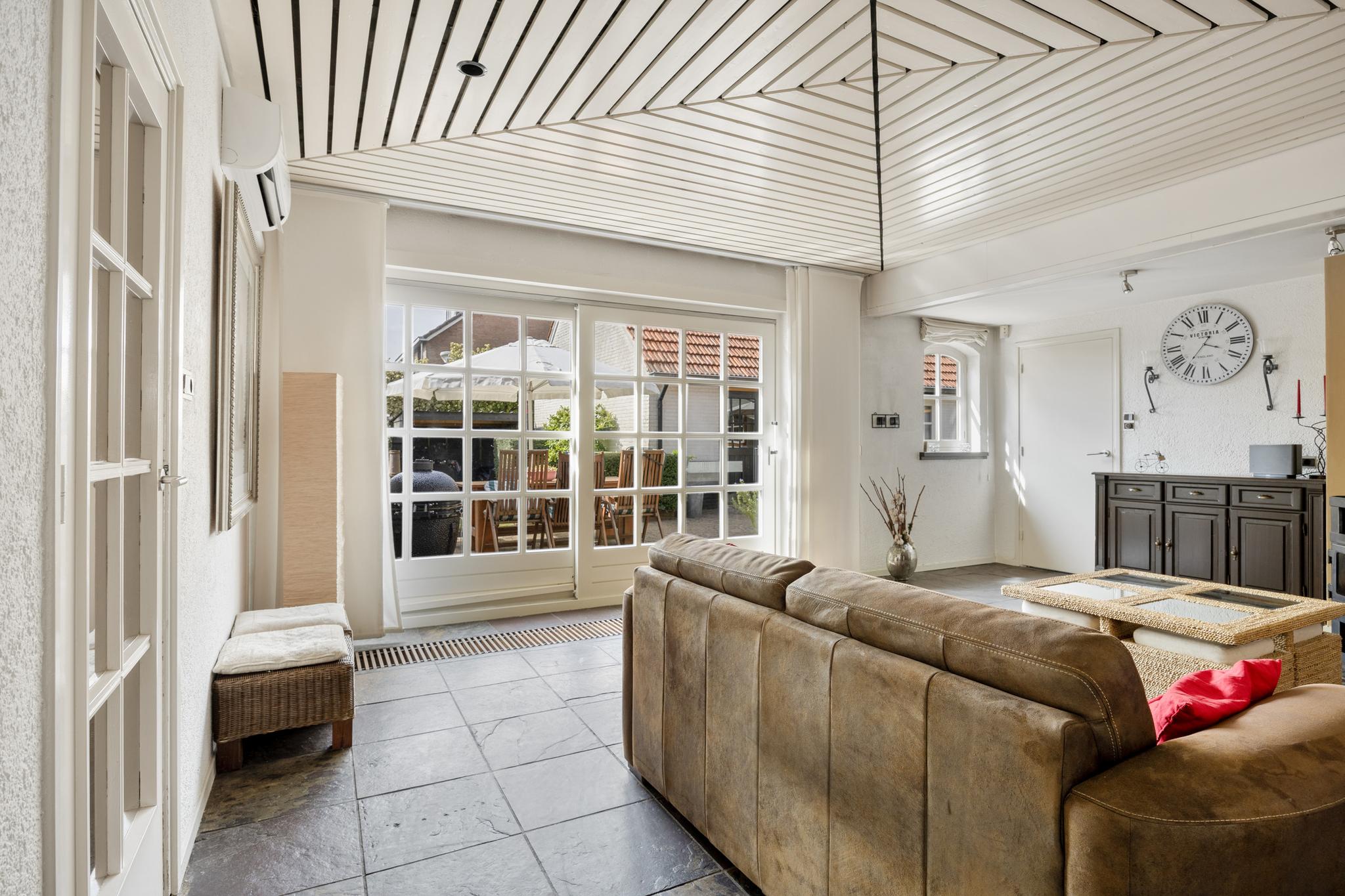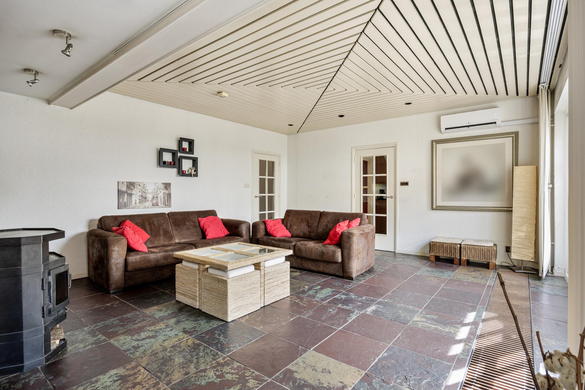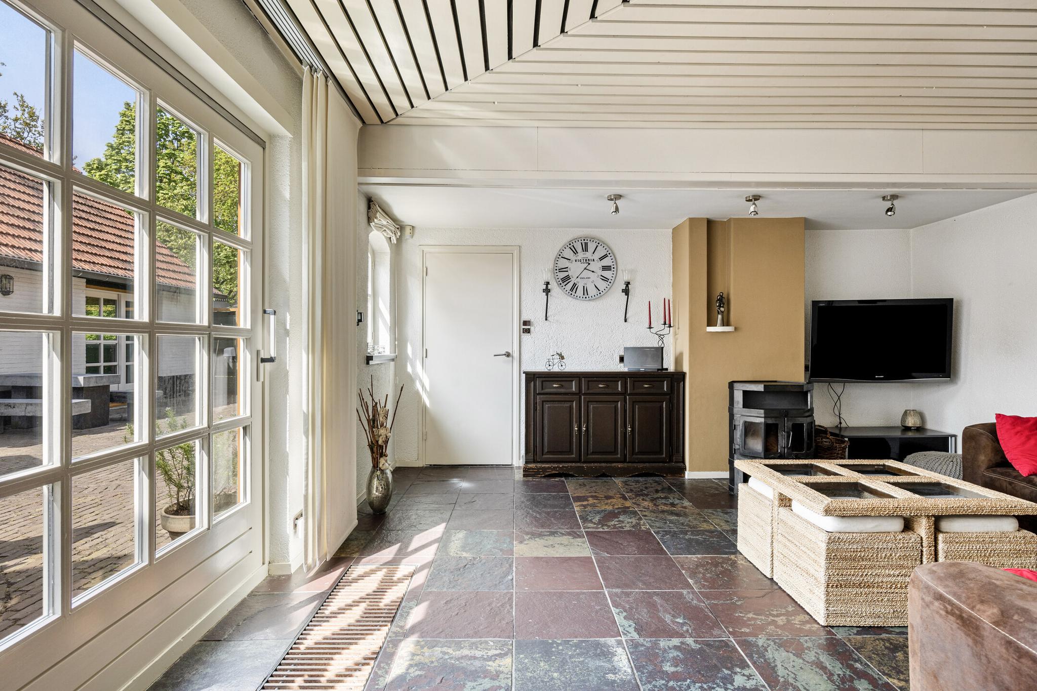 De tweede woonkamer is tuin gericht en is voorzien van een leistenen vloer (met vloerverwarming) en uitgerust met een haard voor de sfeervolle avonden.