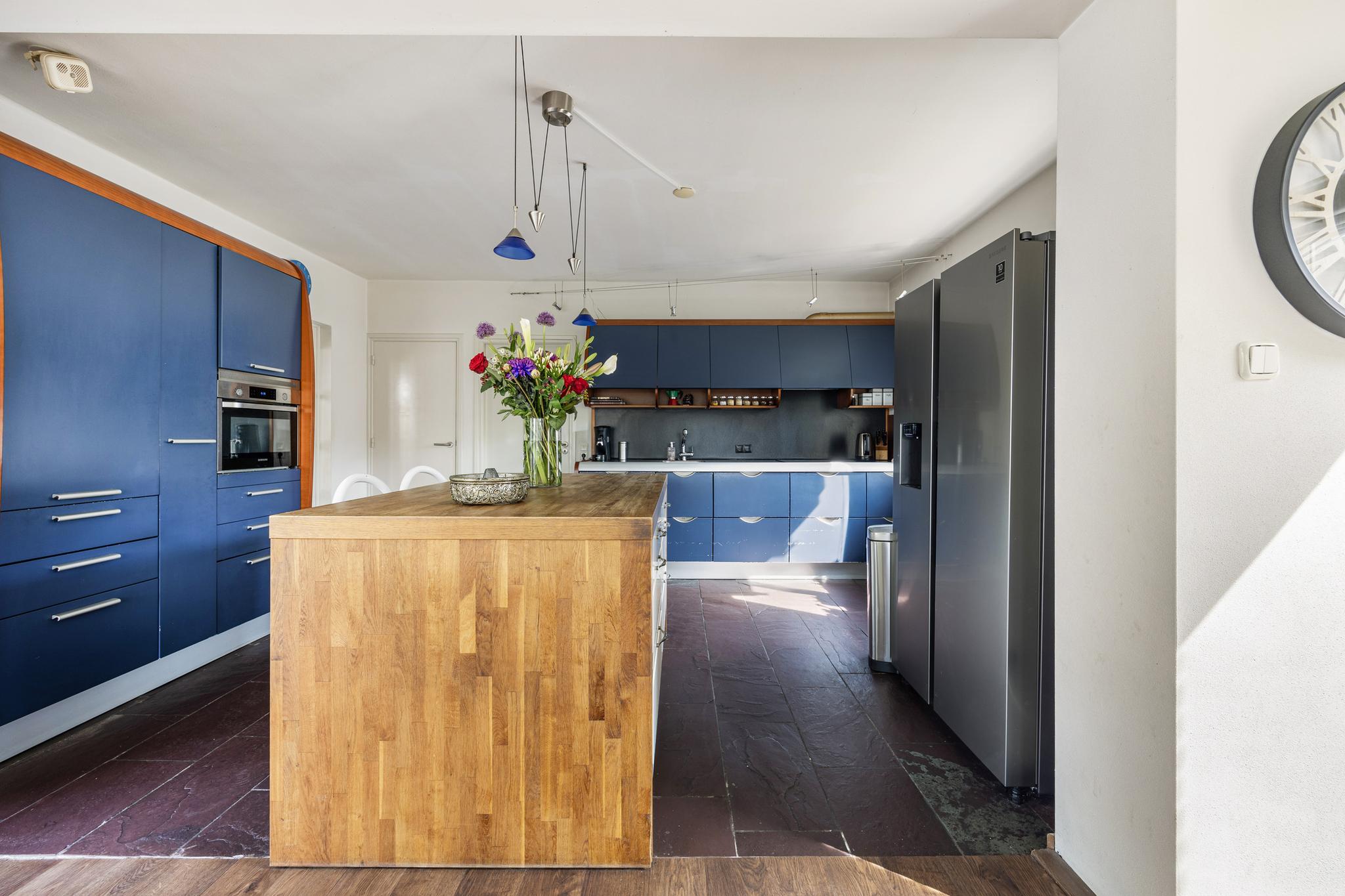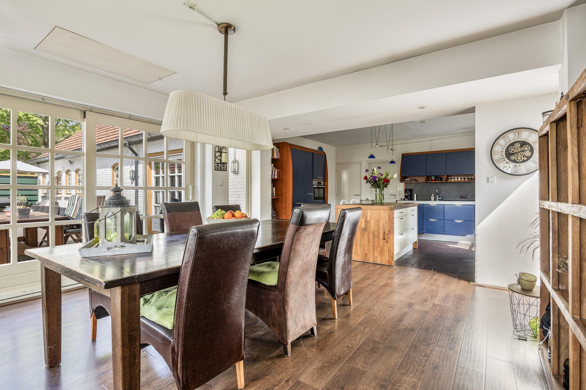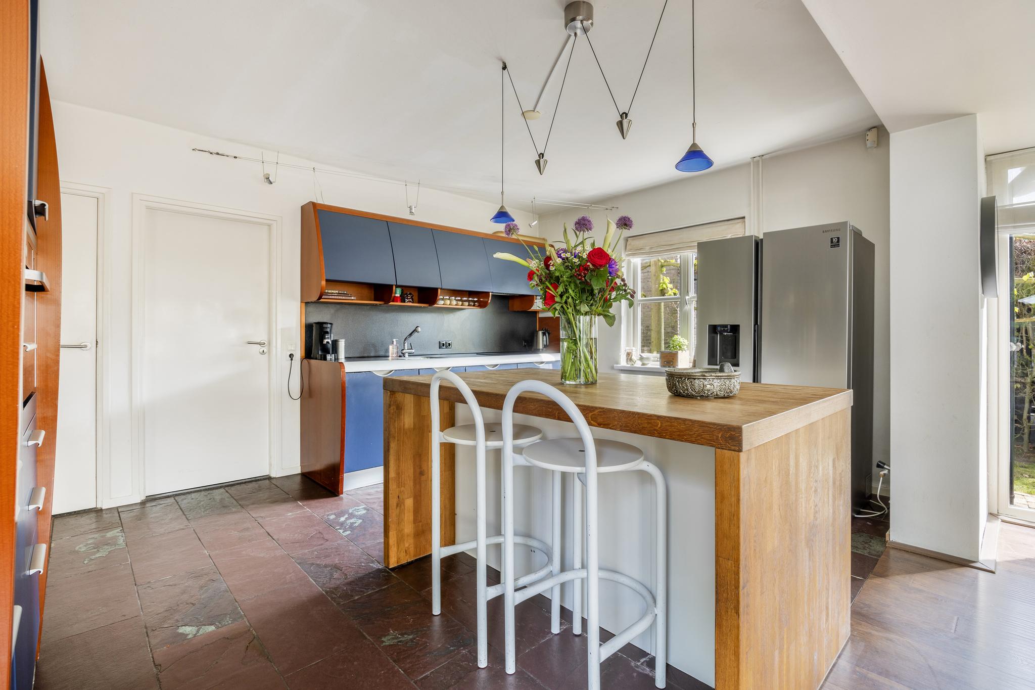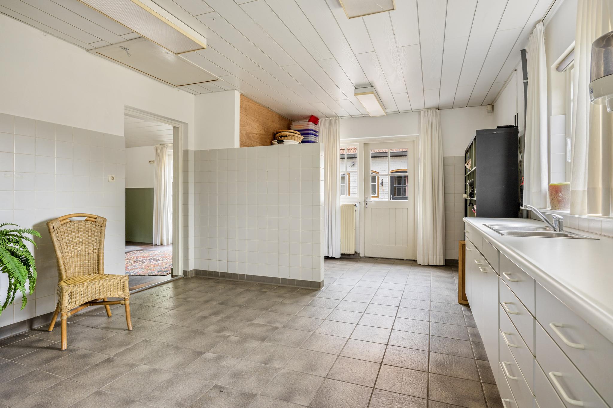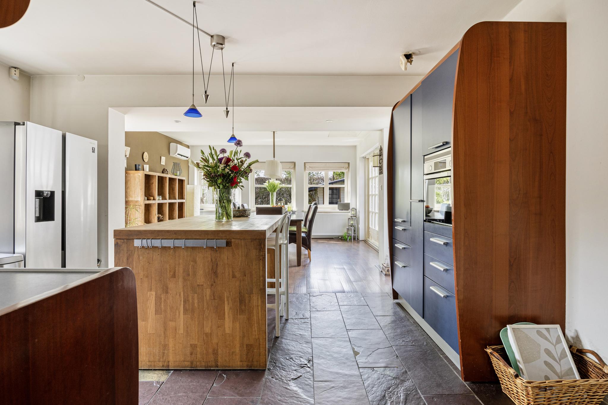 Er is een ruime eetkeuken met tuinzicht in de uitbouw gerealiseerd. De keuken is voorzien van inbouwapparatuur.