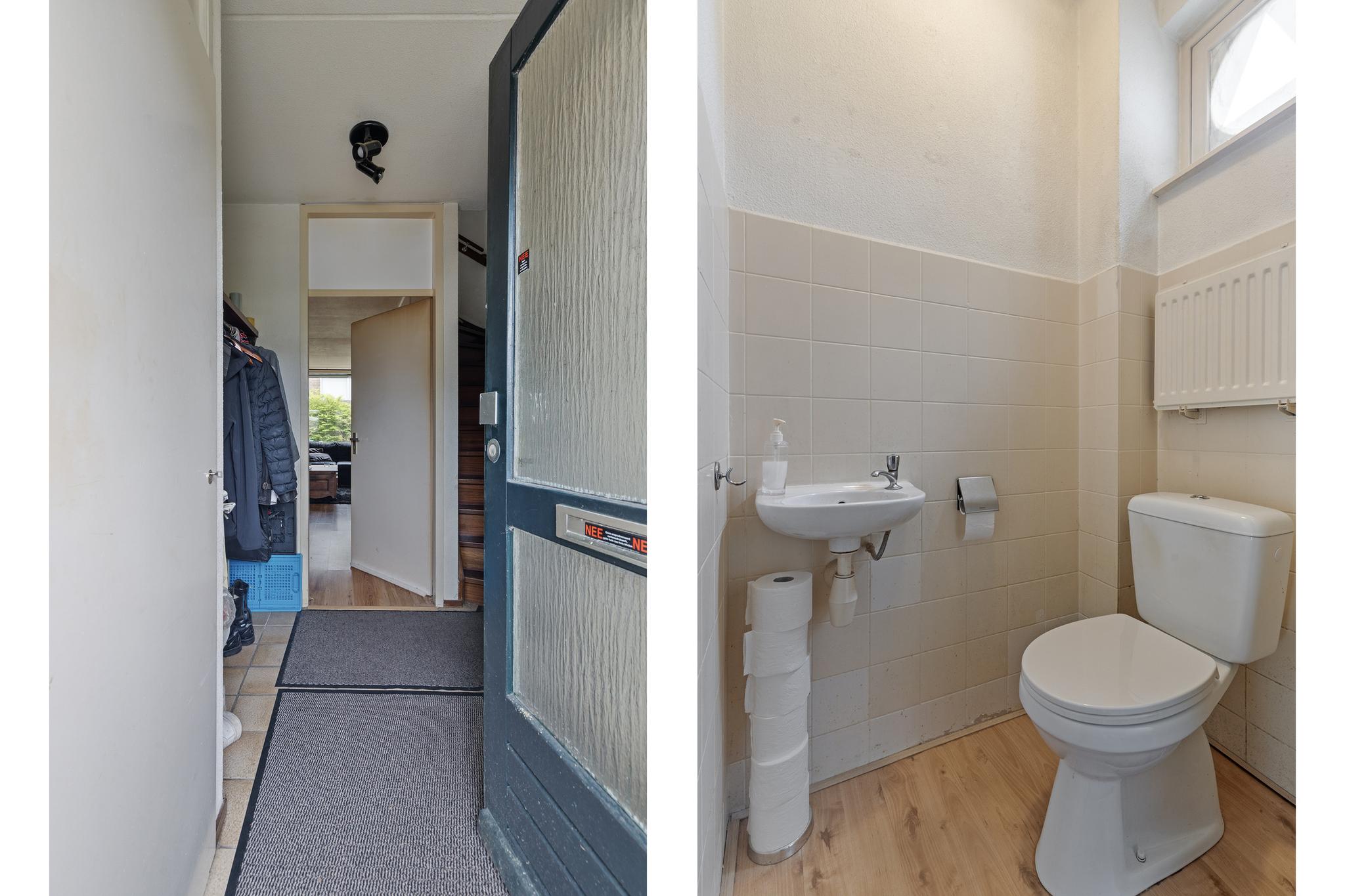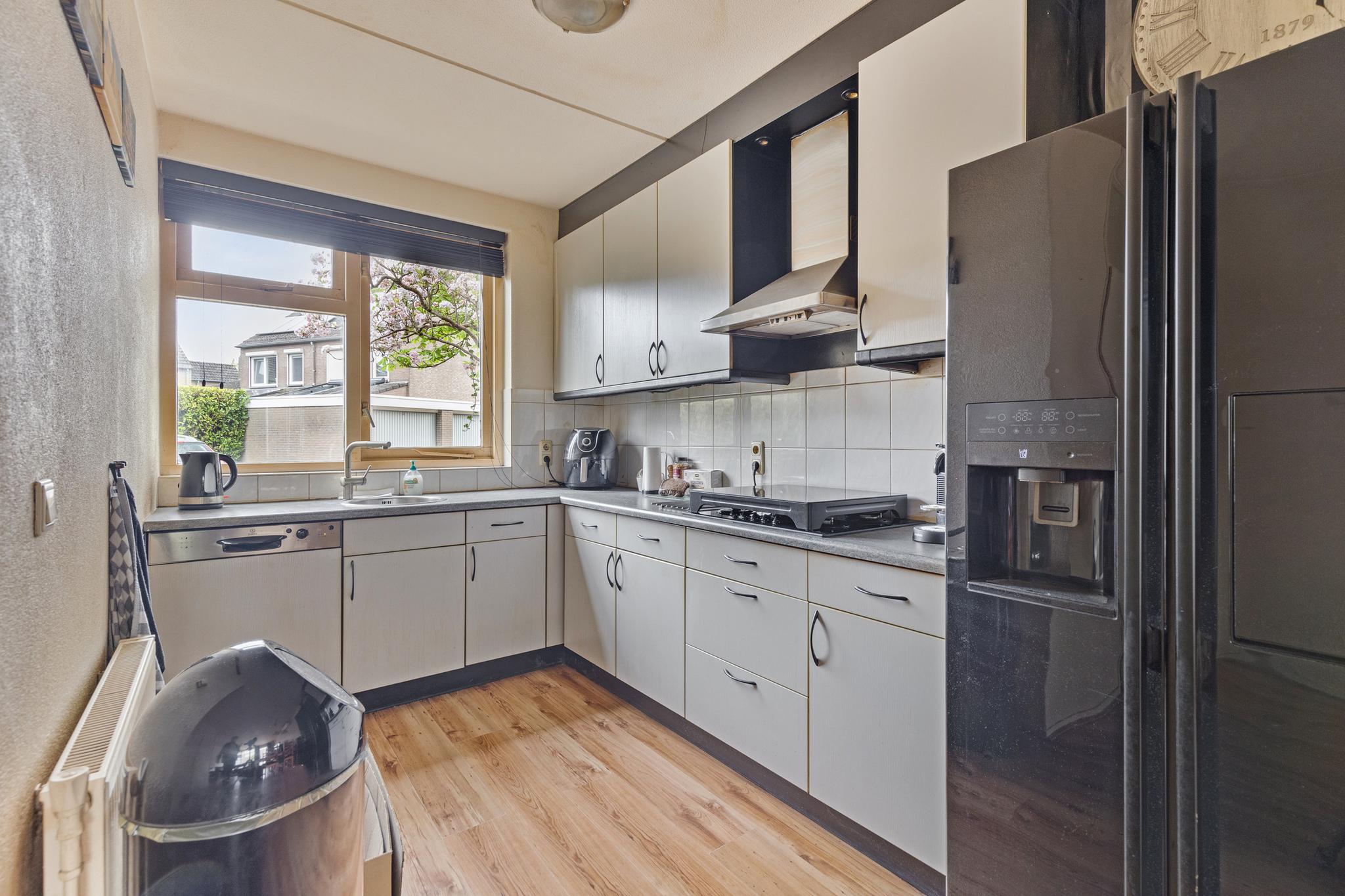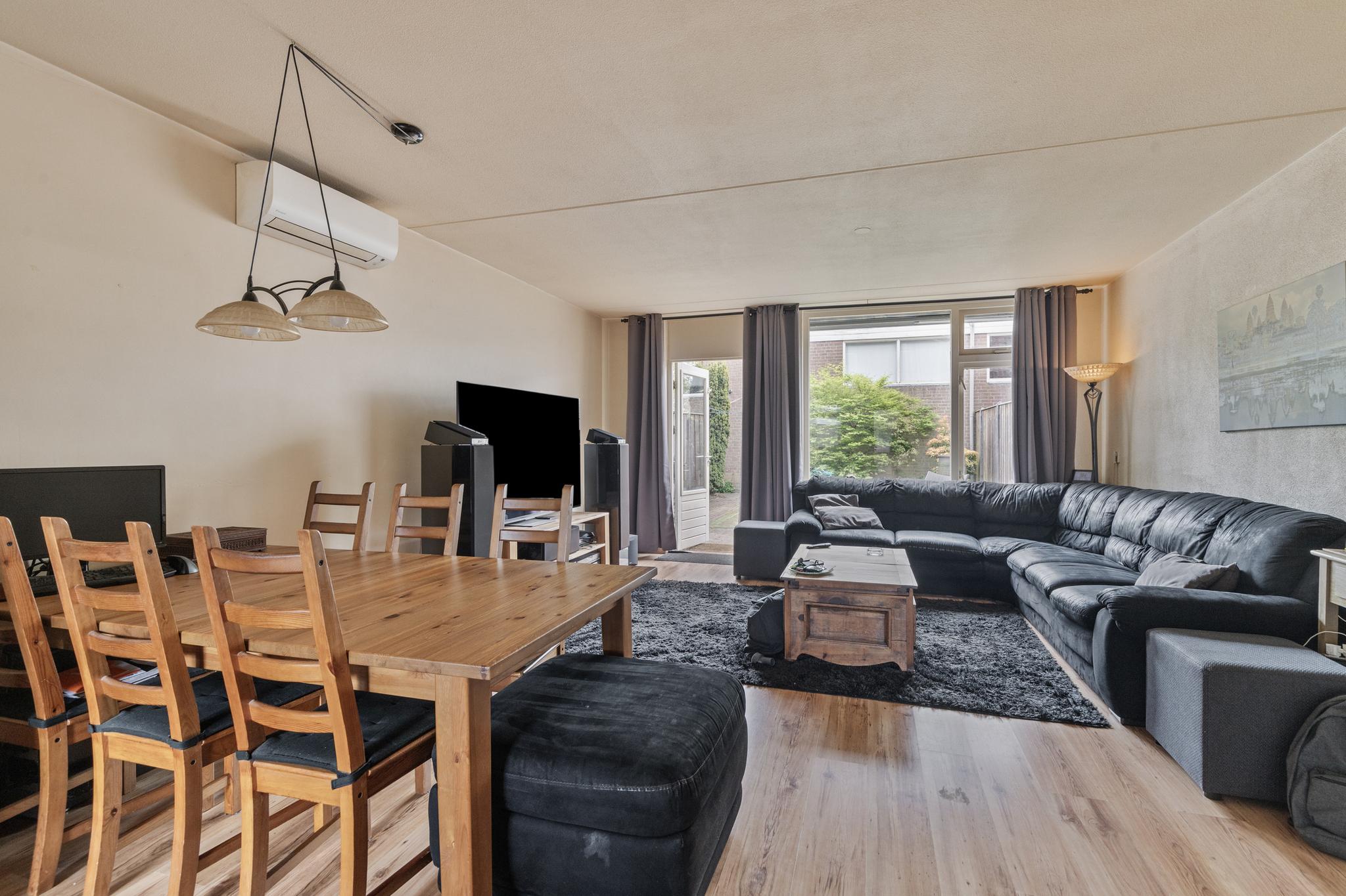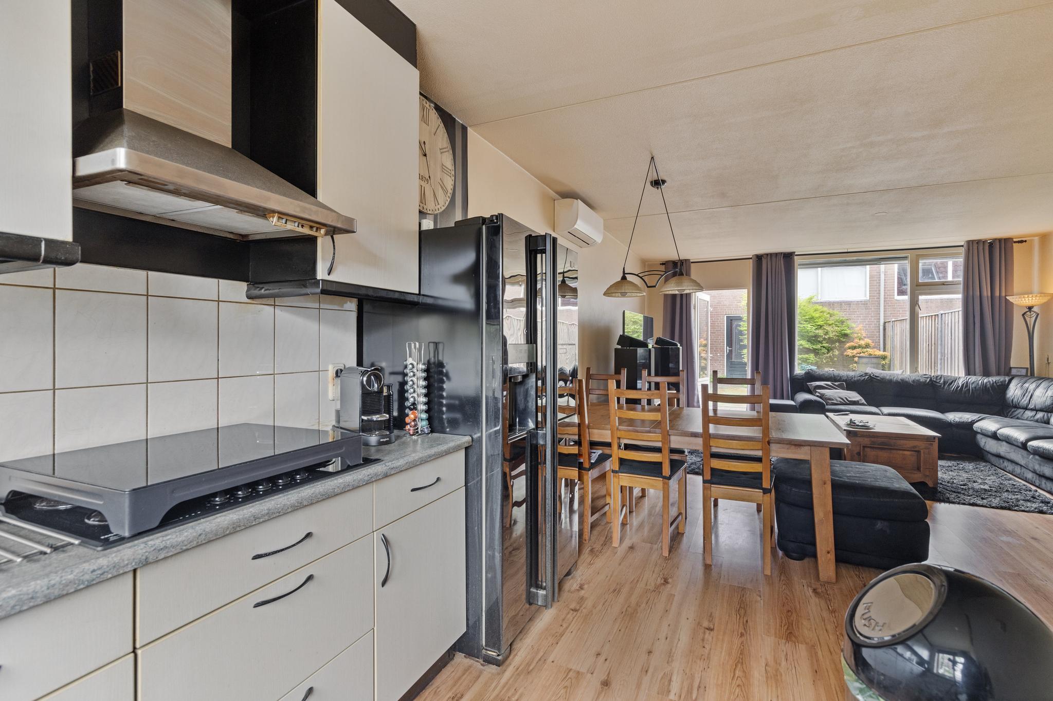 We betreden de woning via de voordeur en komen binnen in de entreehal. Vanuit hier heb je toegang tot de meterkast, het toilet, de trap naar boven en de woonkamer. De woonkamer is ruim en biedt genoeg plaats voor zowel een comfortabele zithoek als een grote eettafel. Dankzij de grote raampartijen is het een lichte, prettige ruimte om in te verblijven. Ook is er een airco aanwezig, wat bijdraagt aan het wooncomfort. Onder de trap bevindt zich een praktische trapkast, handig voor extra opbergruimte. Via de woonkamer loop je ook direct de tuin in. De open keuken aan de voorzijde is voorzien van inbouwapparatuur, zoals een vaatwasser en een koelkast. Tot slot is de begane grond voorzien van vloerverwarming.
