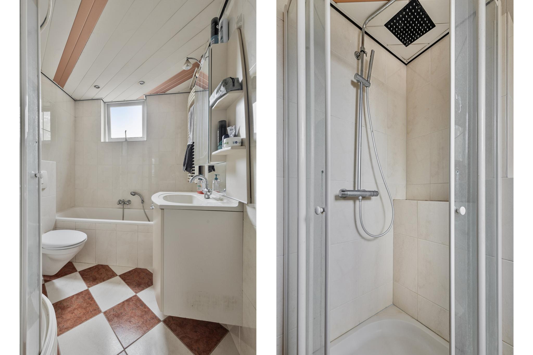 Via de trap in de entreehal komen we op de overloop van de eerste verdieping. Hier bevinden zich drie slaapkamers en de badkamer. De hoofdslaapkamer aan de achterzijde is ruim en biedt voldoende plek voor een tweepersoonsbed en een kledingkast. Dankzij het grote dakraam is de kamer bovendien heerlijk licht. Ook de slaapkamer aan de voorzijde is ruim genoeg voor een tweepersoonsbed. De derde slaapkamer is wat kleiner en daarmee perfect als kinderkamer, thuiskantoor of inloopkast. De nette badkamer beschikt over een douche, toilet, wastafel met meubel én een ligbad.