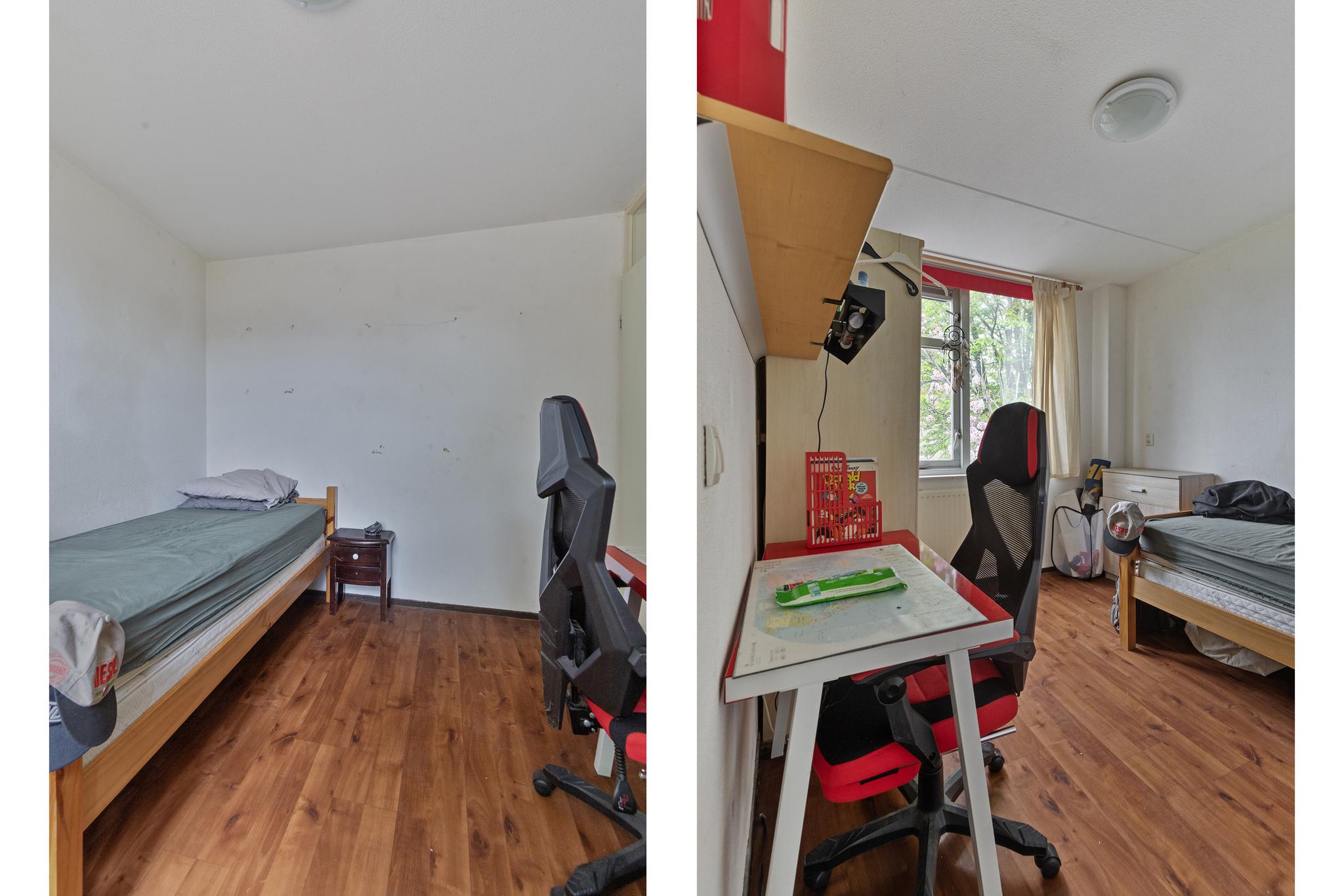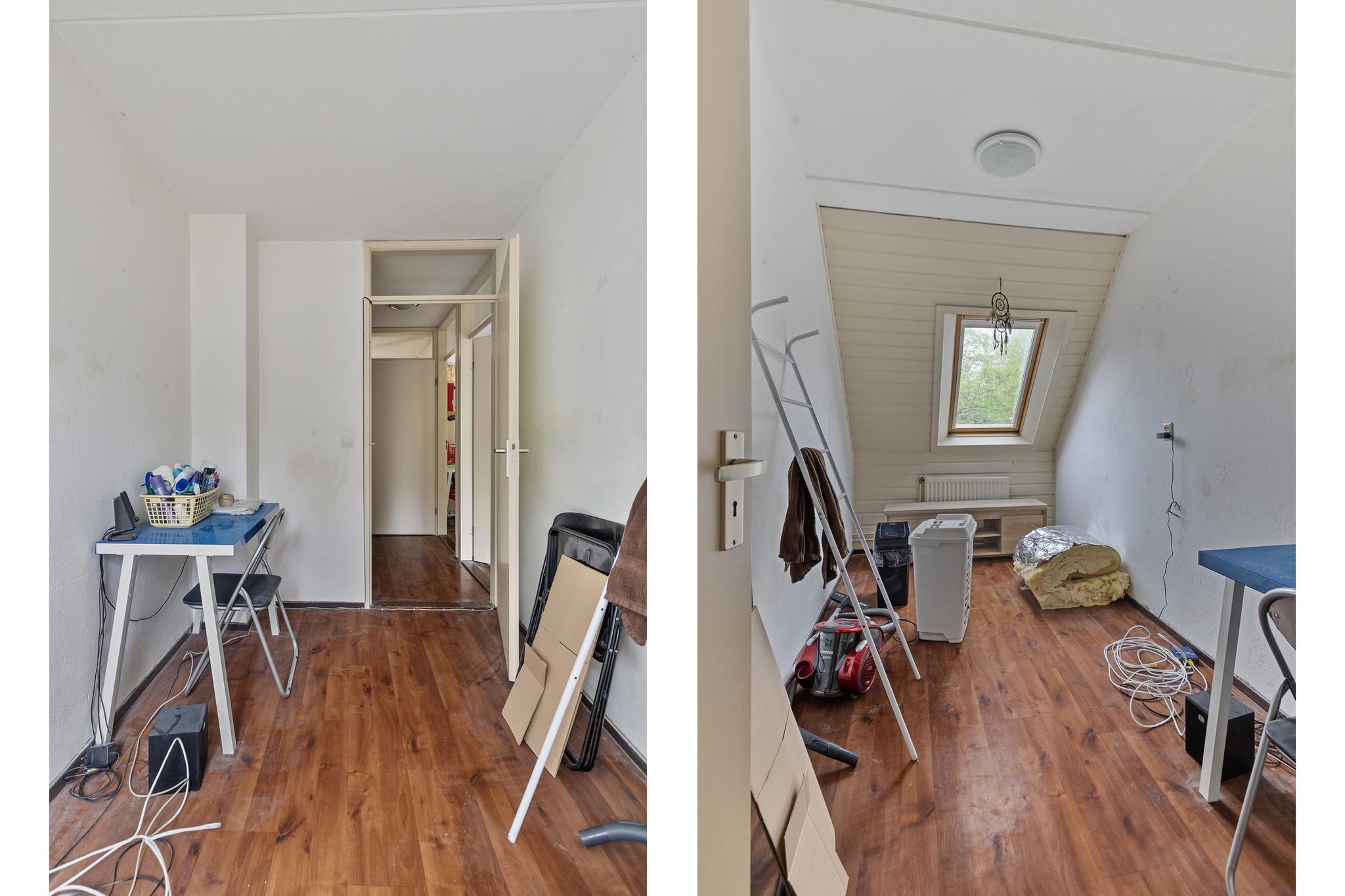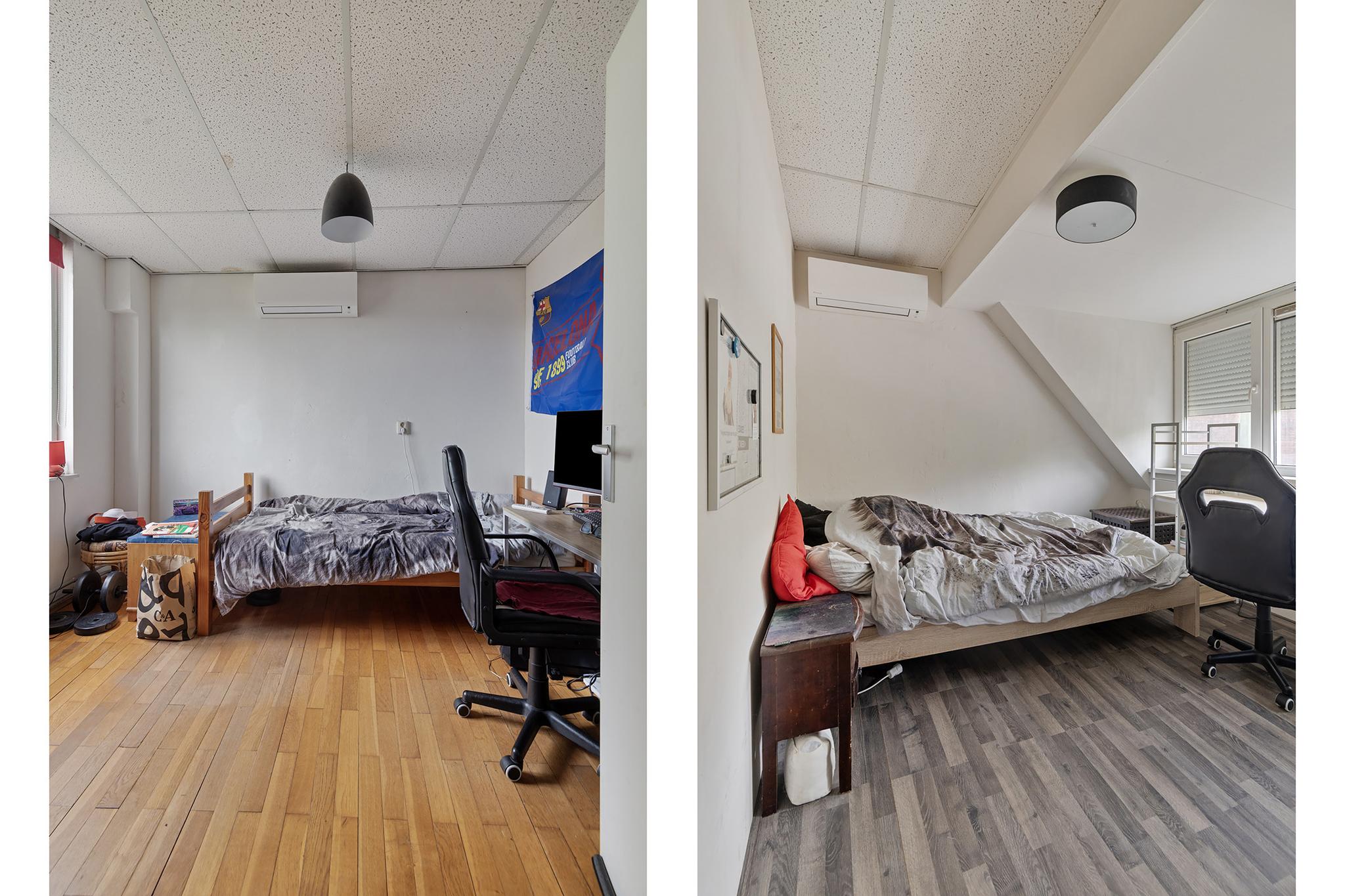 De tweede verdieping is bereikbaar via een vaste trap. Hier vinden we nog twee ruime slaapkamers, beide voorzien van airconditioning voor extra comfort tijdens warme dagen. De kamers zijn groot genoeg voor een tweepersoonsbed, bureau en kledingkast. De slaapkamer aan de achterzijde is extra ruim dankzij een dakkapel, wat ook zorgt voor extra lichtinval. Daarnaast is er op deze verdieping ruimte voor de wasmachine, droger en de opstelplaats van de CV-ketel.