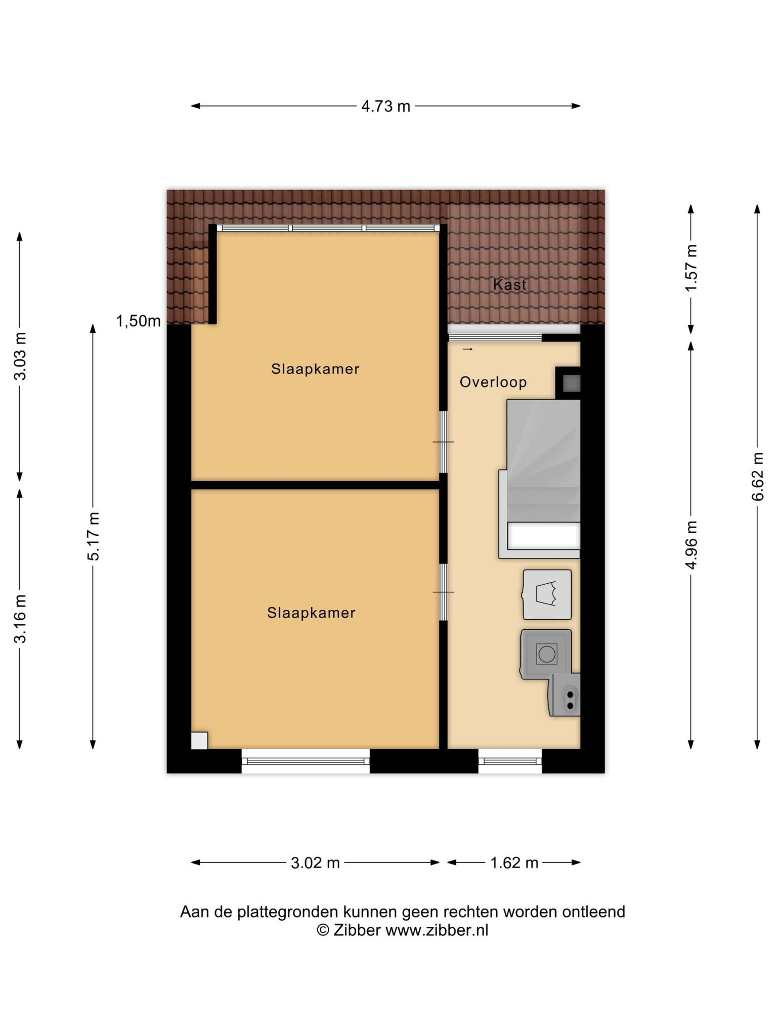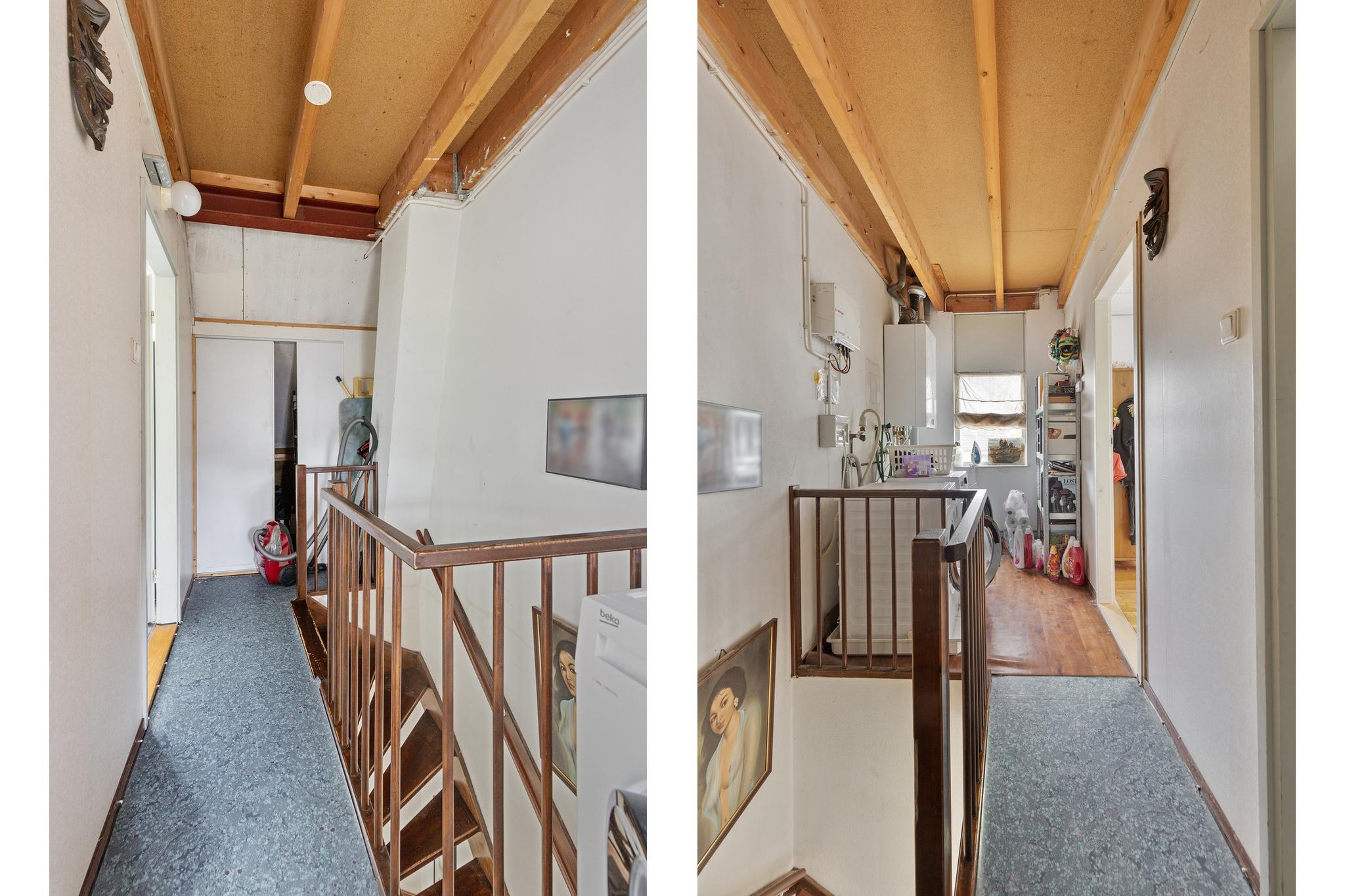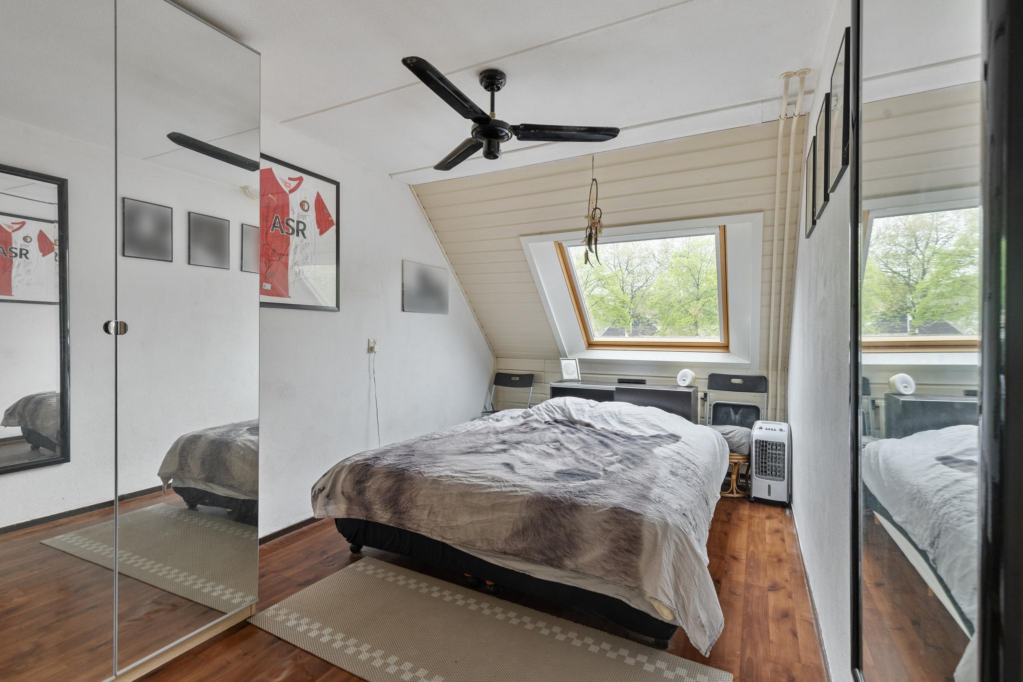 De tweede verdieping is bereikbaar via een vaste trap. Hier vinden we nog twee ruime slaapkamers, beide voorzien van airconditioning voor extra comfort tijdens warme dagen. De kamers zijn groot genoeg voor een tweepersoonsbed, bureau en kledingkast. De slaapkamer aan de achterzijde is extra ruim dankzij een dakkapel, wat ook zorgt voor extra lichtinval. Daarnaast is er op deze verdieping ruimte voor de wasmachine, droger en de opstelplaats van de CV-ketel.