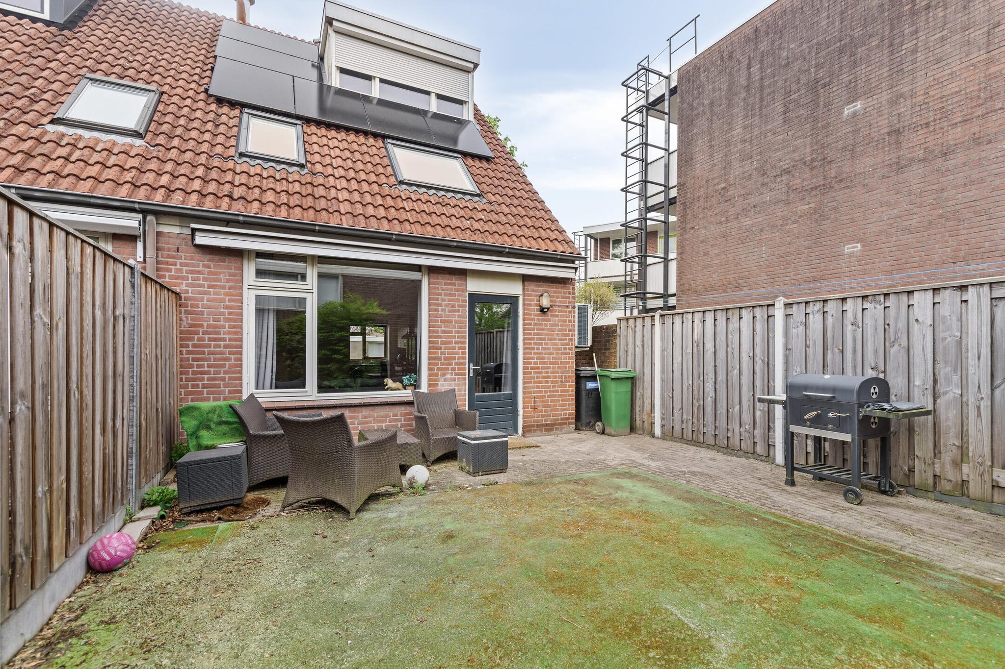 De achtertuin is heerlijk ruim en gunstig gelegen op het zuiden, wat betekent dat je hier de hele dag van de zon kunt genieten. Er is voldoende ruimte voor zitplekken of een speelplek voor de kinderen. De tuin beschikt ook over een achterom, wat handig is voor fietsen of tuinaccessoires. Een ideale plek voor lange zomeravonden en ontspannen momenten in de buitenlucht.