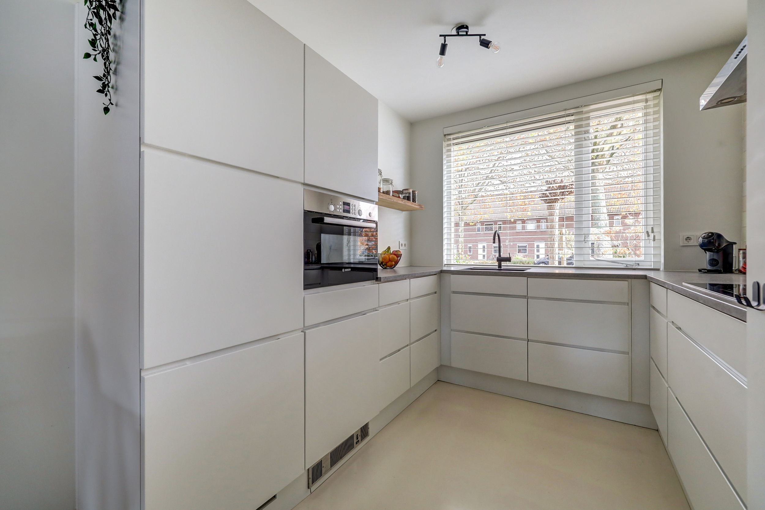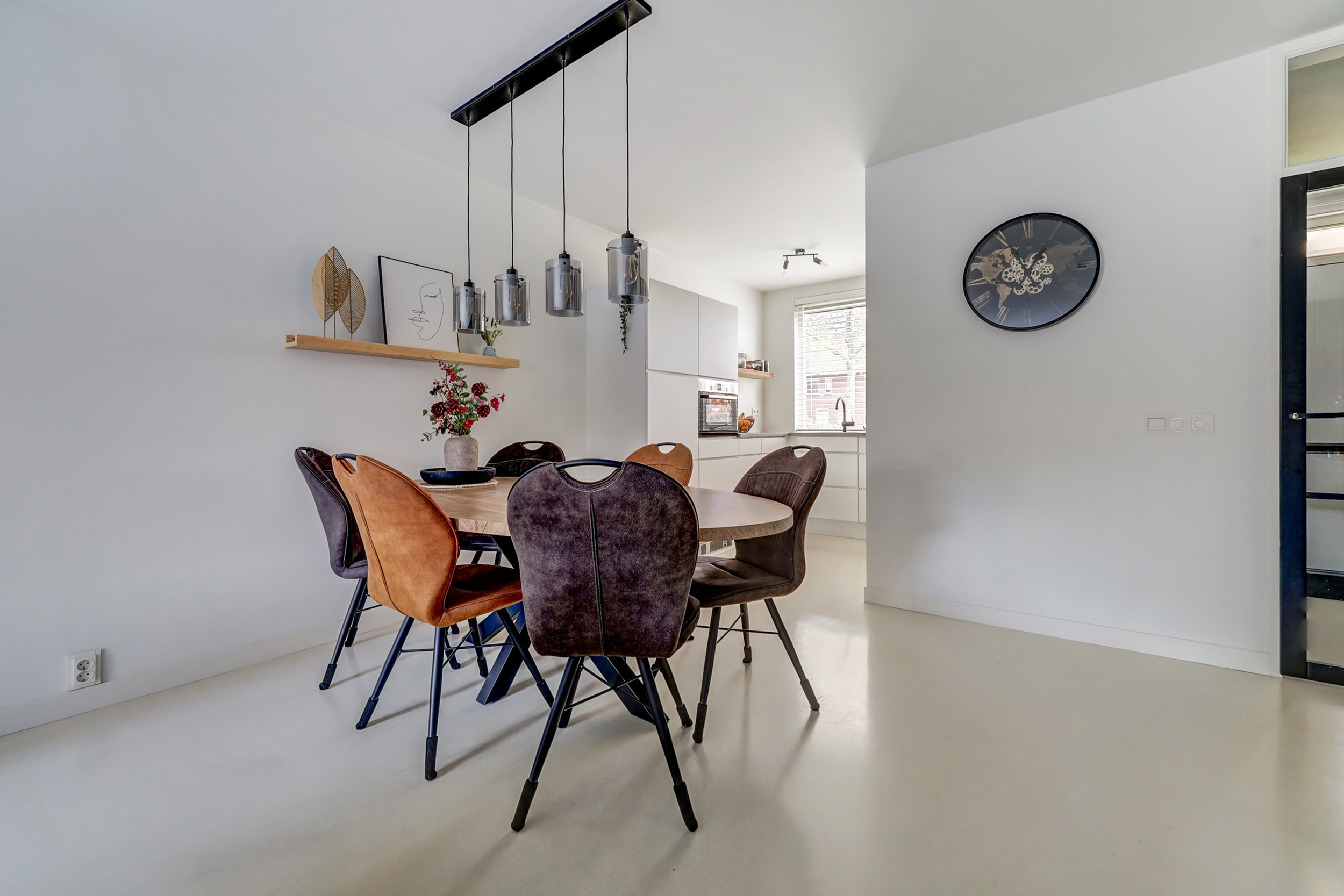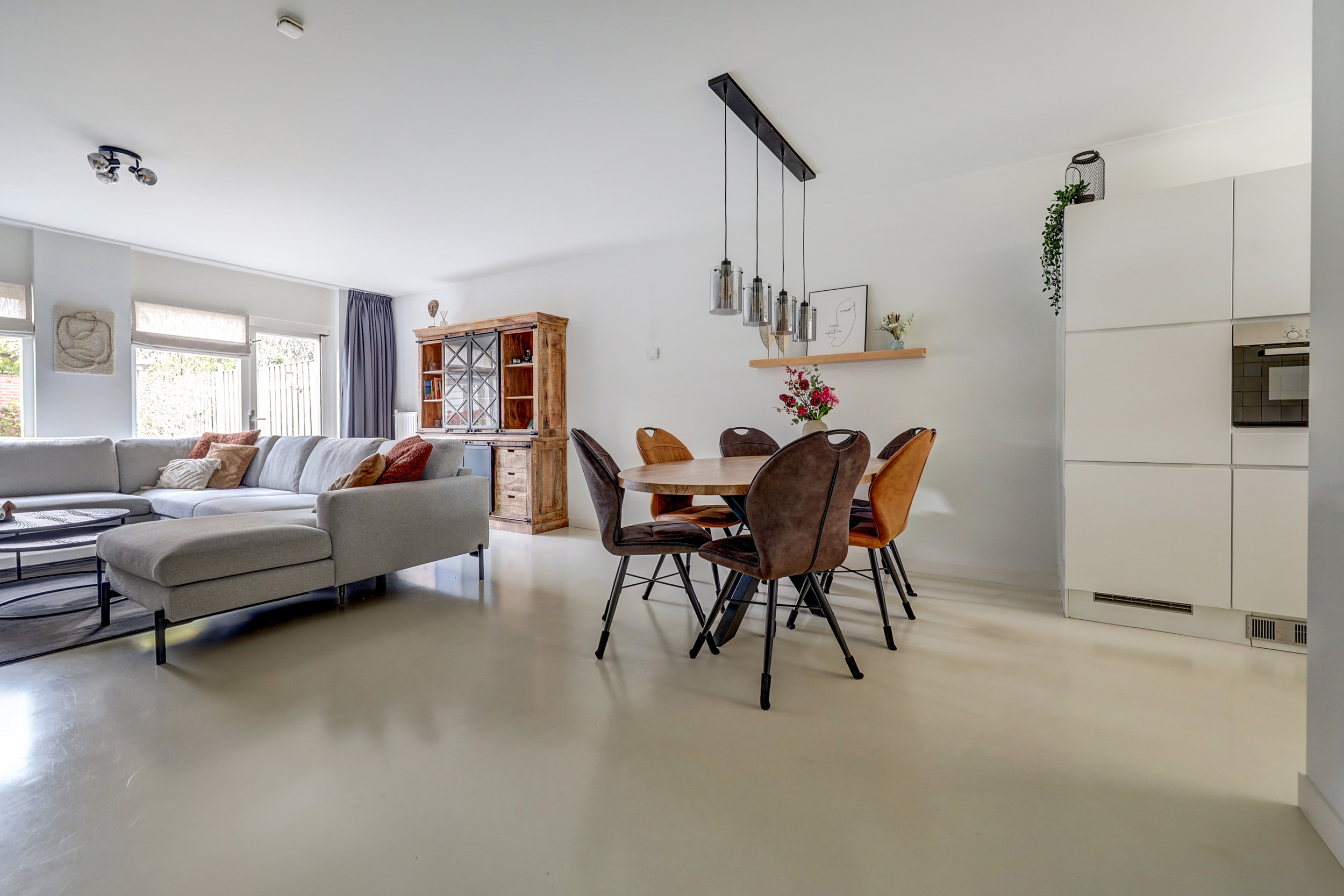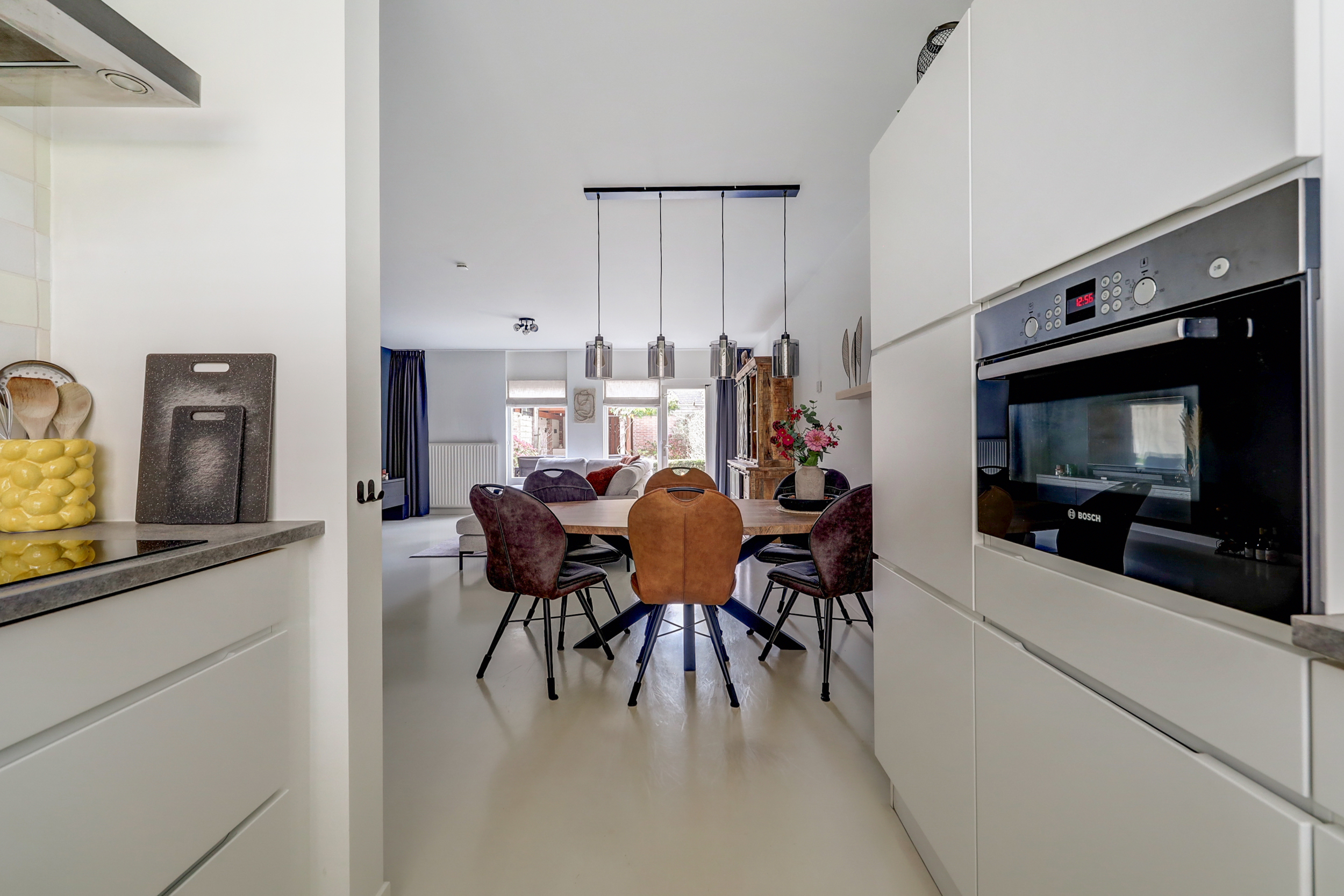 Bij binnenkomst via de voordeur stap je in een ruime entreehal met toegang tot de meterkast, het toilet en de woonkamer. De woonkamer is heerlijk licht dankzij de grote raampartijen en de lichte vloerafwerking. Er is voldoende plek voor een gezellige zithoek en een royale eettafel. Een praktische trapkast biedt extra bergruimte en via een deur bereik je de achtertuin. Aangrenzend aan de woonkamer bevindt zich de keuken. Deze keuken is voorzien van diverse inbouwapparatuur, waaronder een elektrische kookplaats, combi-oven, vaatwasser, koelkast en vriezer.