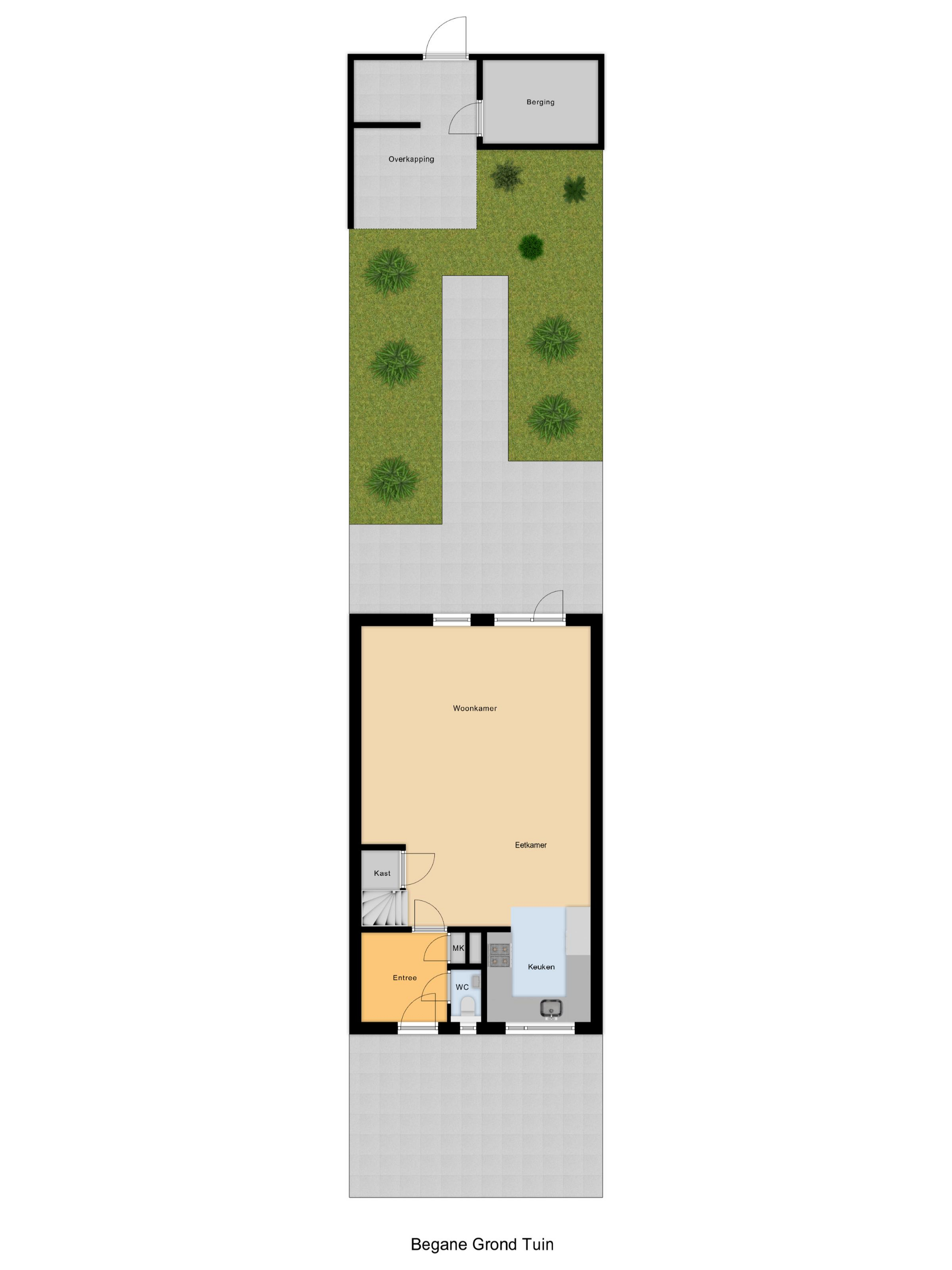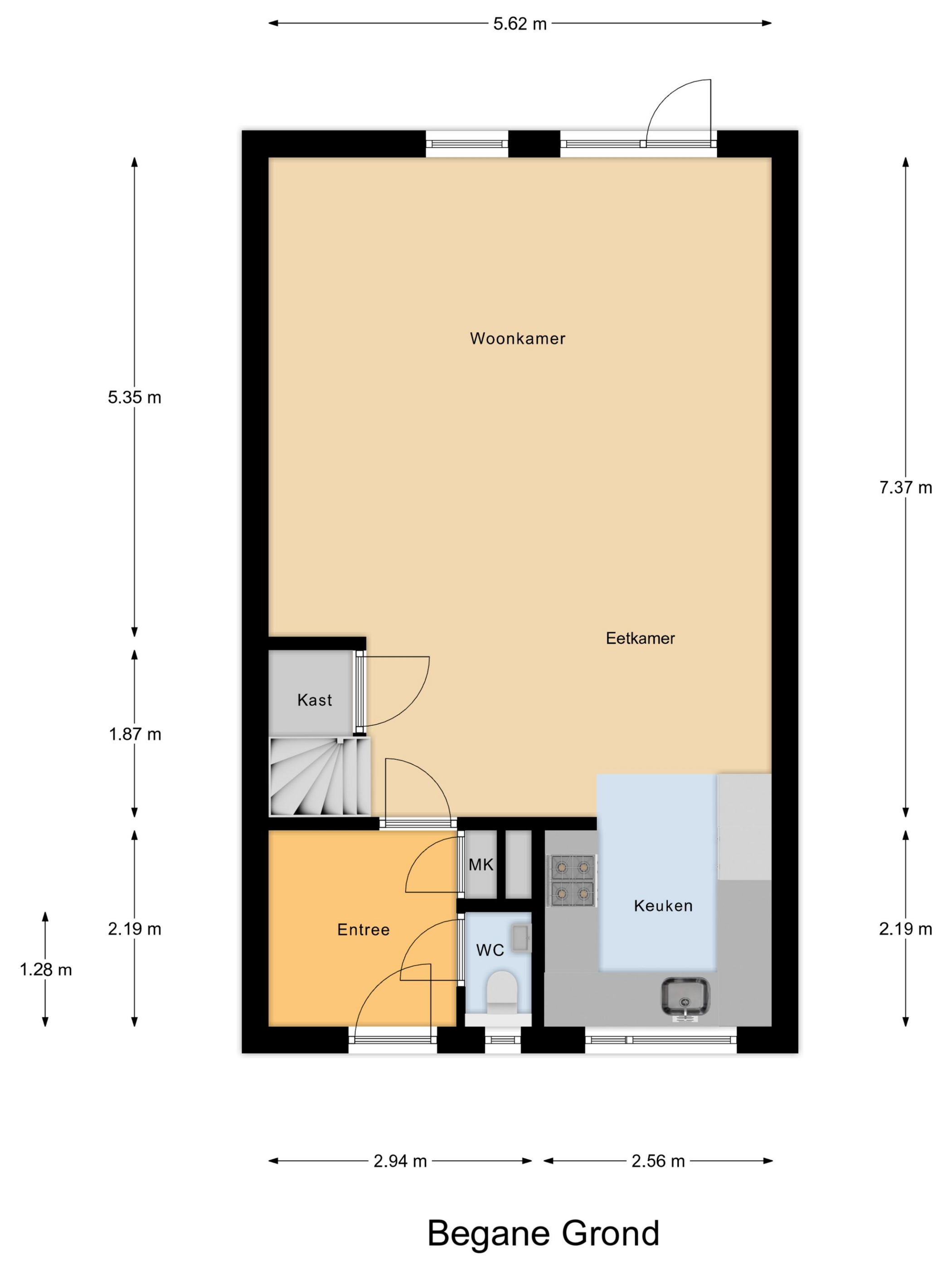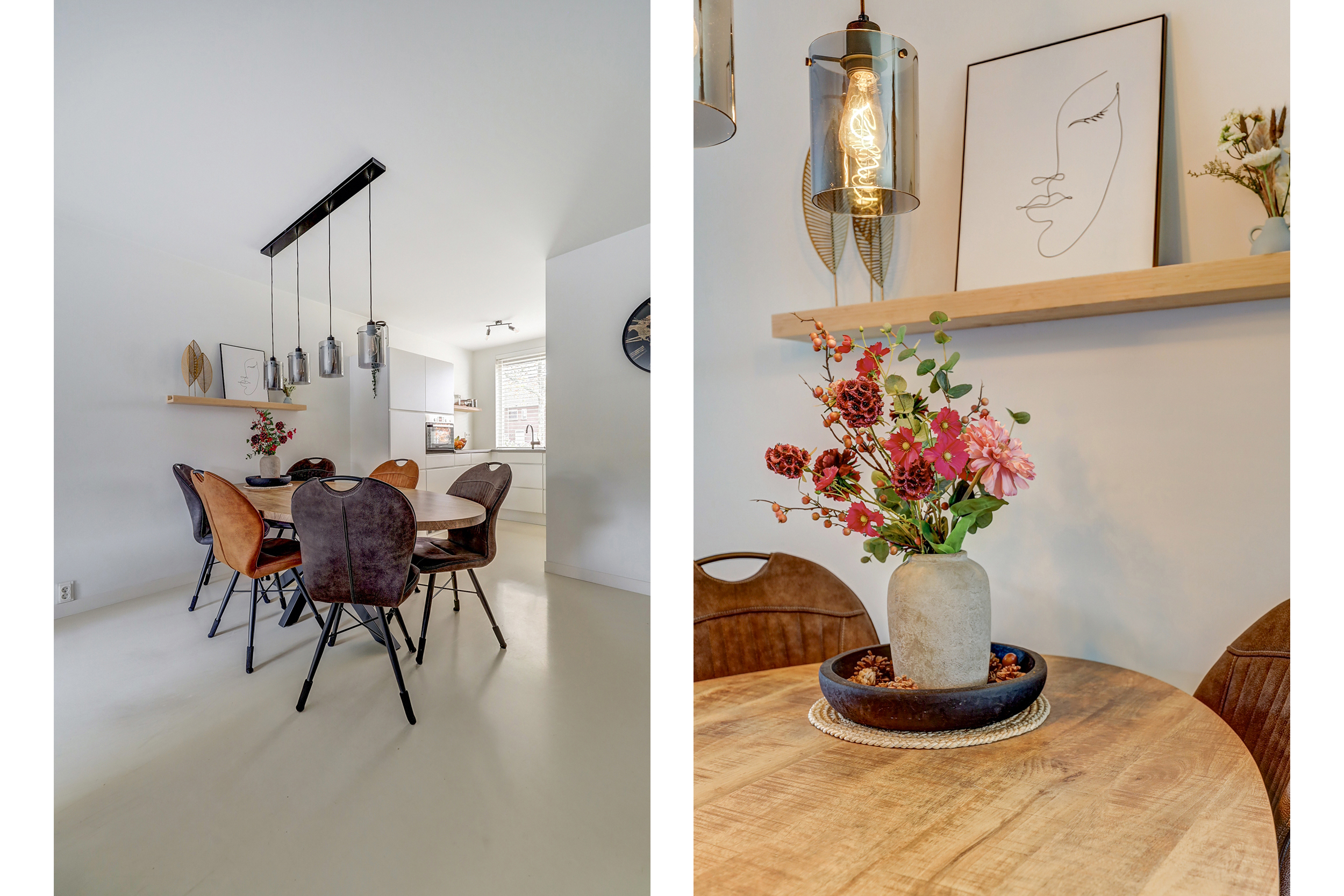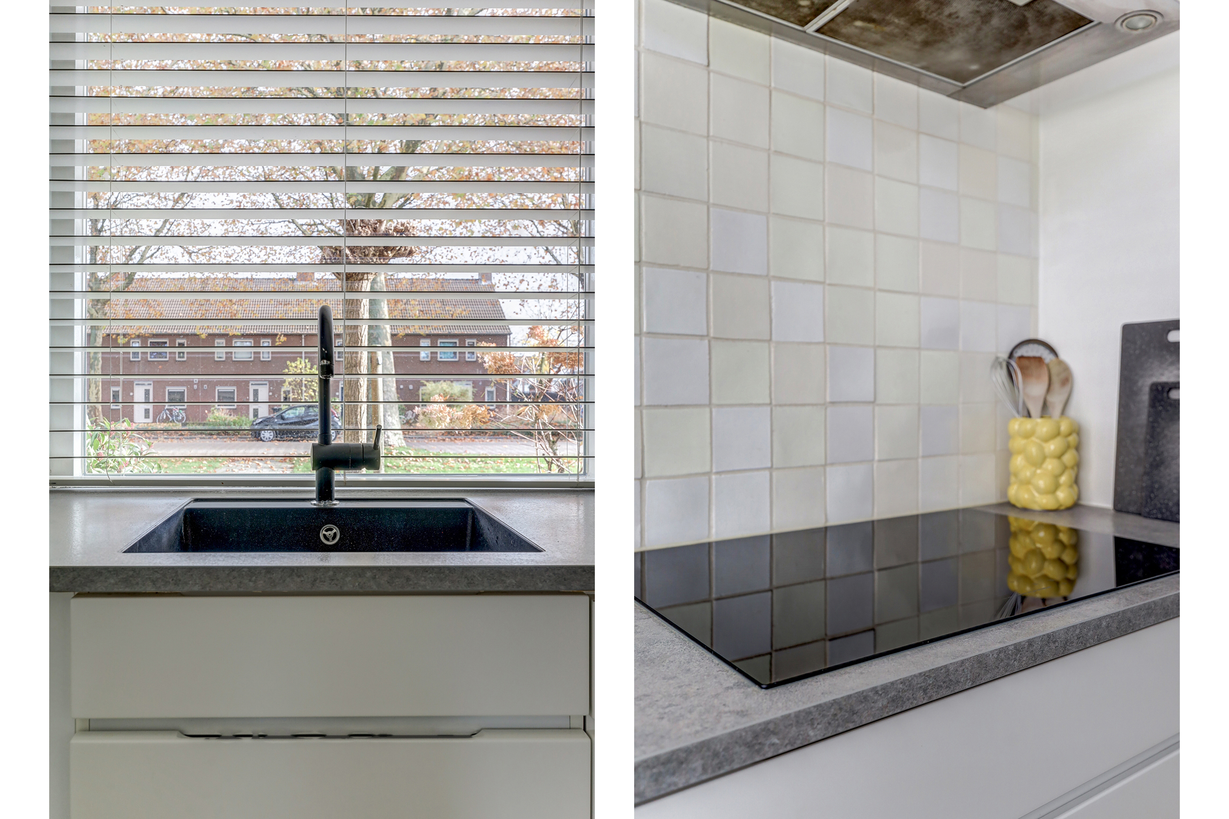 Bij binnenkomst via de voordeur stap je in een ruime entreehal met toegang tot de meterkast, het toilet en de woonkamer. De woonkamer is heerlijk licht dankzij de grote raampartijen en de lichte vloerafwerking. Er is voldoende plek voor een gezellige zithoek en een royale eettafel. Een praktische trapkast biedt extra bergruimte en via een deur bereik je de achtertuin. Aangrenzend aan de woonkamer bevindt zich de keuken. Deze keuken is voorzien van diverse inbouwapparatuur, waaronder een elektrische kookplaats, combi-oven, vaatwasser, koelkast en vriezer.