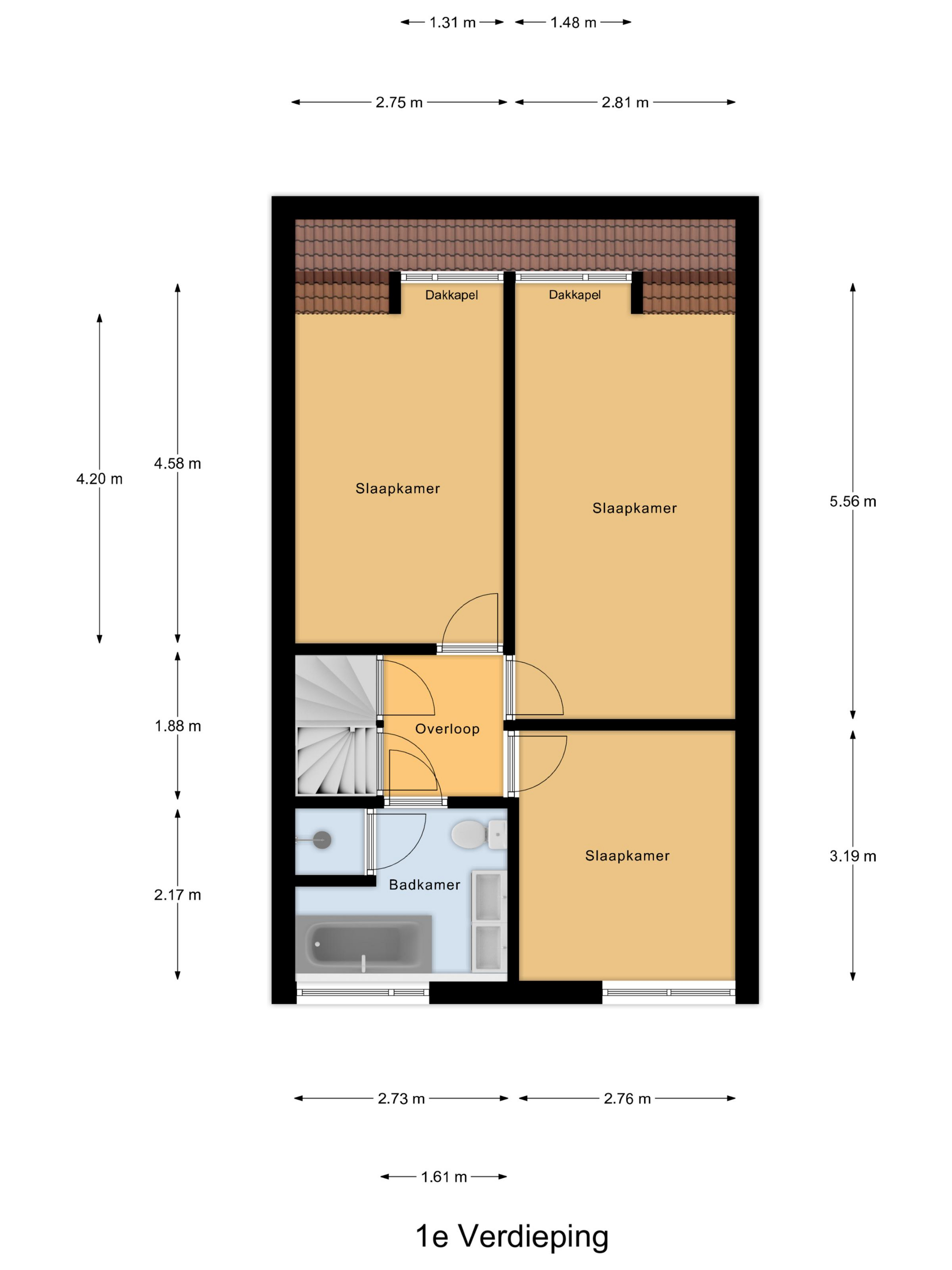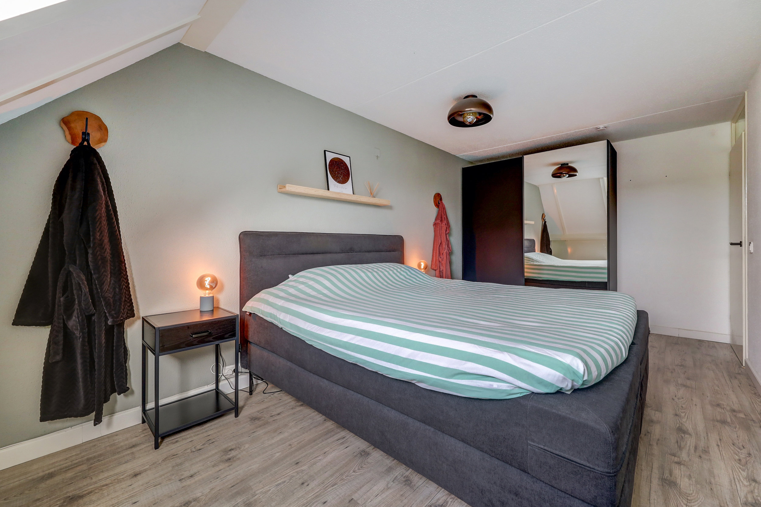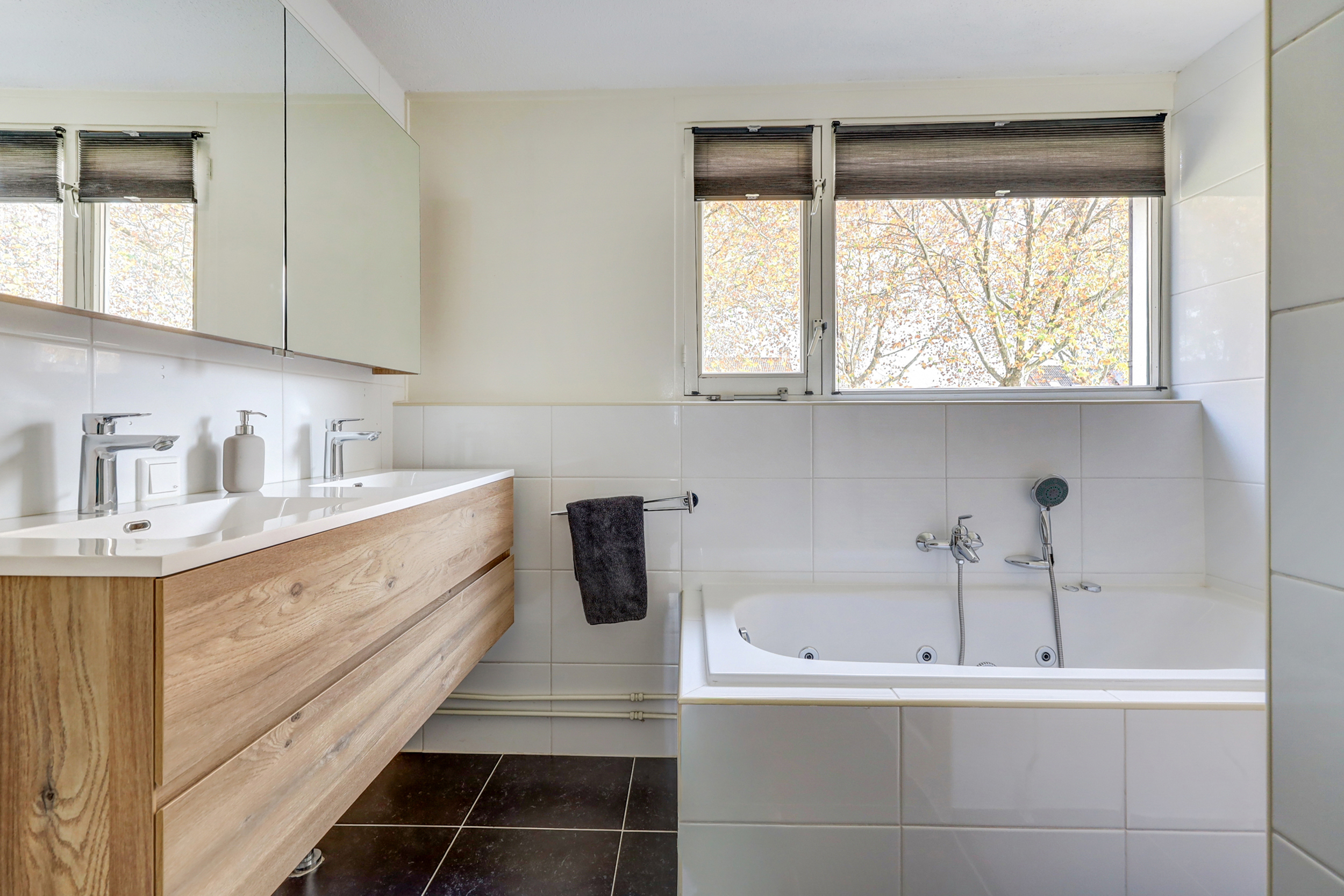 Via de trap in de woonkamer bereik je de eerste verdieping, waar je uitkomt op de overloop met toegang tot drie royale slaapkamers en de badkamer. De hoofdslaapkamer biedt genoeg ruimte voor een tweepersoonsbed en een grote kledingkast, en dankzij de dakkapel is hier extra leefruimte ontstaan. De andere twee slaapkamers zijn uitstekend geschikt als kinderkamer. Ook een tweepersoonsbed en bureau passen hier moeiteloos. De badkamer is volledig uitgerust met een toilet, douche, dubbele wastafel met meubel en een whirlpool.