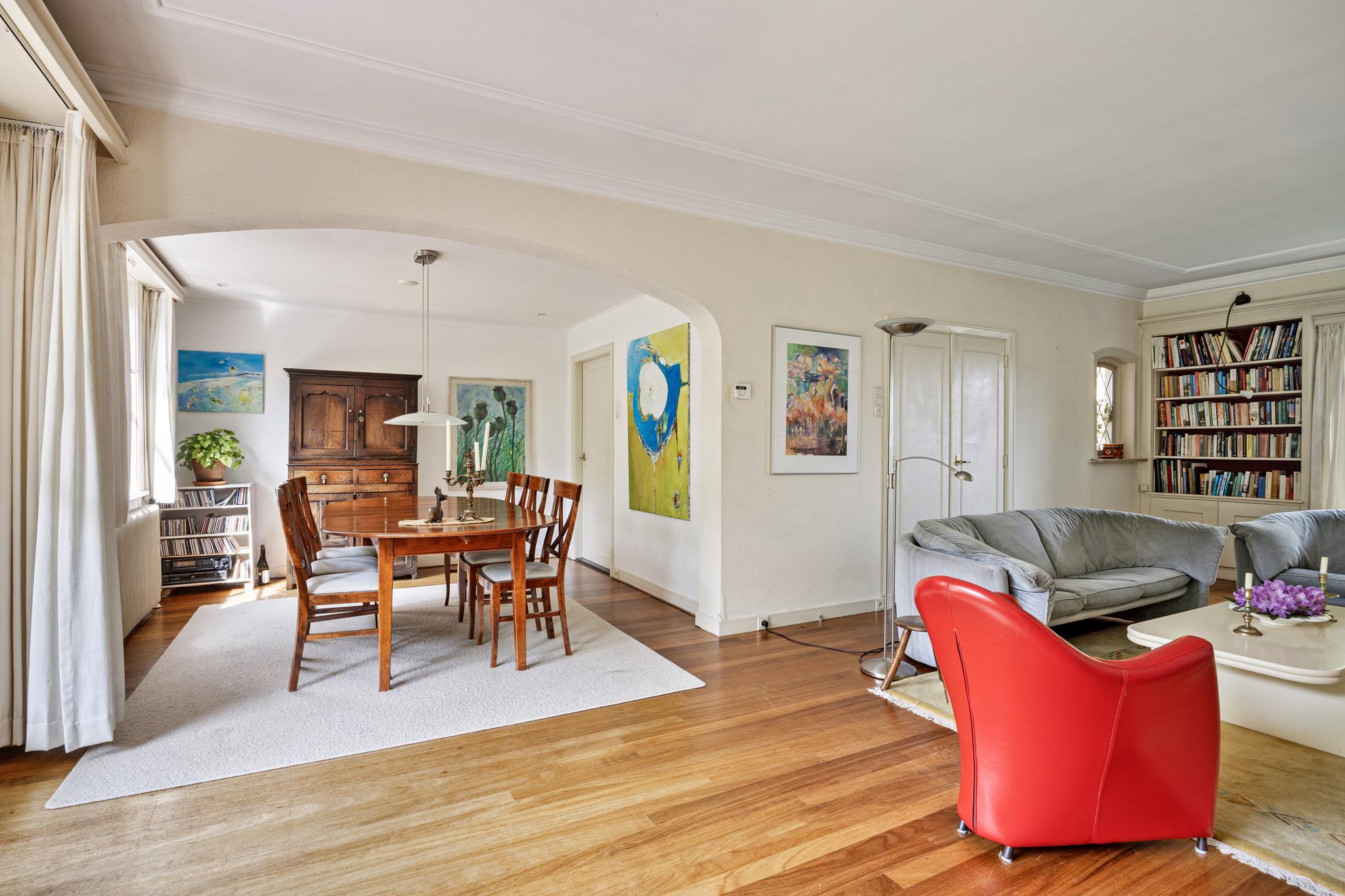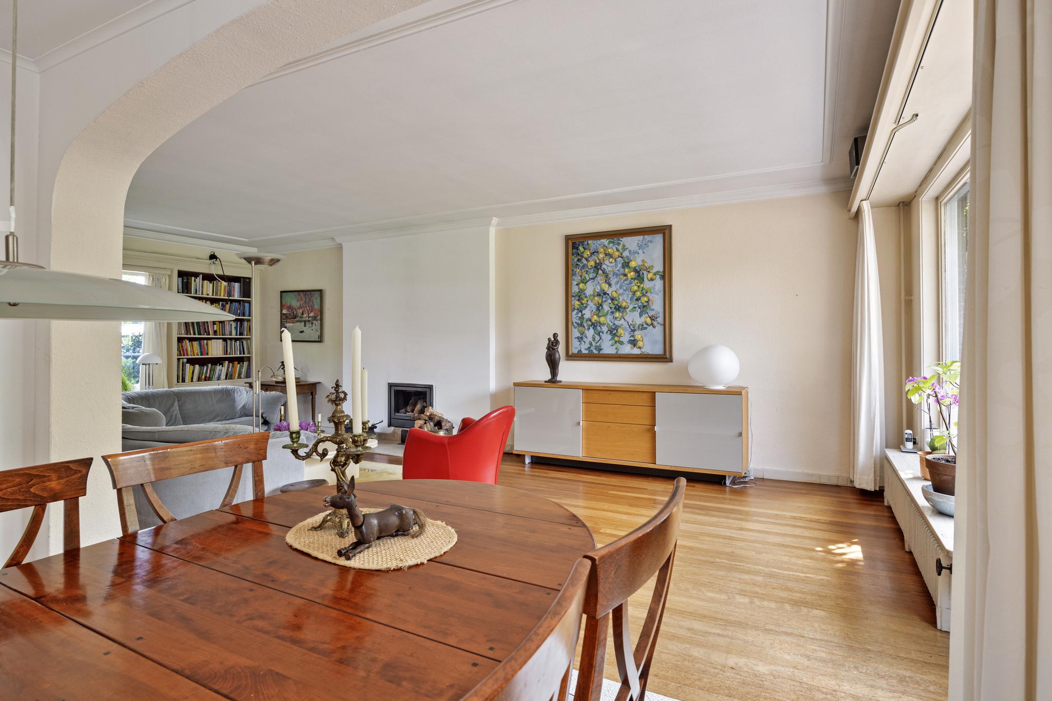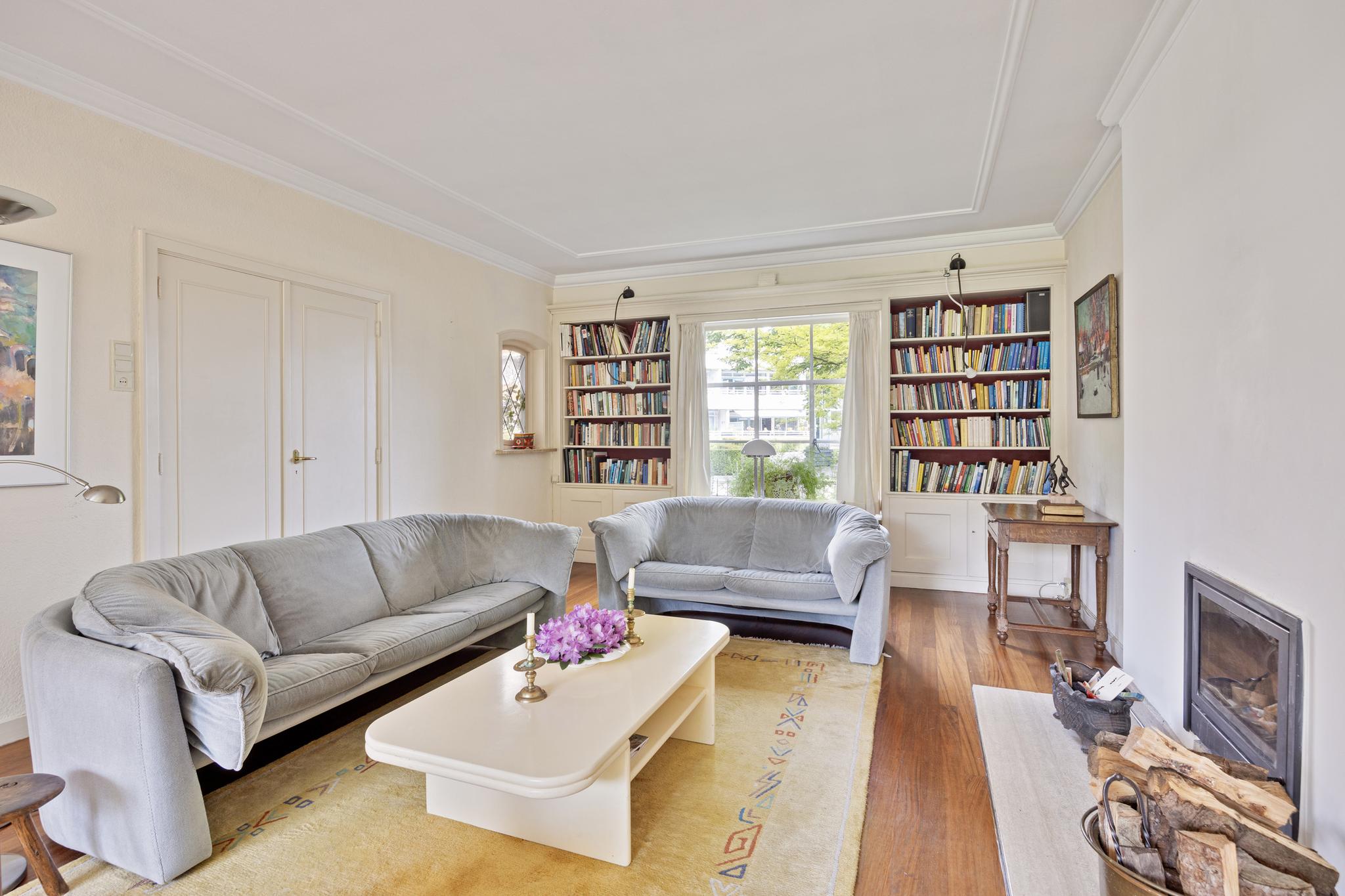 Woonkamer - living, riante lichte ruimte door de hoge ramen en plafonds. Deze ruimte is net afgewerkt met stucwerk wanden, dubbele deuren naar de hal, houten vloer en vaste boekenkasten aan de straatzijde. Er is een houthaard gecentreerd in de ruimte. Vanuit de woonkamer is er fraai uitzicht over de diepe achtertuin. De stalen ramen met openslaande deuren naar de tuin voegen daar nog wat extra's aan toe.