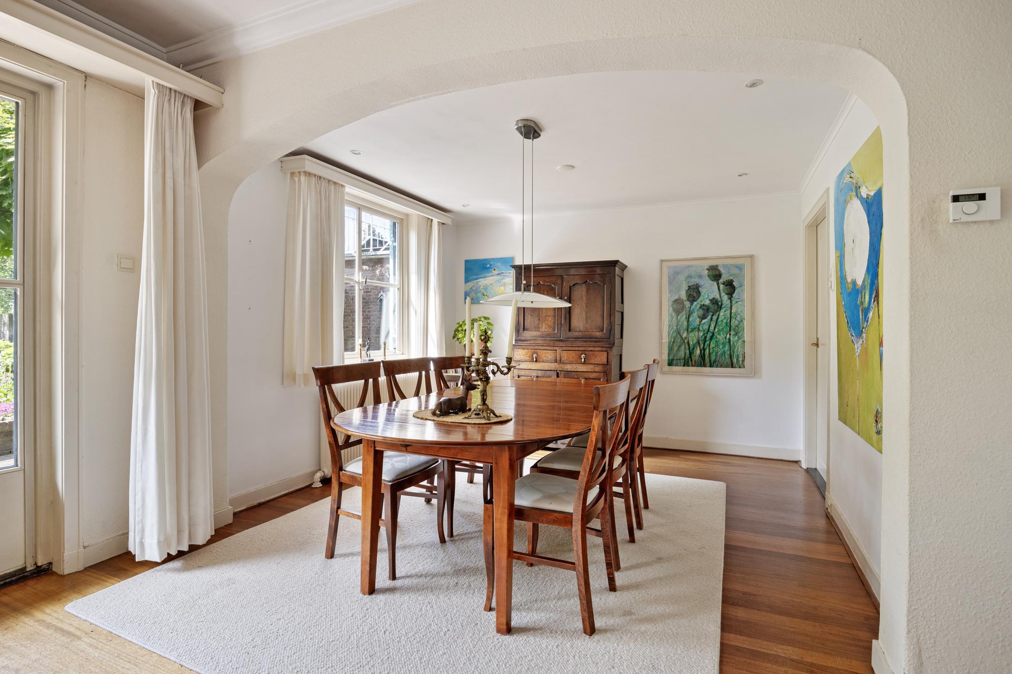 Eetkamer, deze staat in open verbinding met de living en is bereikbaar vanuit de hal. Er is voldoende ruimte voor een grote eettafel.