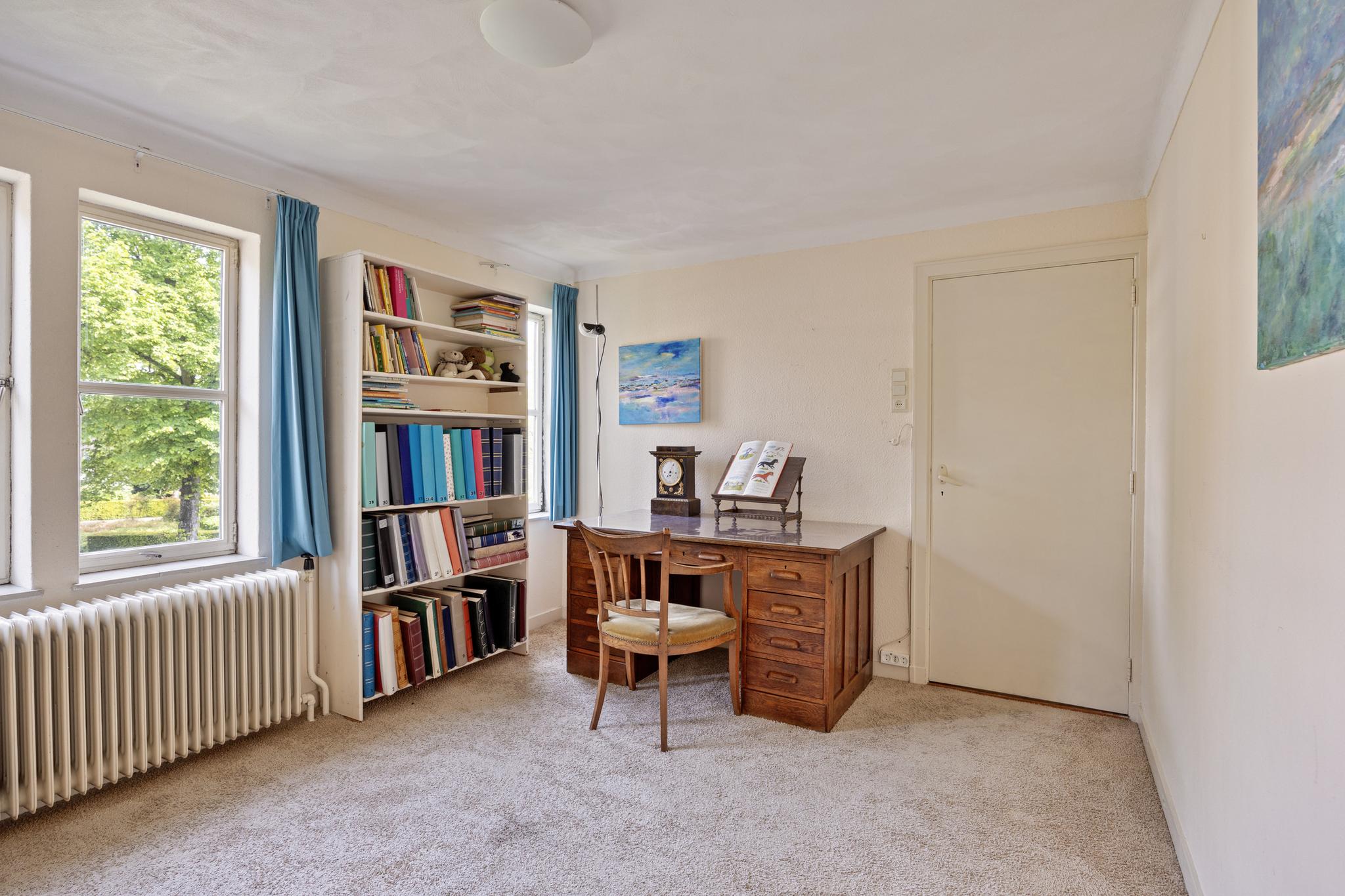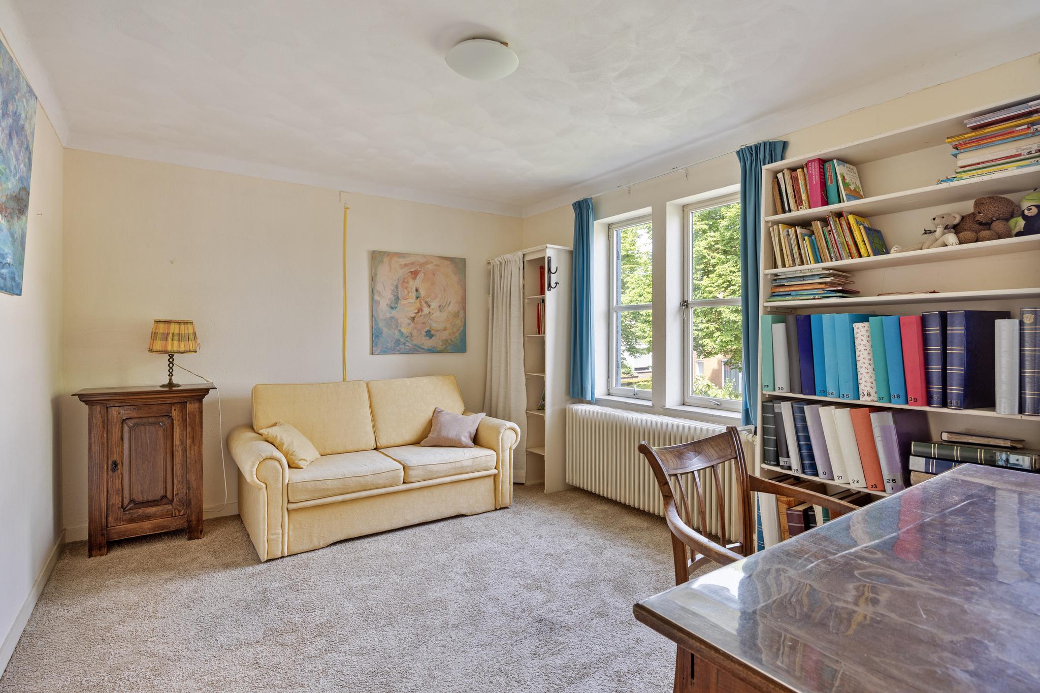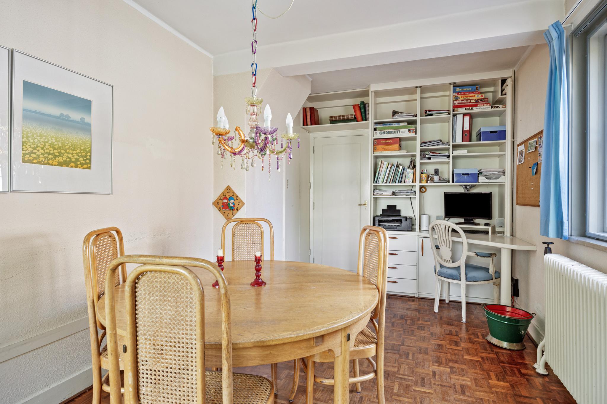 Kantoor/speelkamer, grote ruimte welke na de bouw eerst in gebruik is geweest als garage en later dus omgebouwd is naar een leefruimte. Deze kamer kan ook prima als eetruimte fungeren, daar de keuken direct op het kantoor aansluit. Aan de voorzijde is veel plaats voor een eettafel en zeer veel lichtinval door de grote raampartijen die kenmerkend zijn in dit huis.