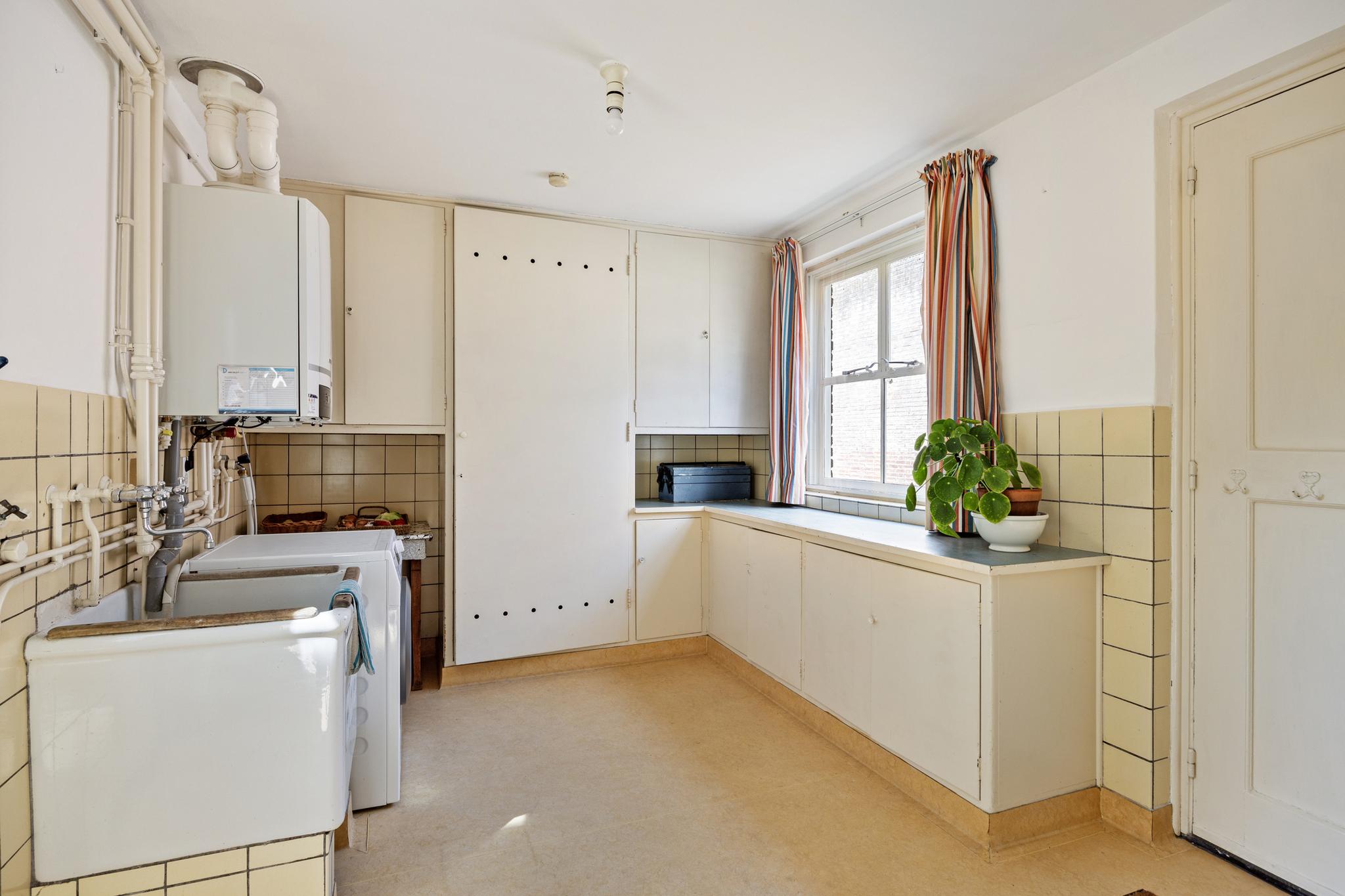 Bijkeuken, hier is een keukenblok gesitueerd samen met de wasmachine aansluitingen. Ook bevindt zich hier de opstelling van de cv-combiketel. Via de bijkeuken is zowel de tuin als de oprit toegankelijk.