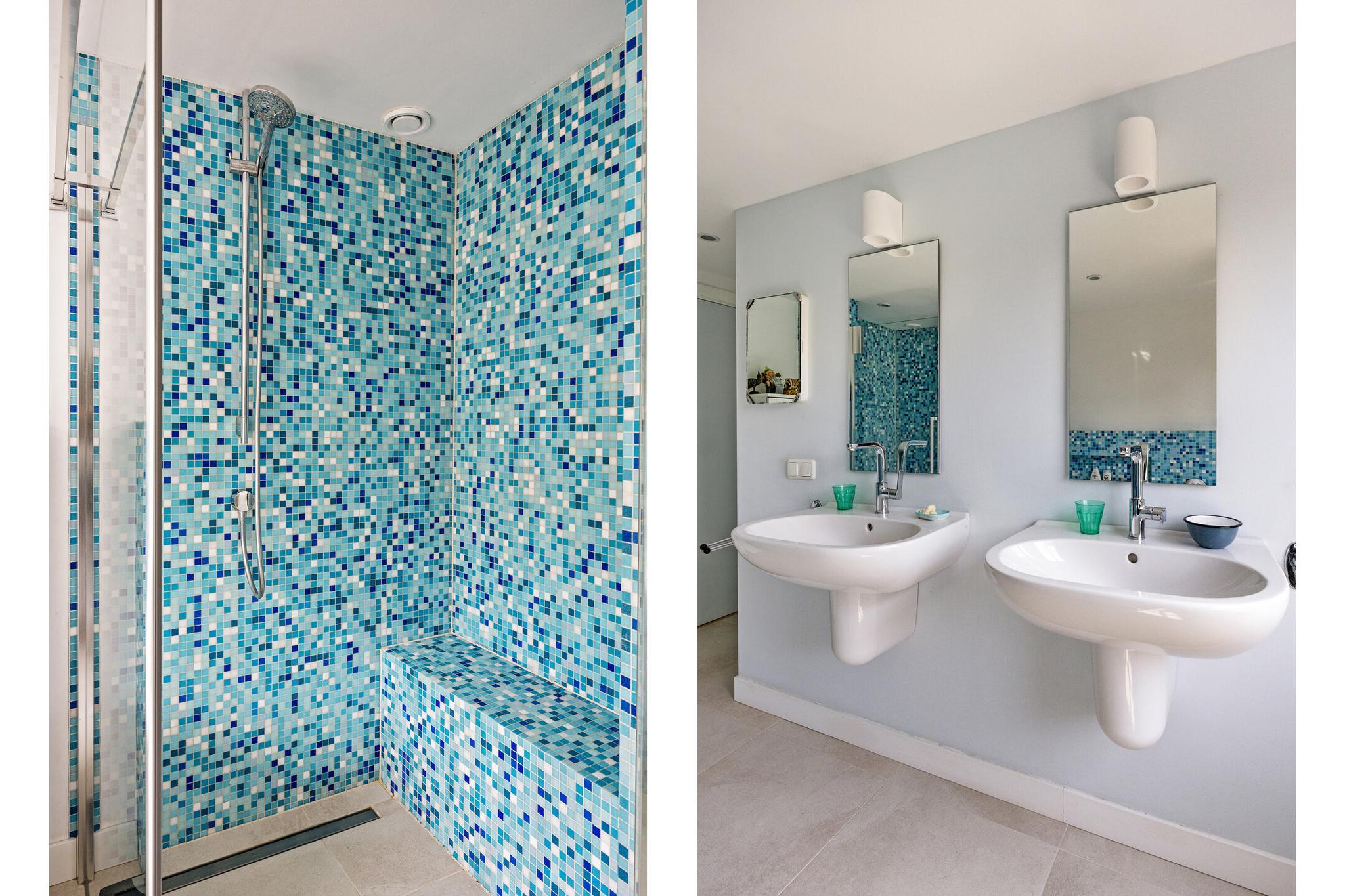 - Ligbad, toilet, dubbele wastafel en inloopdouche
