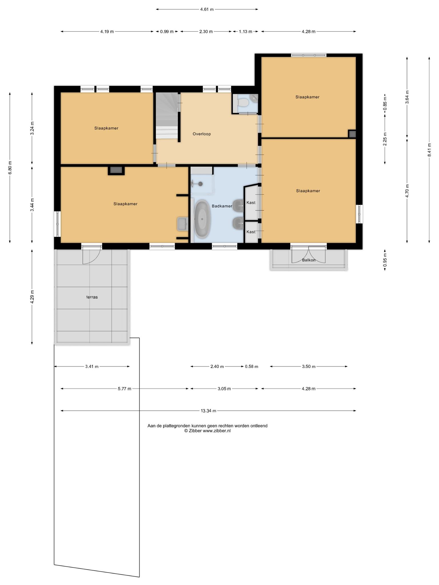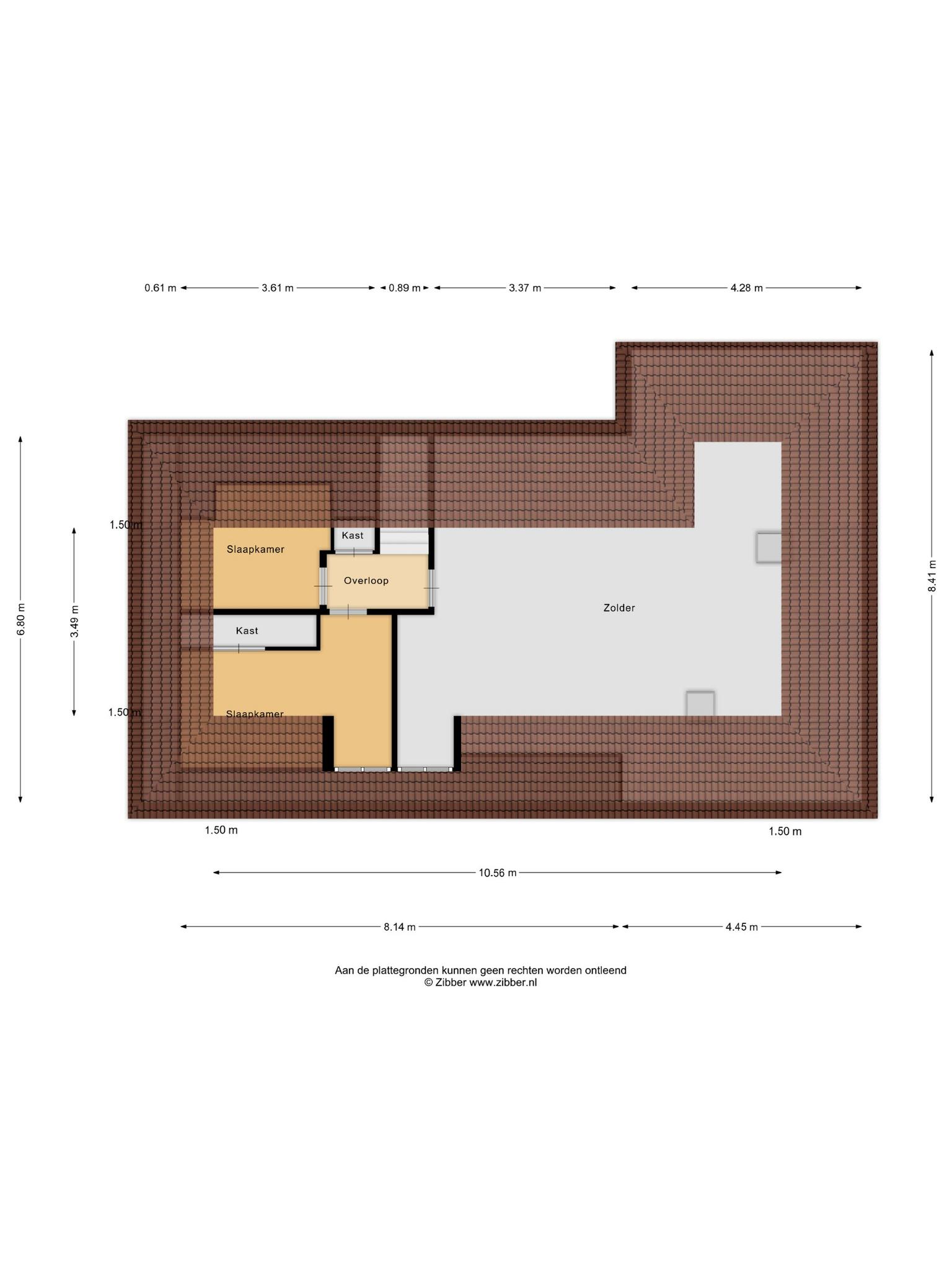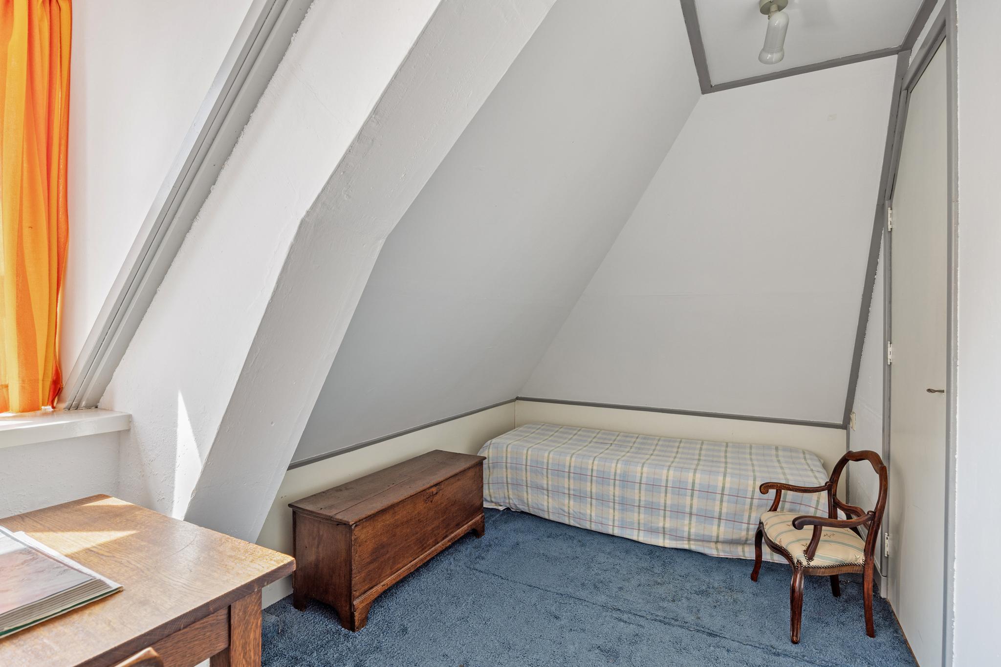 Op de zolder ligt één slaapkamer met een inbouwkast die kleiner is dan op de plattegrond (een deel van de ruimte daar is schoorsteen) en één op het overloopje. Naast de slaapkamer en het overloopje en de grote zolder is er nog een kleine 'bergkamer' (kleiner dan op de plattegrond)