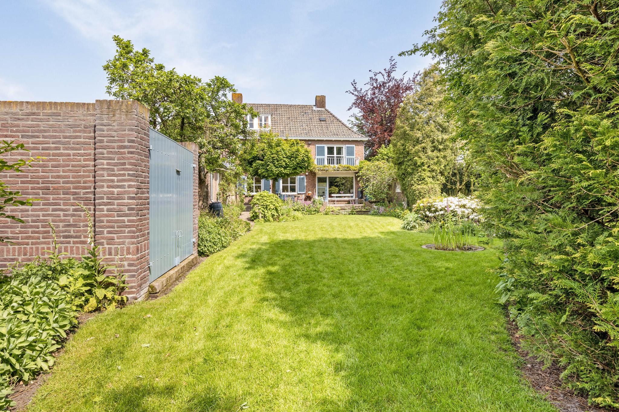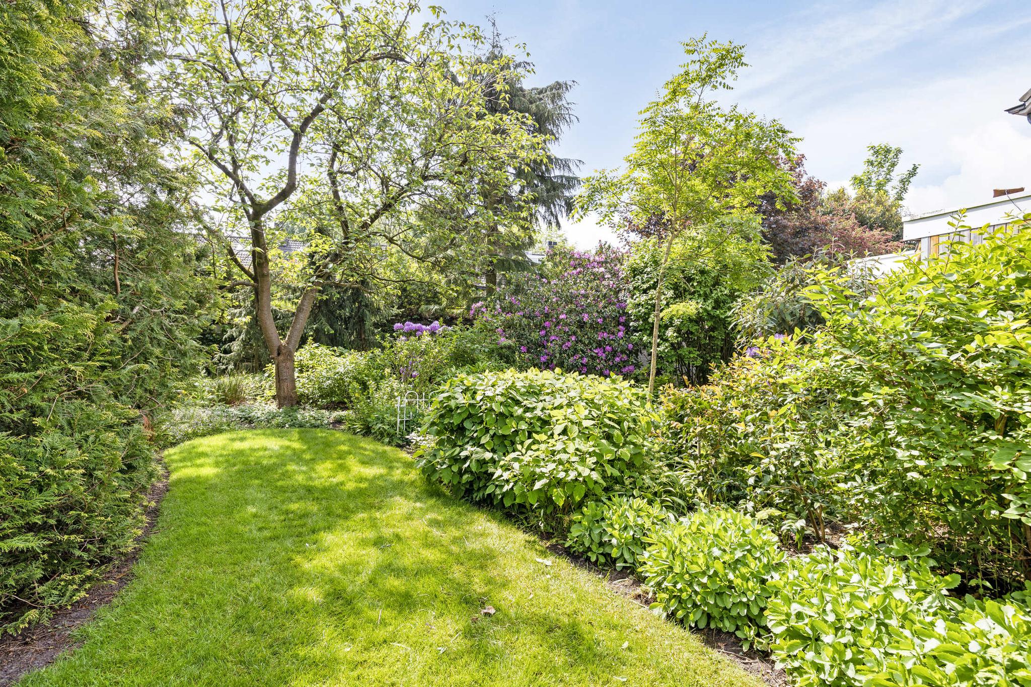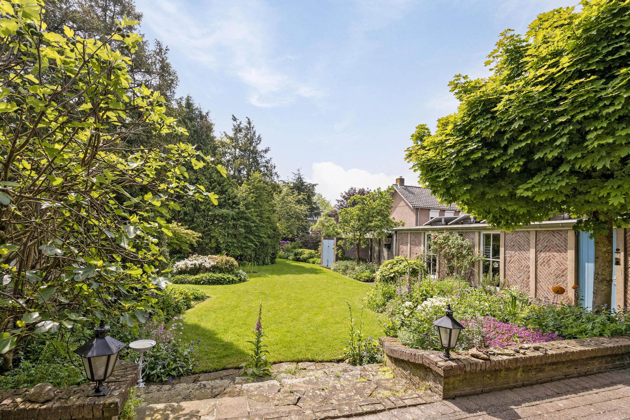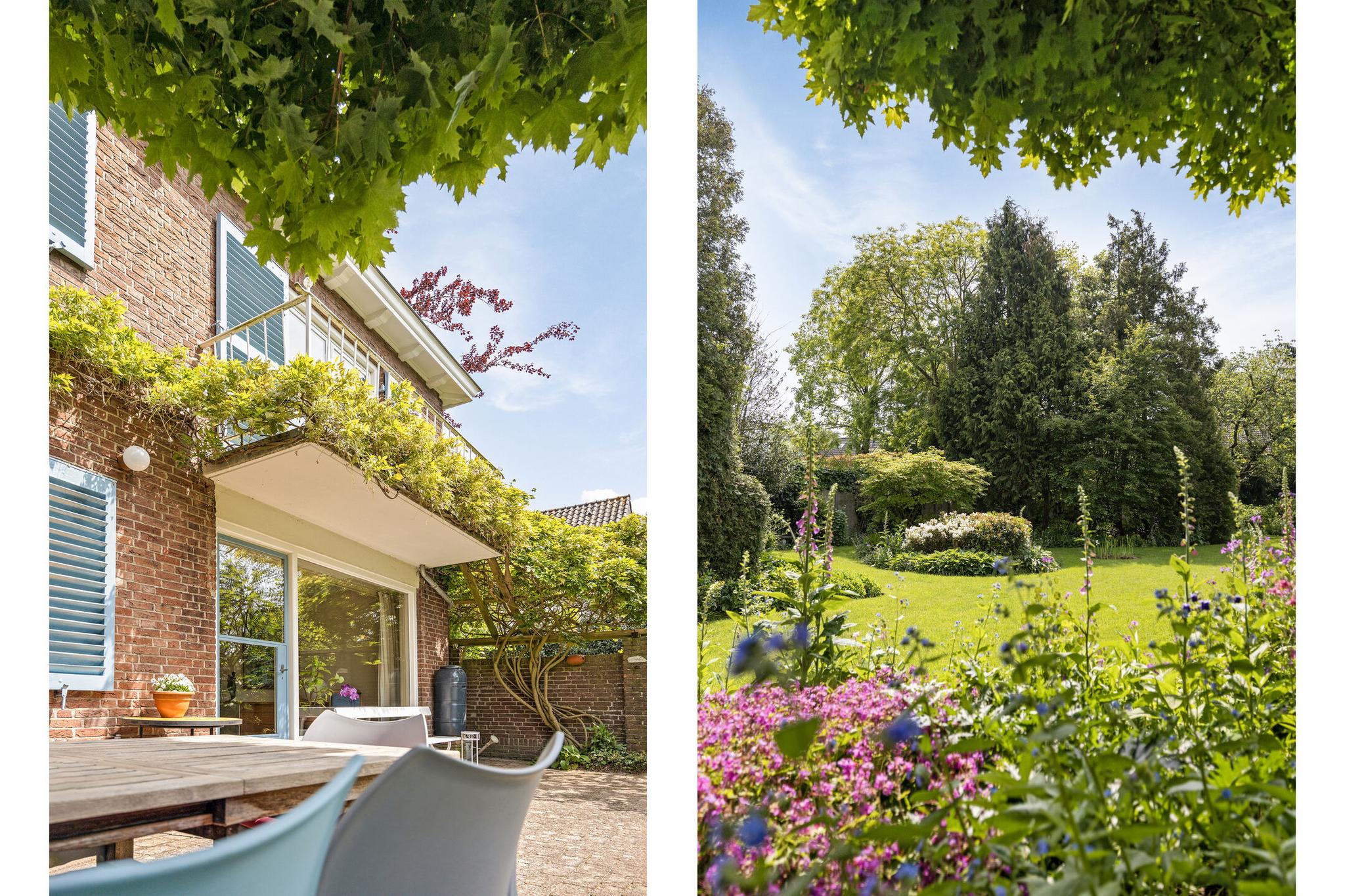 De tuin heeft een parkachtige uitstraling met haar hoge bomen, verassende hoekjes, bloemrijke borders en gazon tot diep op het perceel. De tuin is vanuit het huis op verschillende plaatsen te betreden.