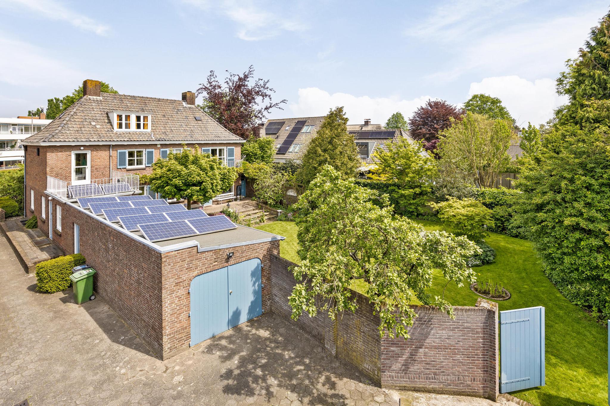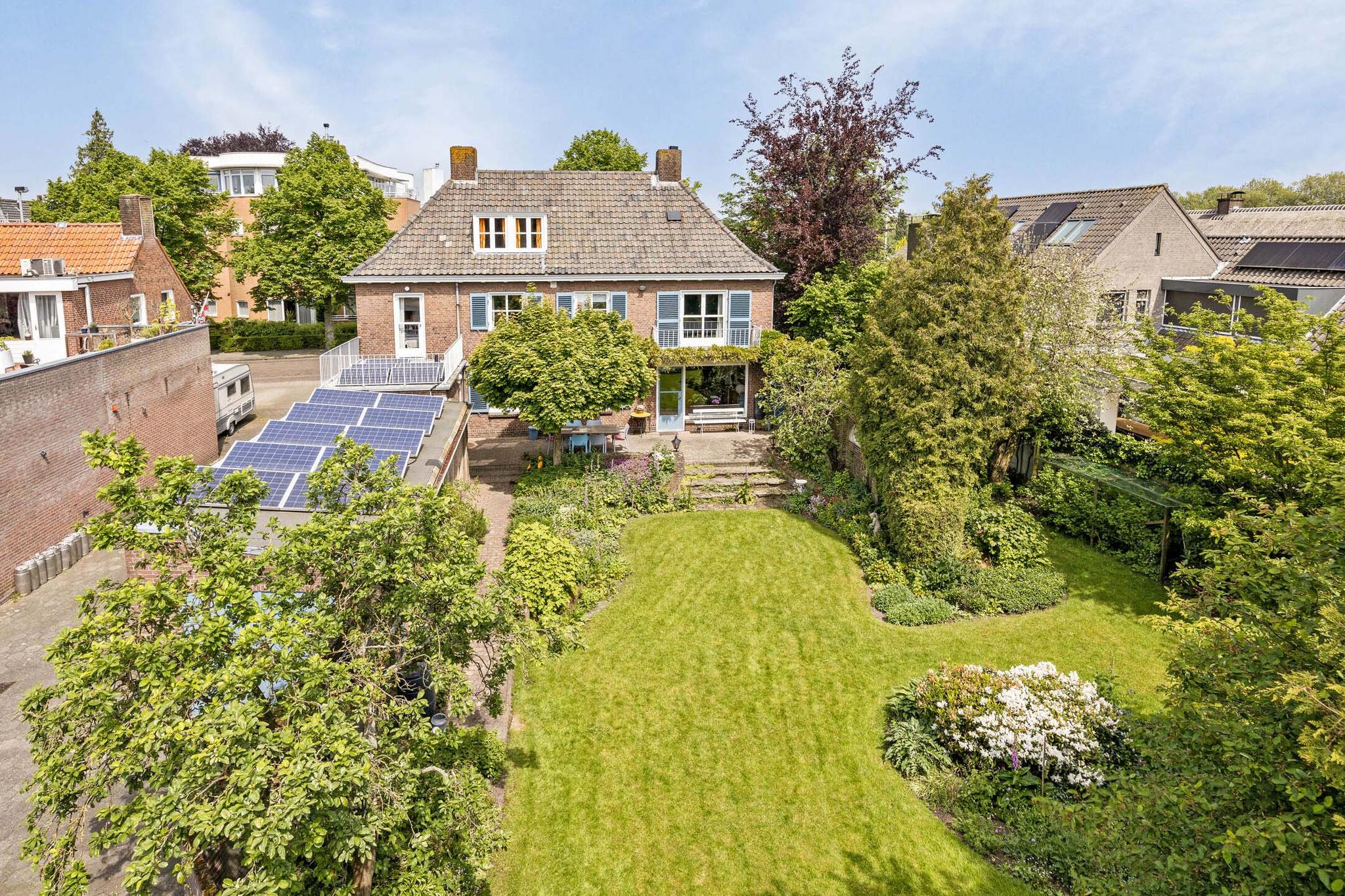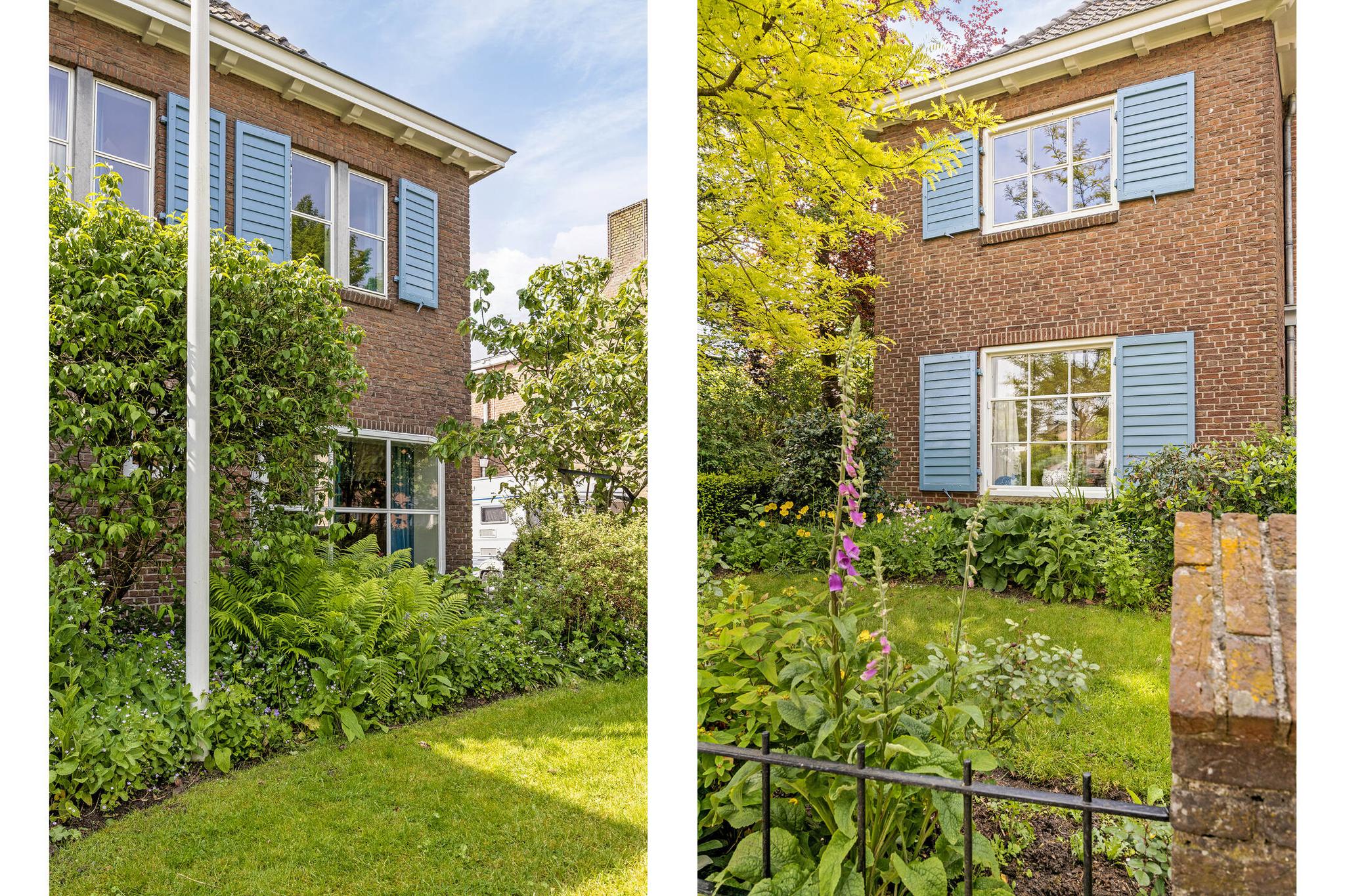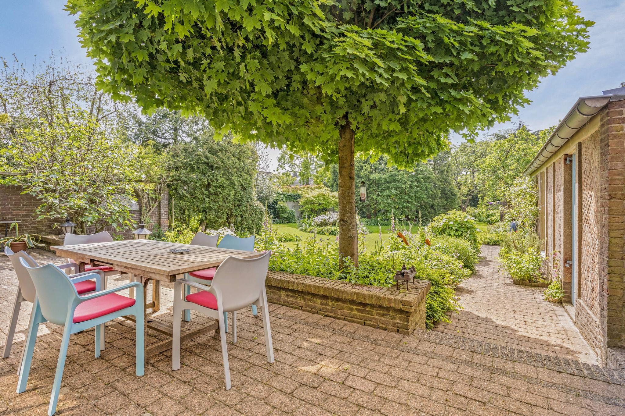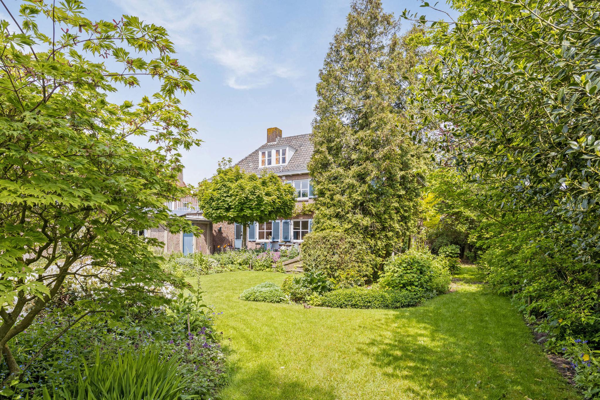 De tuin heeft een parkachtige uitstraling met haar hoge bomen, verassende hoekjes, bloemrijke borders en gazon tot diep op het perceel. De tuin is vanuit het huis op verschillende plaatsen te betreden.