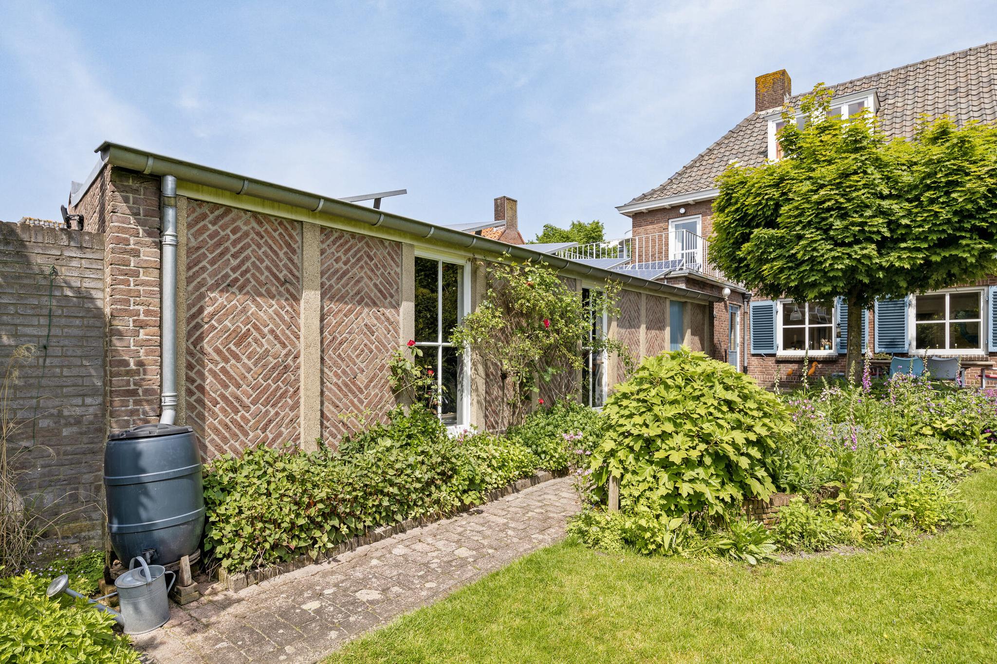 De woning bestaat uit het hoofdgebouw met een aangebouwd bijgebouw, nu in gebruik als bijkeuken met ruime garage.