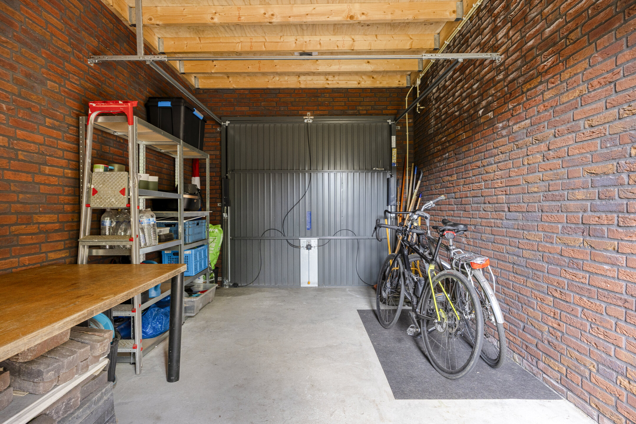 Vanuit de tuin is de praktische, aangebouwde stenen garage bereikbaar — een groot pluspunt van deze woning. Hier is volop ruimte voor het stallen van fietsen, kleine voertuigen en tuingereedschap. De roldeur zorgt voor een gemakkelijke toegang vanaf de ruime oprit aan de voorzijde van het huis. Op deze eigen oprit kunnen meerdere auto's worden geparkeerd, evenals op het achterliggende parkeerterrein aan de achterzijde van de tuin. Dit parkeerterrein is gemakkelijk te bereiken via de poort in de achtertuin.