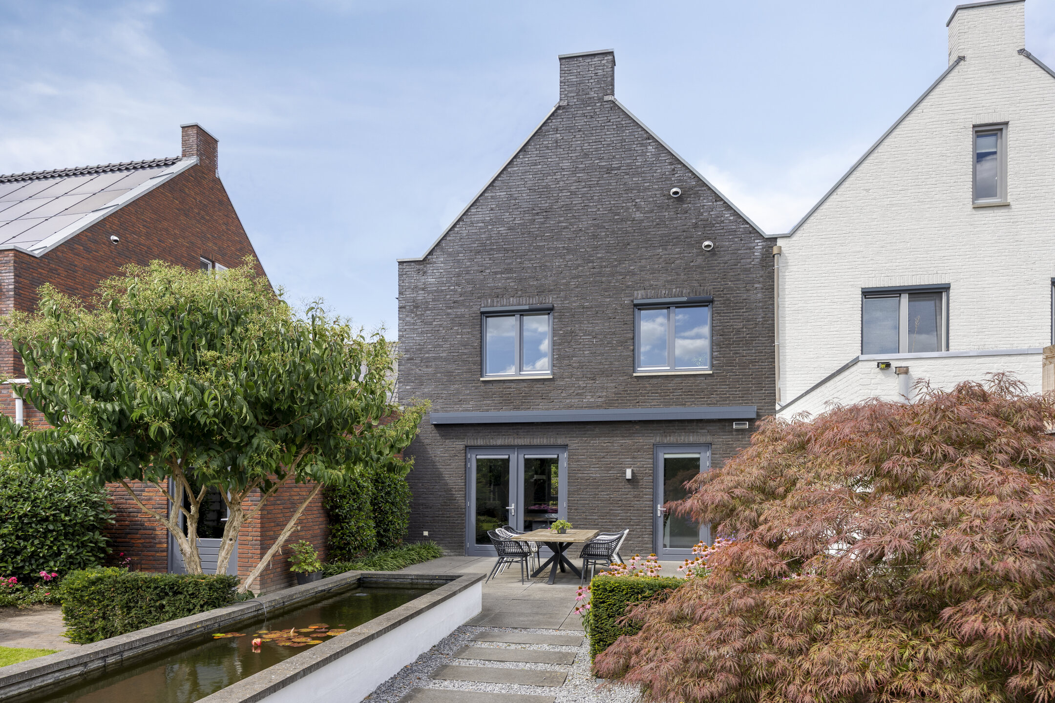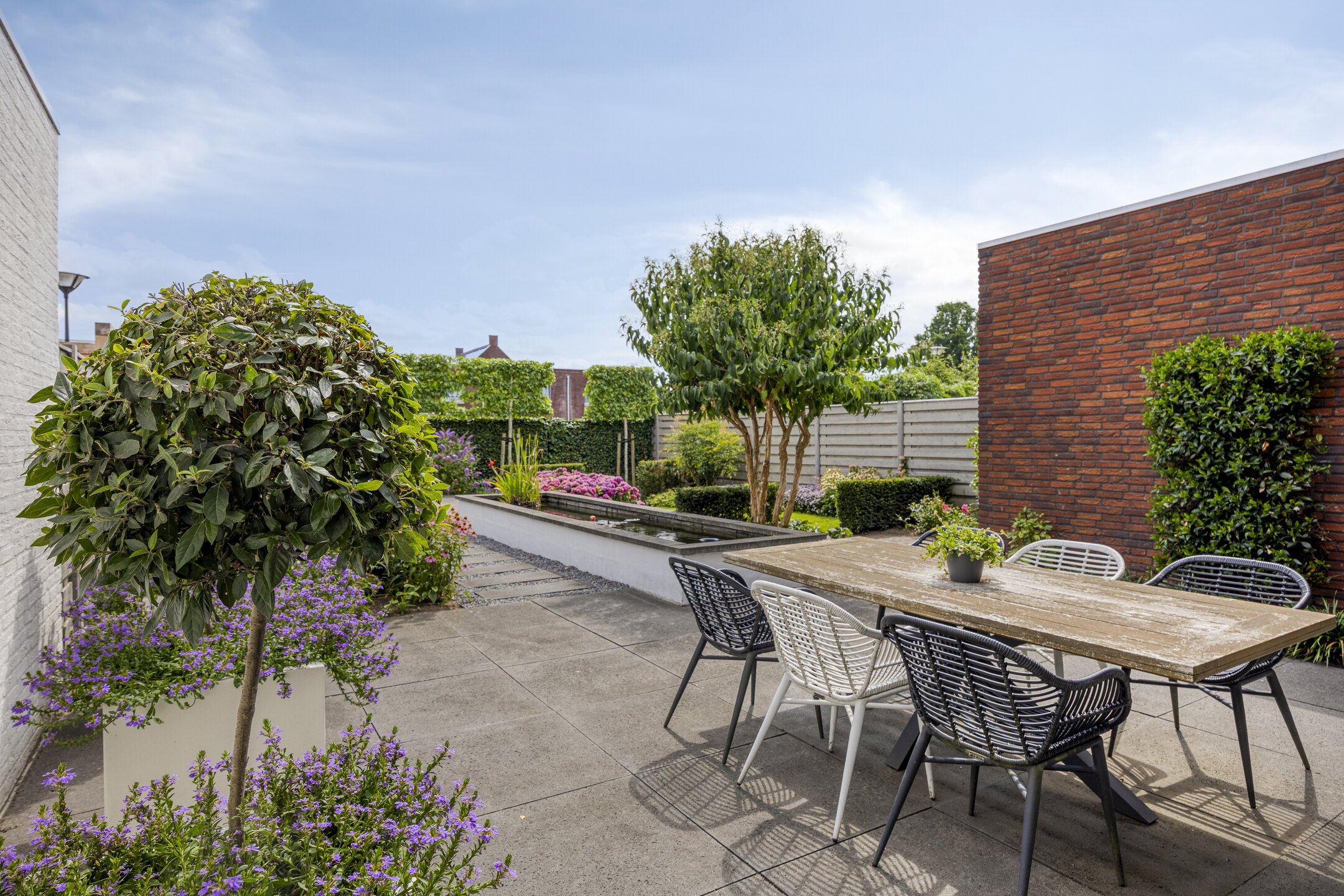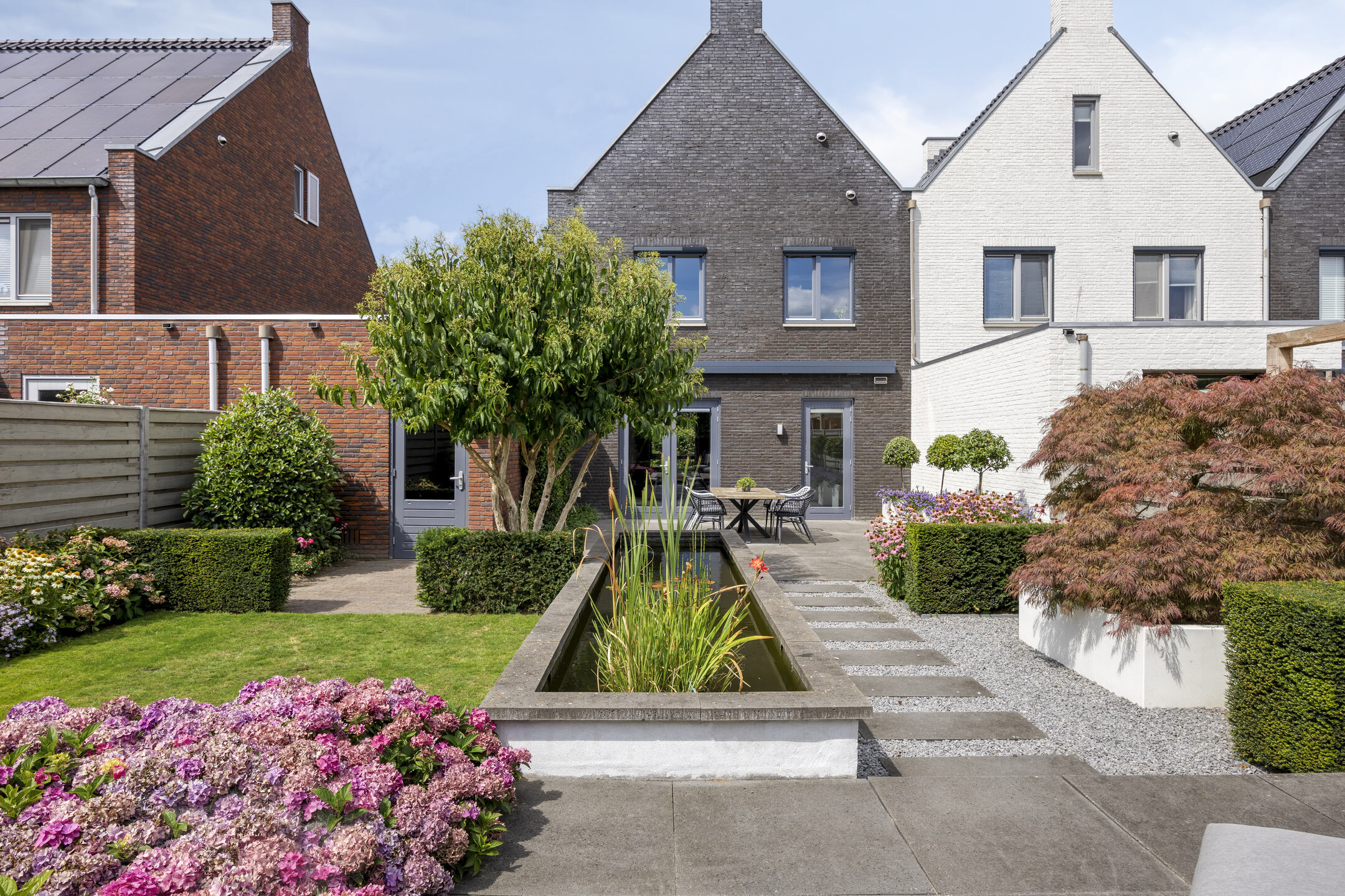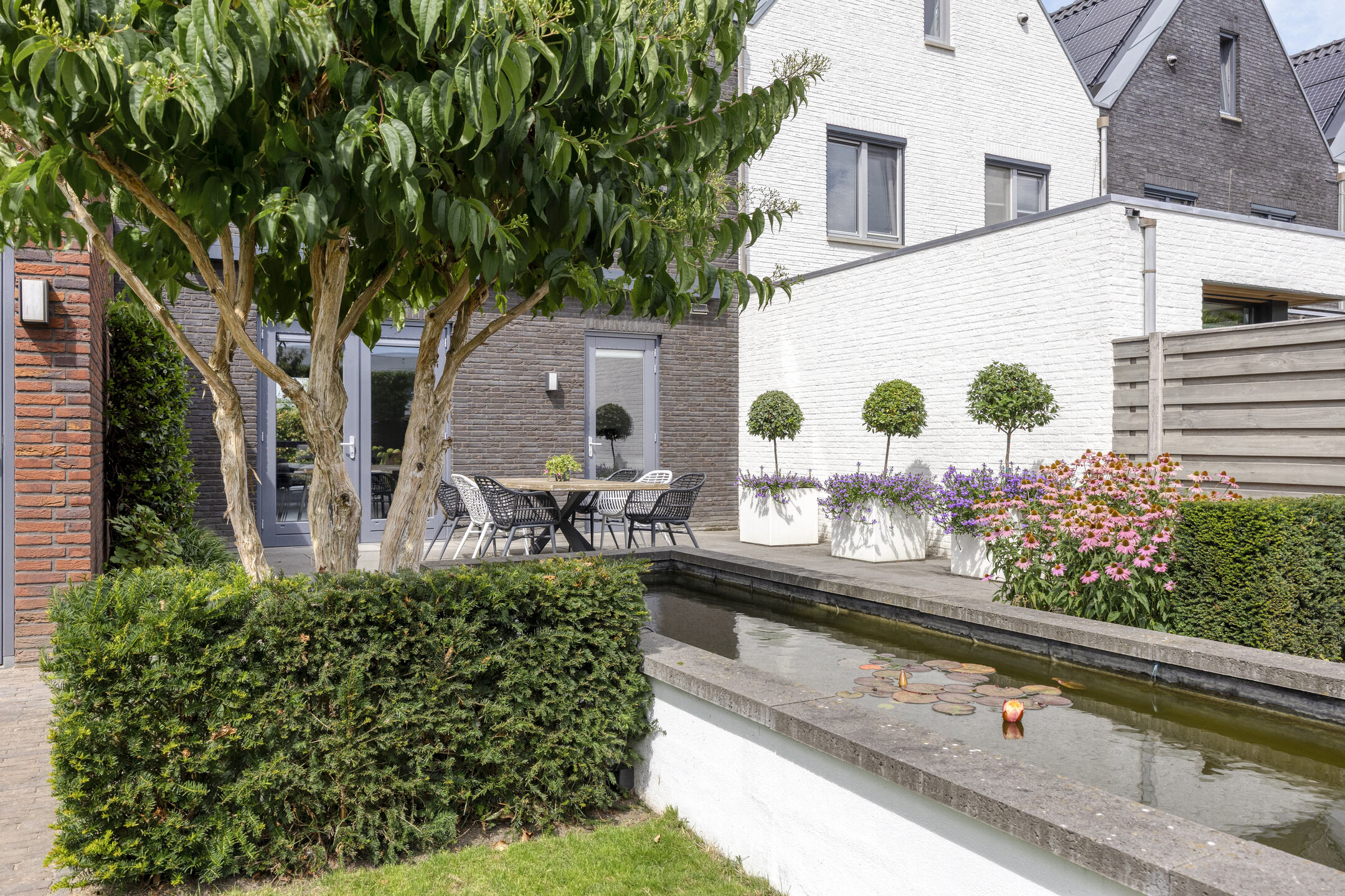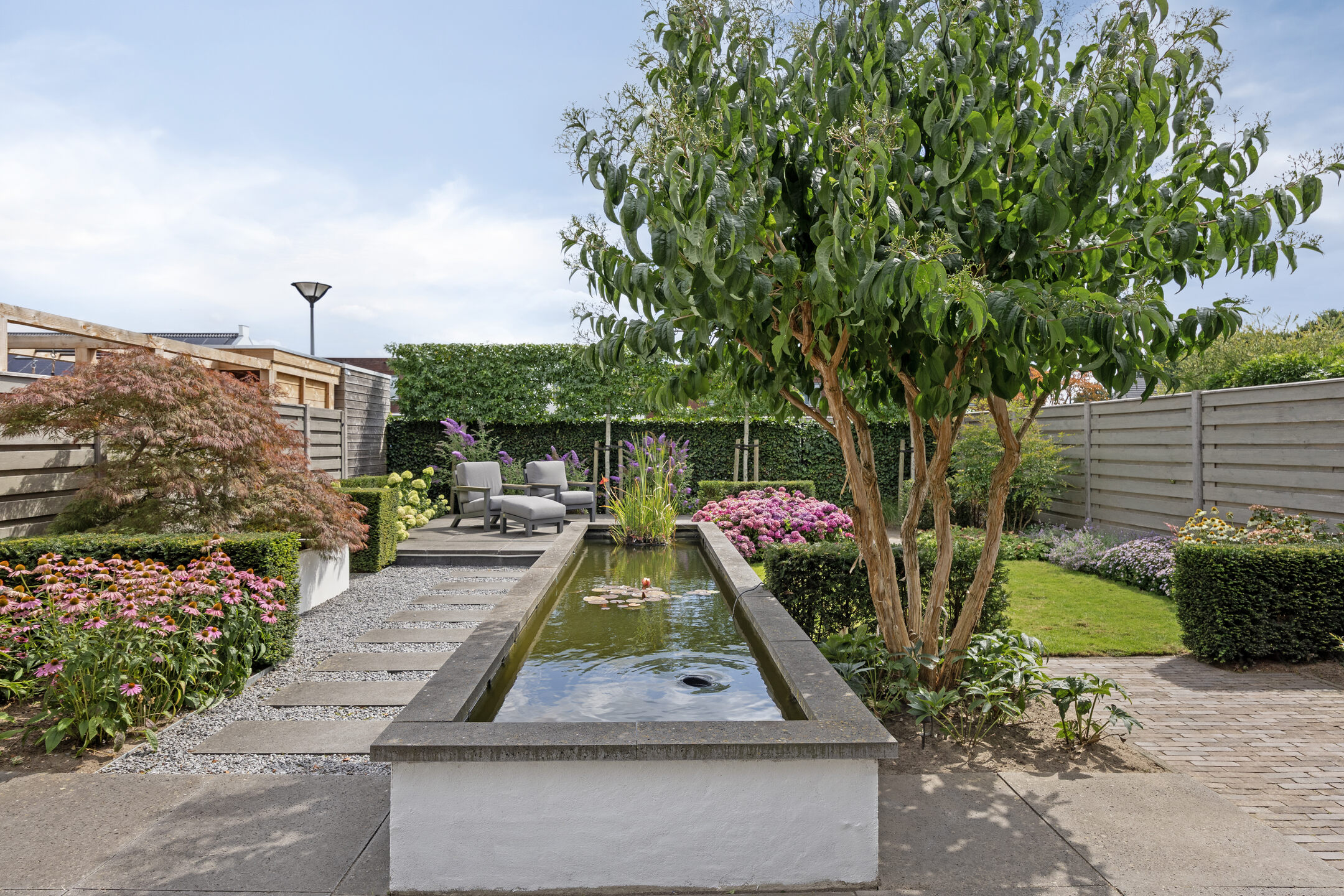 De achtertuin is een ware eyecatcher en biedt een zee aan ruimte en mogelijkheden. Hier vind je een perfecte balans tussen groen en nette betegeling, wat zorgt voor zowel een mooie uitstraling als een prettig buitenklimaat. De verschillende borders, grasperkjes en beplanting maken dit tot een fijne plek om te ontspannen. Aan de achterzijde van het perceel is een zonnige zit- en ligplek gecreëerd waar je heerlijk kunt genieten van het buitenleven. Direct bij de woning is ruimte voor een royale tuintafel met stoelen, ideaal voor lange zomeravonden met vrienden en familie. Dankzij de ruime elektrische zonneluifel kun je hier ook comfortabel in de schaduw zitten. Als stijlvolle finishing touch is er een sfeervolle vijver, die de tuin een bijzondere en rustgevende uitstraling geeft.