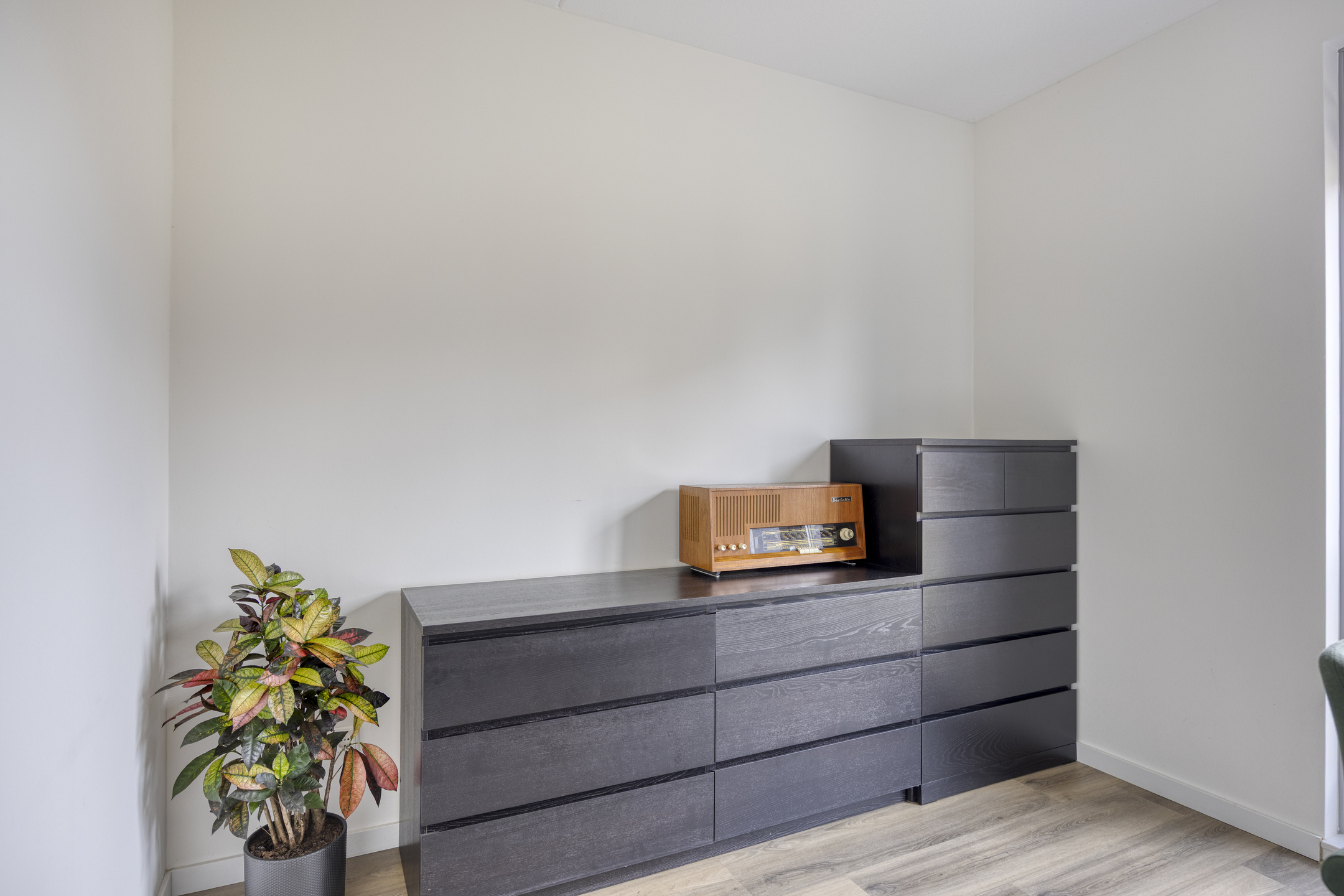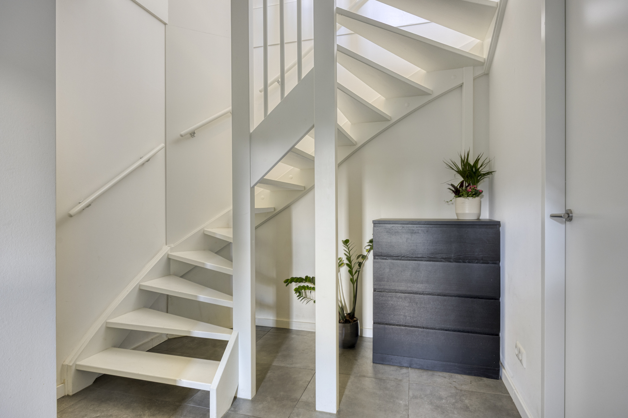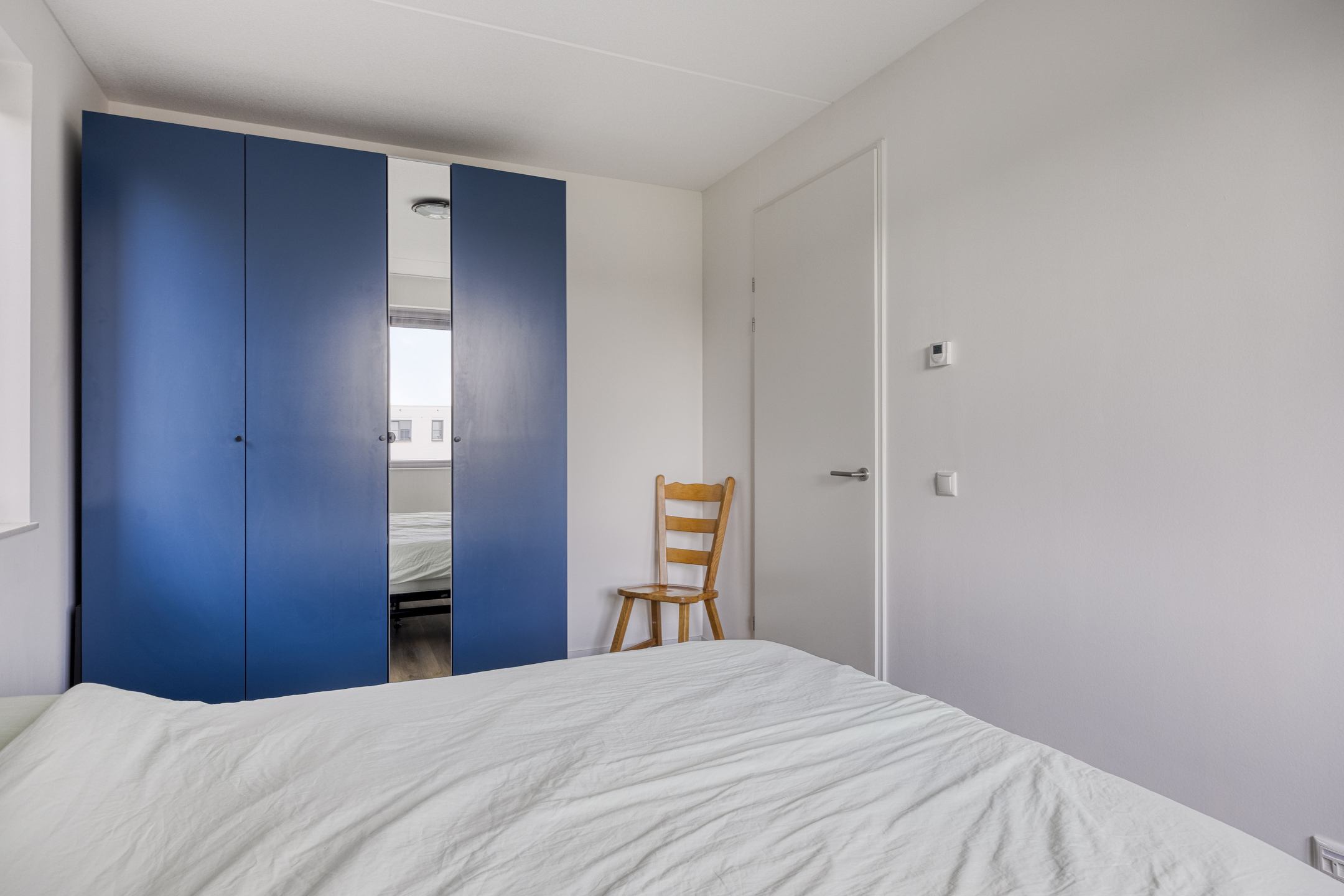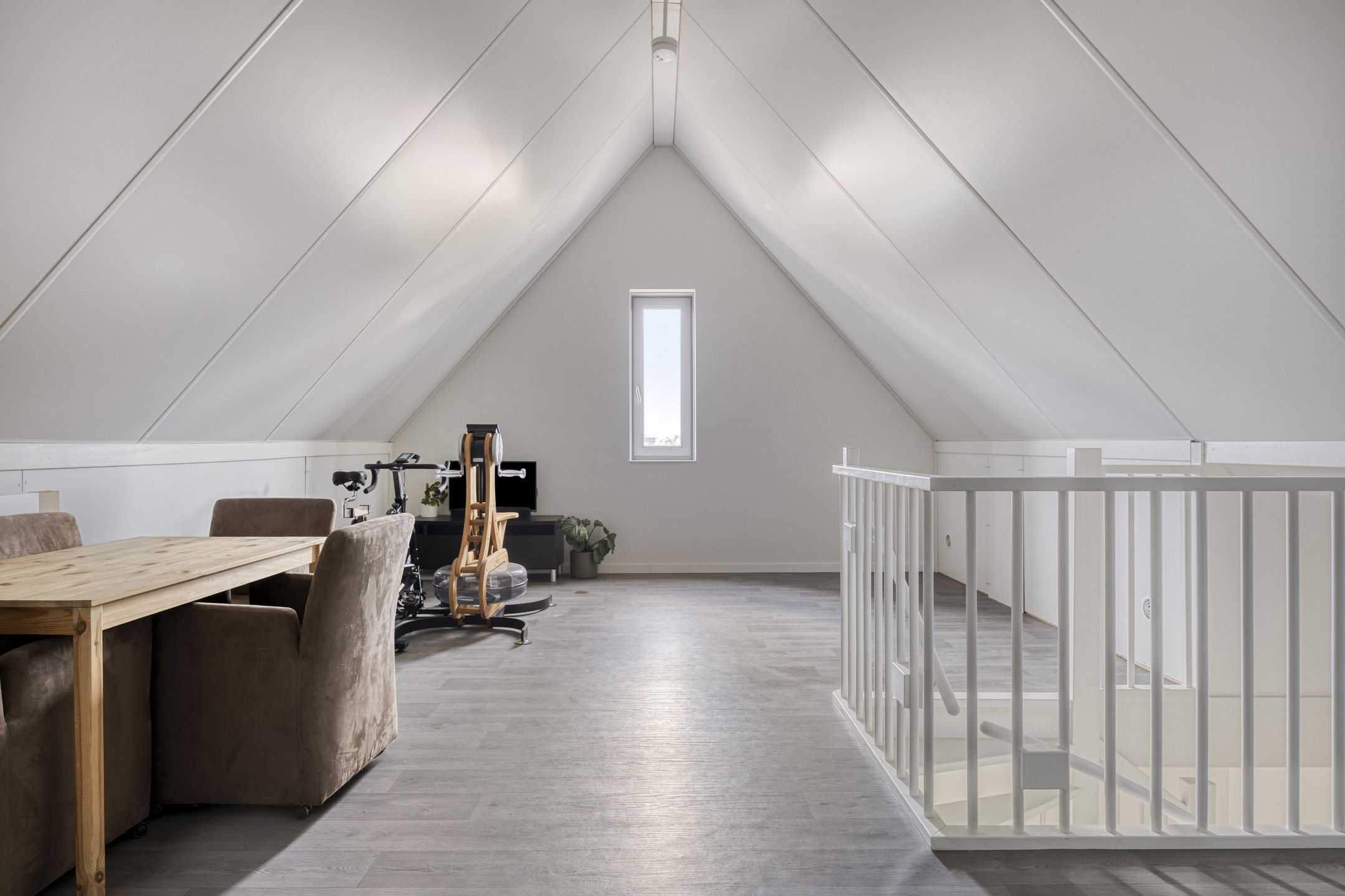 Ook de tweede verdieping is bereikbaar via een vaste trap. Deze veelzijdige ruimte kan perfect dienen als vierde slaapkamer, maar is ook ideaal als ruime werkkamer, hobbyruimte of extra bergruimte. Achter de knieschotten zijn praktische opbergkastjes aanwezig, zodat je al je spullen netjes uit het zicht kunt opbergen. Dankzij het raam valt er volop daglicht binnen, wat de ruimte prettig en licht maakt.