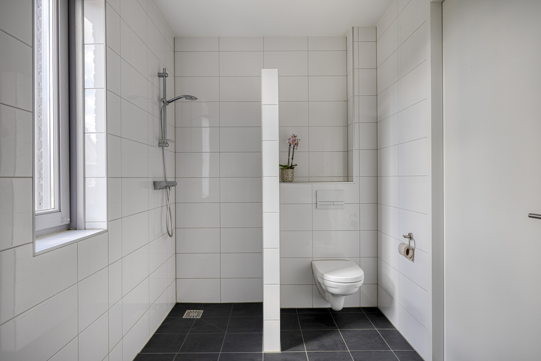 - Toilet, wastafel, wastafelmeubel, inloopdouche en vloerverwarming