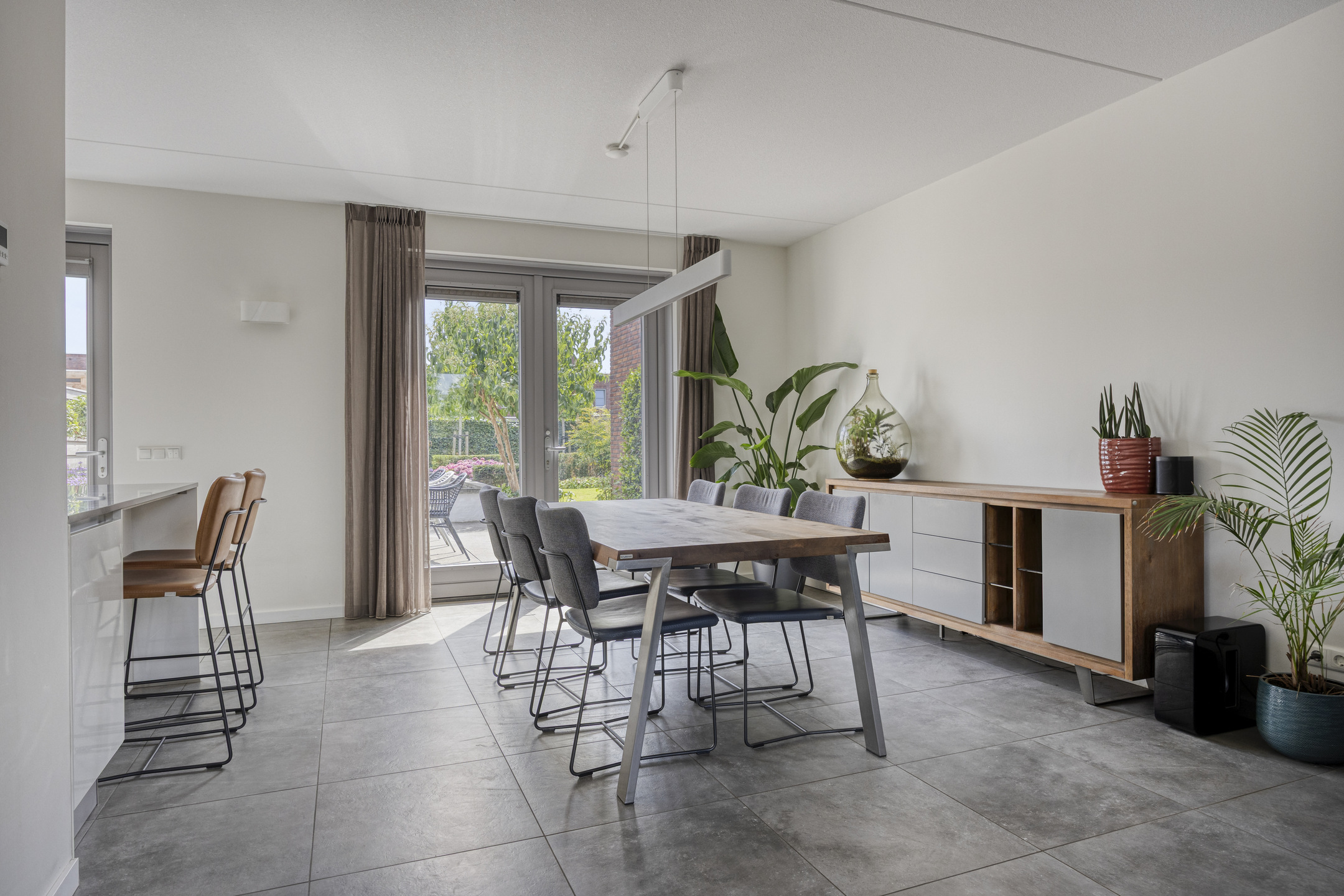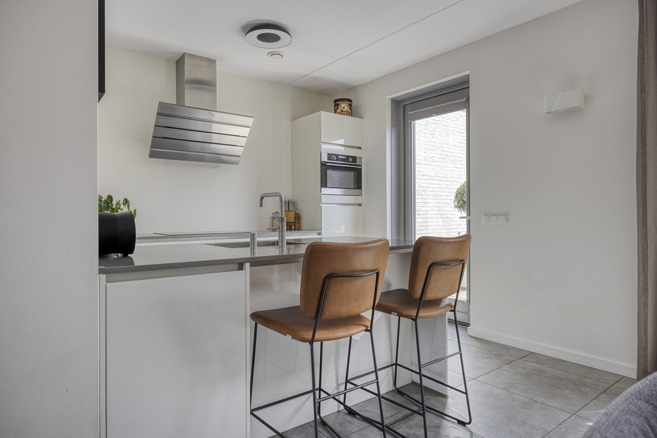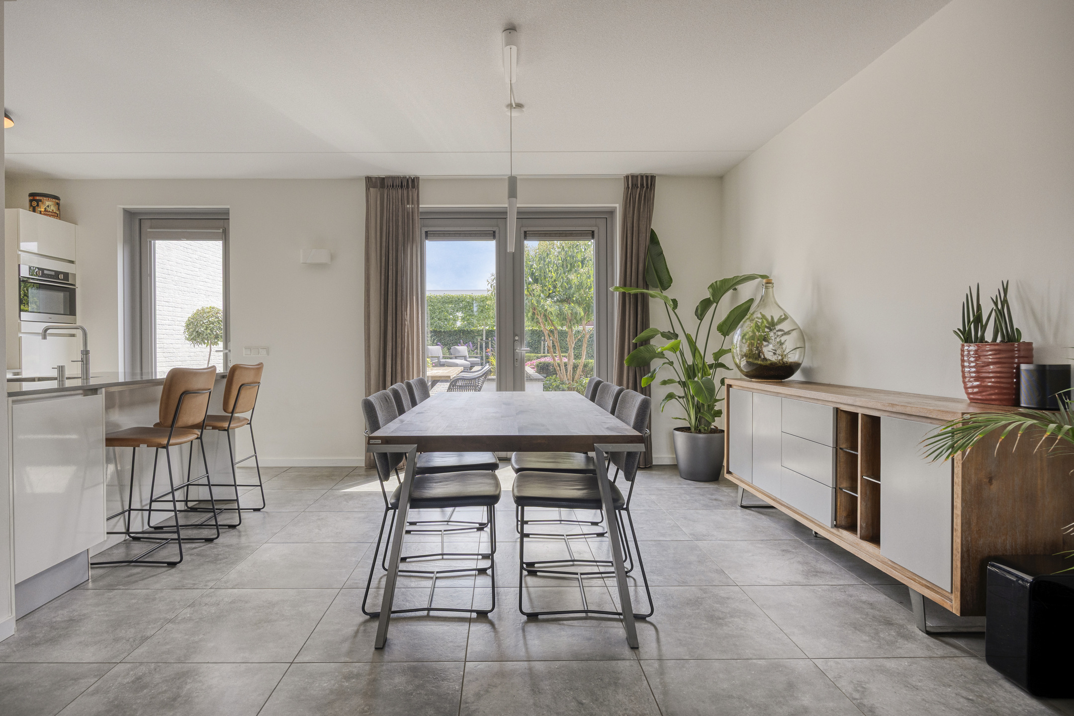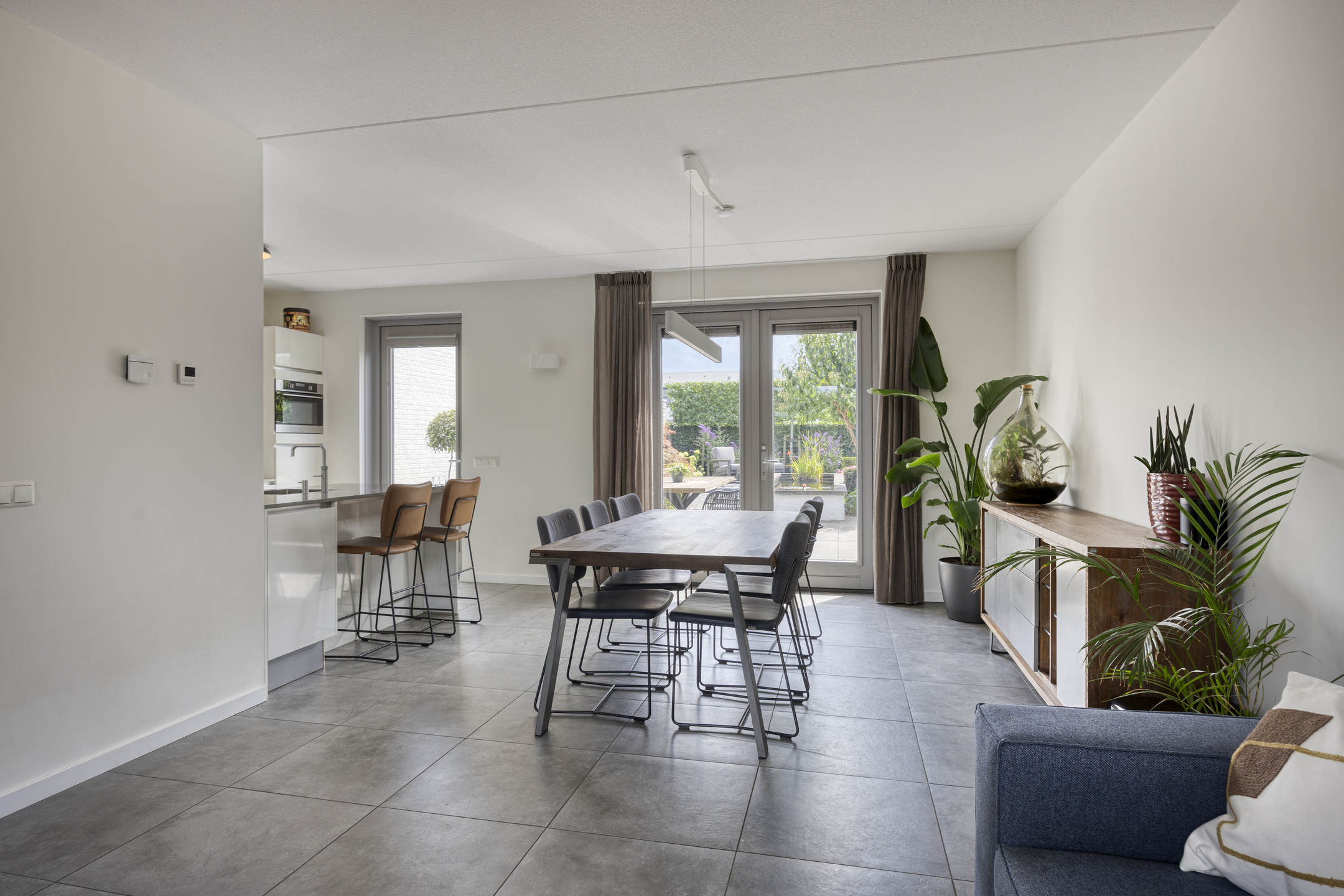 Bij binnenkomst in deze lichte en strak afgewerkte woning, betreden we direct de woonkamer. Deze ruimte vormt het hart van het huis en biedt een praktische, open indeling. Aan de voorzijde vind je een sfeervolle zitkamer met ruimte voor een royale hoekbank om heerlijk te ontspannen. Aan de achterzijde is de eetkamer gesitueerd, die in directe verbinding staat met de moderne keuken. De keuken is een echte blikvanger: voorzien van een stijlvol kookeiland met barretje, ideaal voor een gezellige borrel of snelle maaltijd. Daarnaast is deze compleet uitgerust met inbouwapparatuur, waaronder een inductiekookplaat, afzuigkap, vaatwasser, combi-oven, koelkast en een Quooker kraan. De strakke grijze vloertegels geven de gehele leefruimte een frisse en moderne uitstraling. Via de tuindeur sta je zo in de buitenruimte, waardoor het binnen-buitenleven naadloos in elkaar overloopt. Tot slot geeft de ruime entree toegang tot een apart toilet met fonteintje.