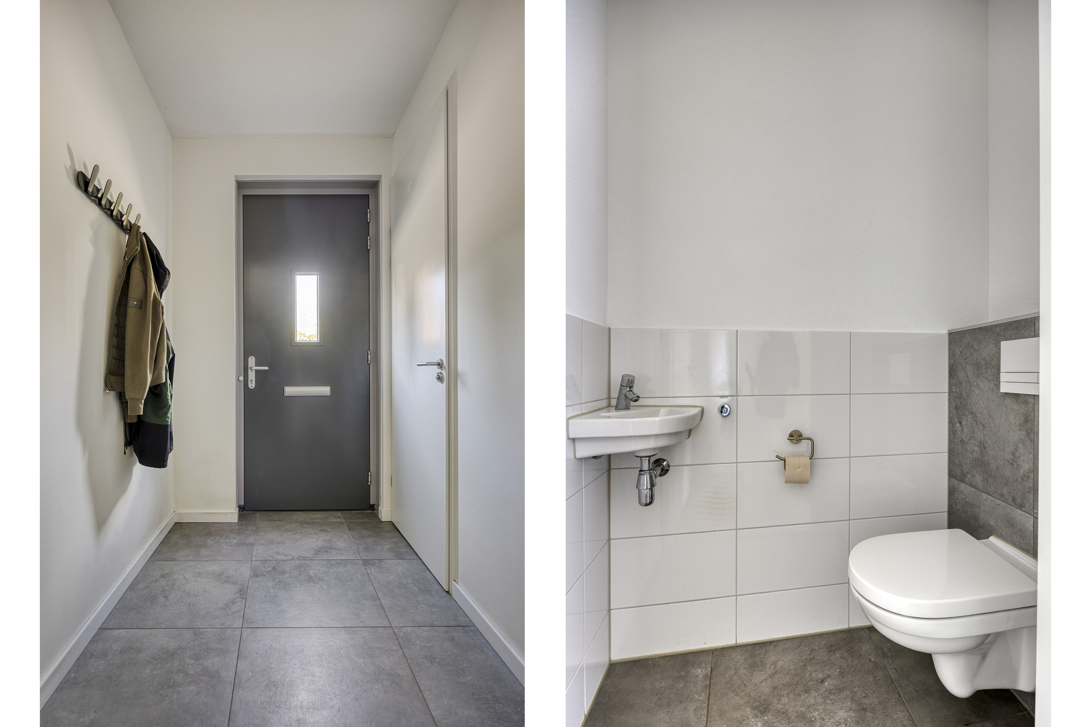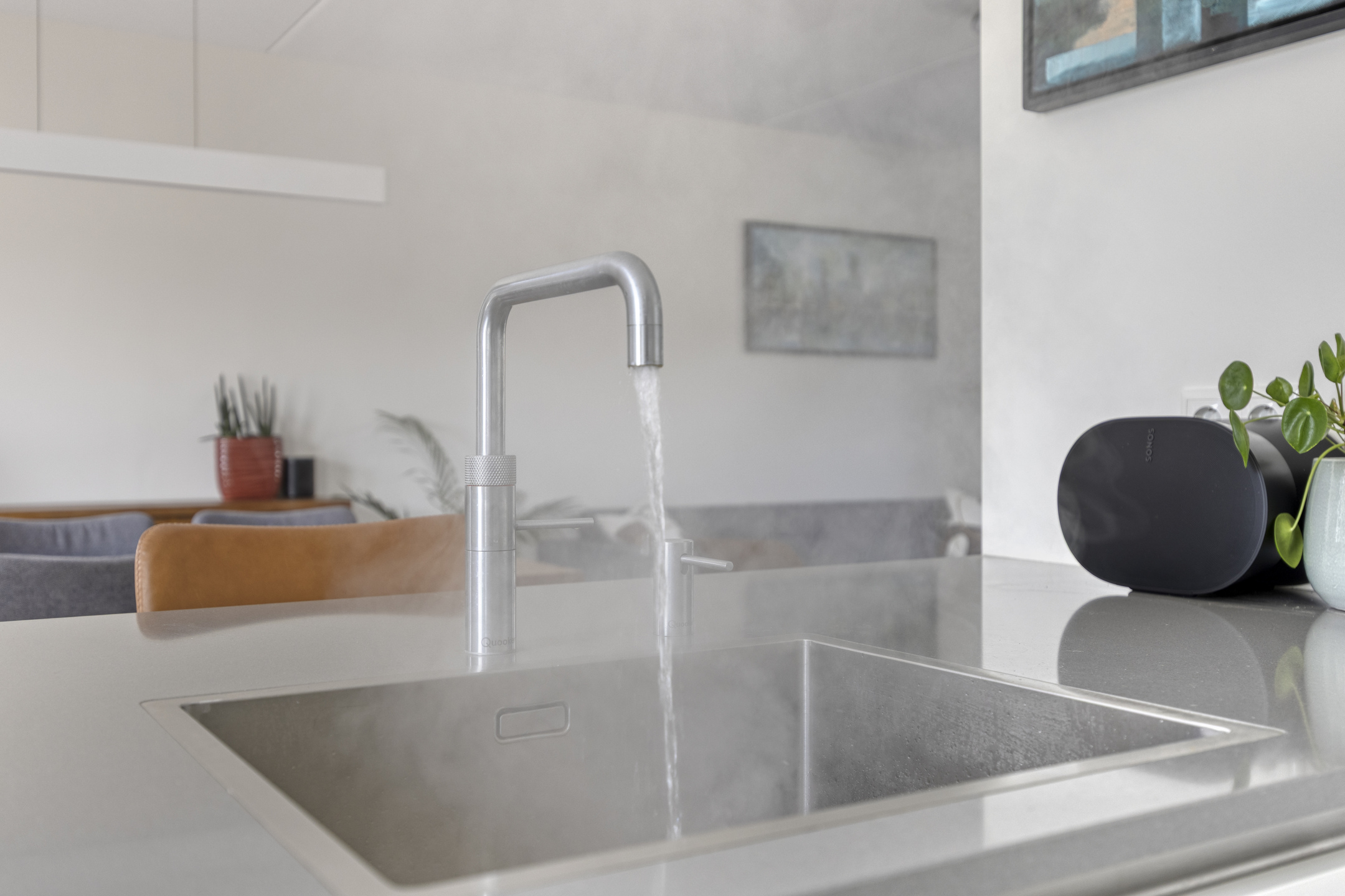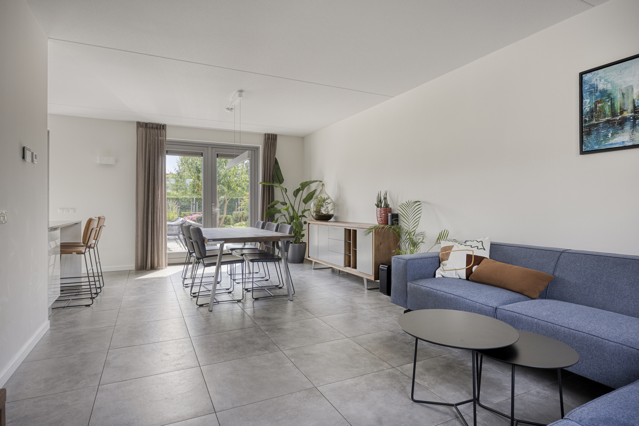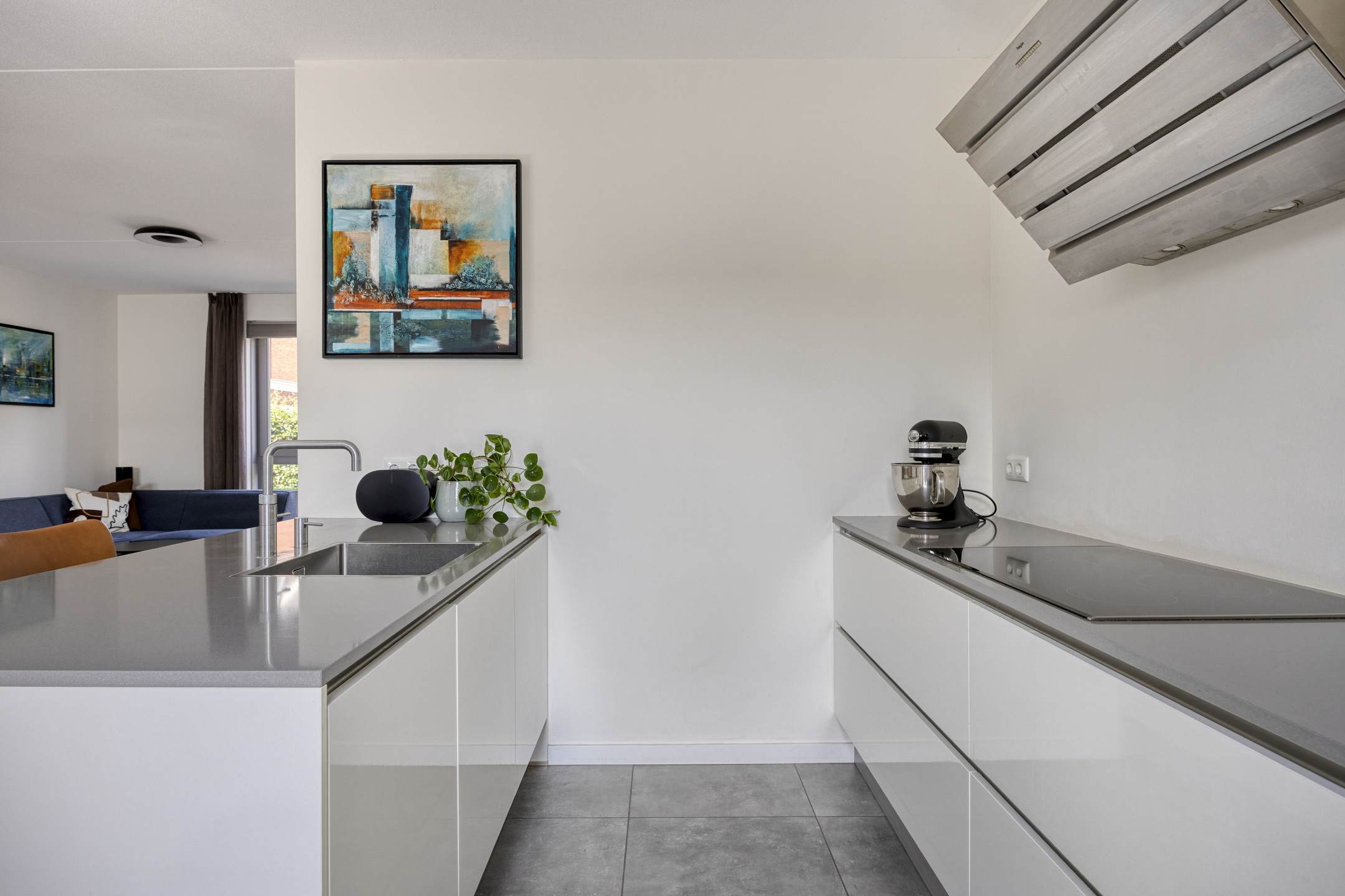 Bij binnenkomst in deze lichte en strak afgewerkte woning, betreden we direct de woonkamer. Deze ruimte vormt het hart van het huis en biedt een praktische, open indeling. Aan de voorzijde vind je een sfeervolle zitkamer met ruimte voor een royale hoekbank om heerlijk te ontspannen. Aan de achterzijde is de eetkamer gesitueerd, die in directe verbinding staat met de moderne keuken. De keuken is een echte blikvanger: voorzien van een stijlvol kookeiland met barretje, ideaal voor een gezellige borrel of snelle maaltijd. Daarnaast is deze compleet uitgerust met inbouwapparatuur, waaronder een inductiekookplaat, afzuigkap, vaatwasser, combi-oven, koelkast en een Quooker kraan. De strakke grijze vloertegels geven de gehele leefruimte een frisse en moderne uitstraling. Via de tuindeur sta je zo in de buitenruimte, waardoor het binnen-buitenleven naadloos in elkaar overloopt. Tot slot geeft de ruime entree toegang tot een apart toilet met fonteintje.