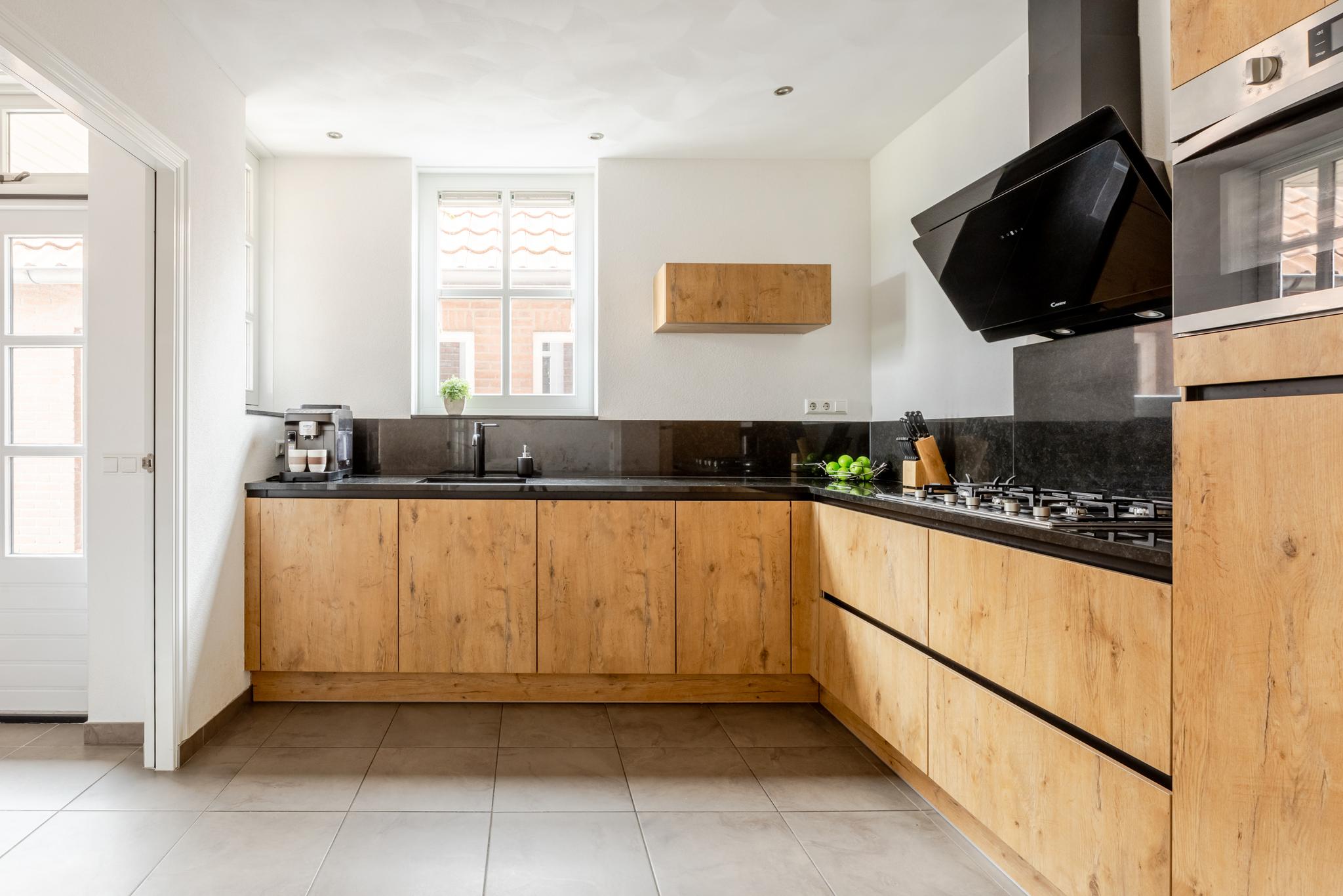 •Het keukenmeubel uit 2022 is in een hoekopstelling geplaatst en voorzien van een natuurstenenwerkblad en heeft aan inbouwkeukenapparatuur; een vaatwasmachine, een combioven, een koelkast, een spoelbak en een 5 pits gaskookplaat met afzuigkap.