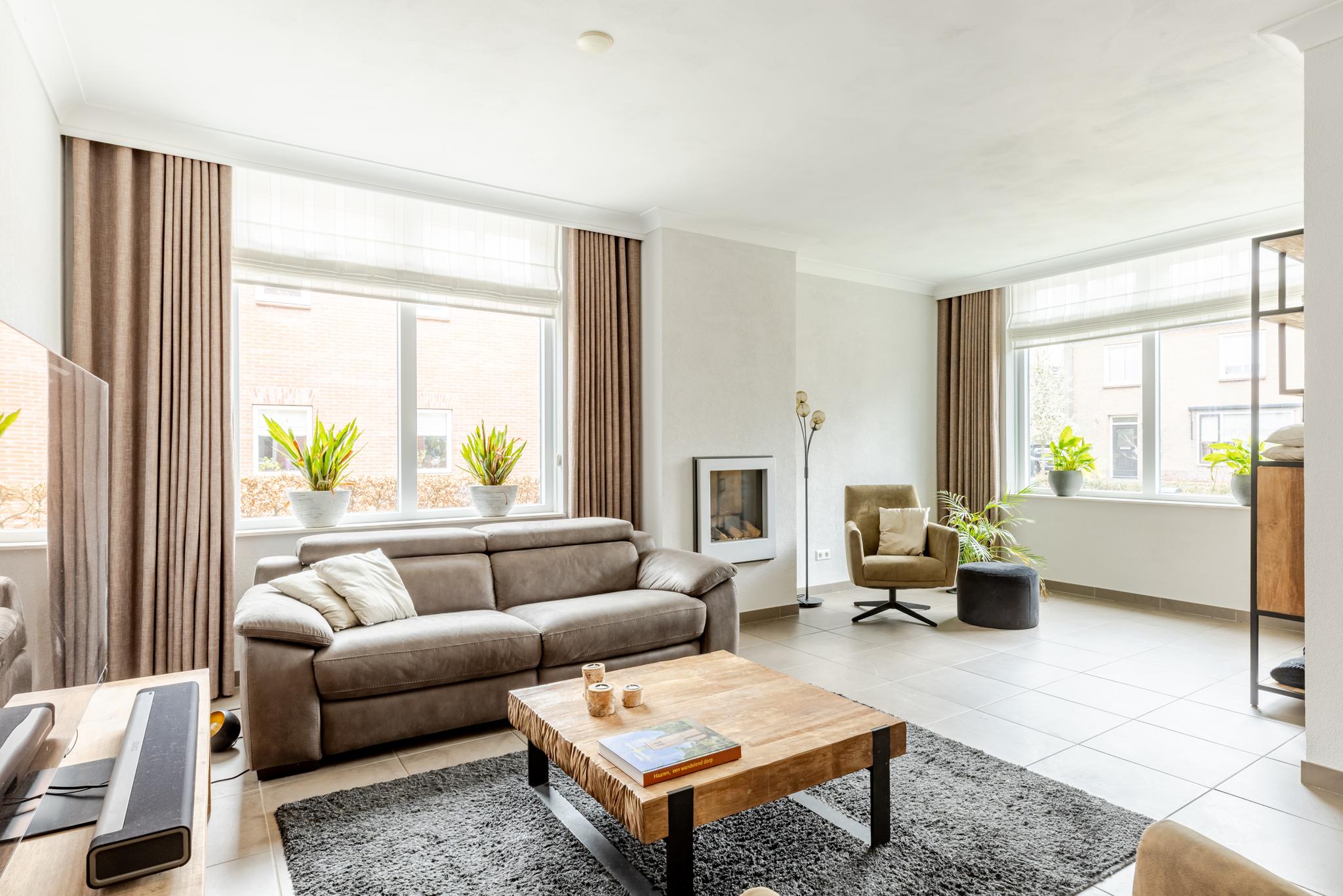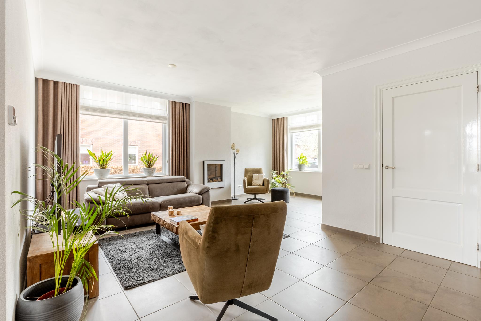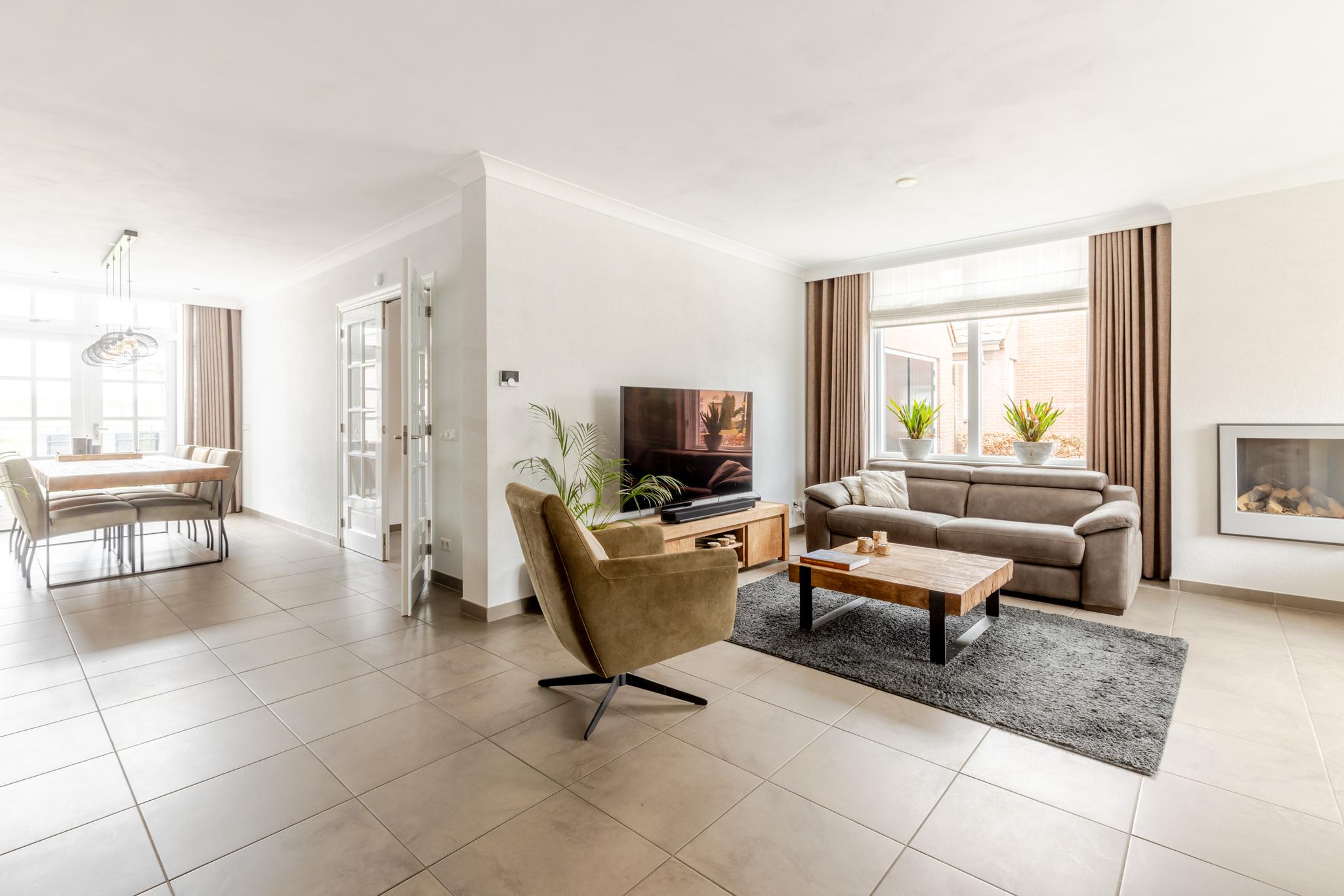 •De royale lichte woonkamer met tegelvloer en comfortabele vloerverwarming heeft een gezellige zithoek met gashaard en een eetgedeelte aan de tuinkant. Door de tuindeuren met roedeverdeling is er direct vrij uitzicht over de tuin en de weilanden erachter.