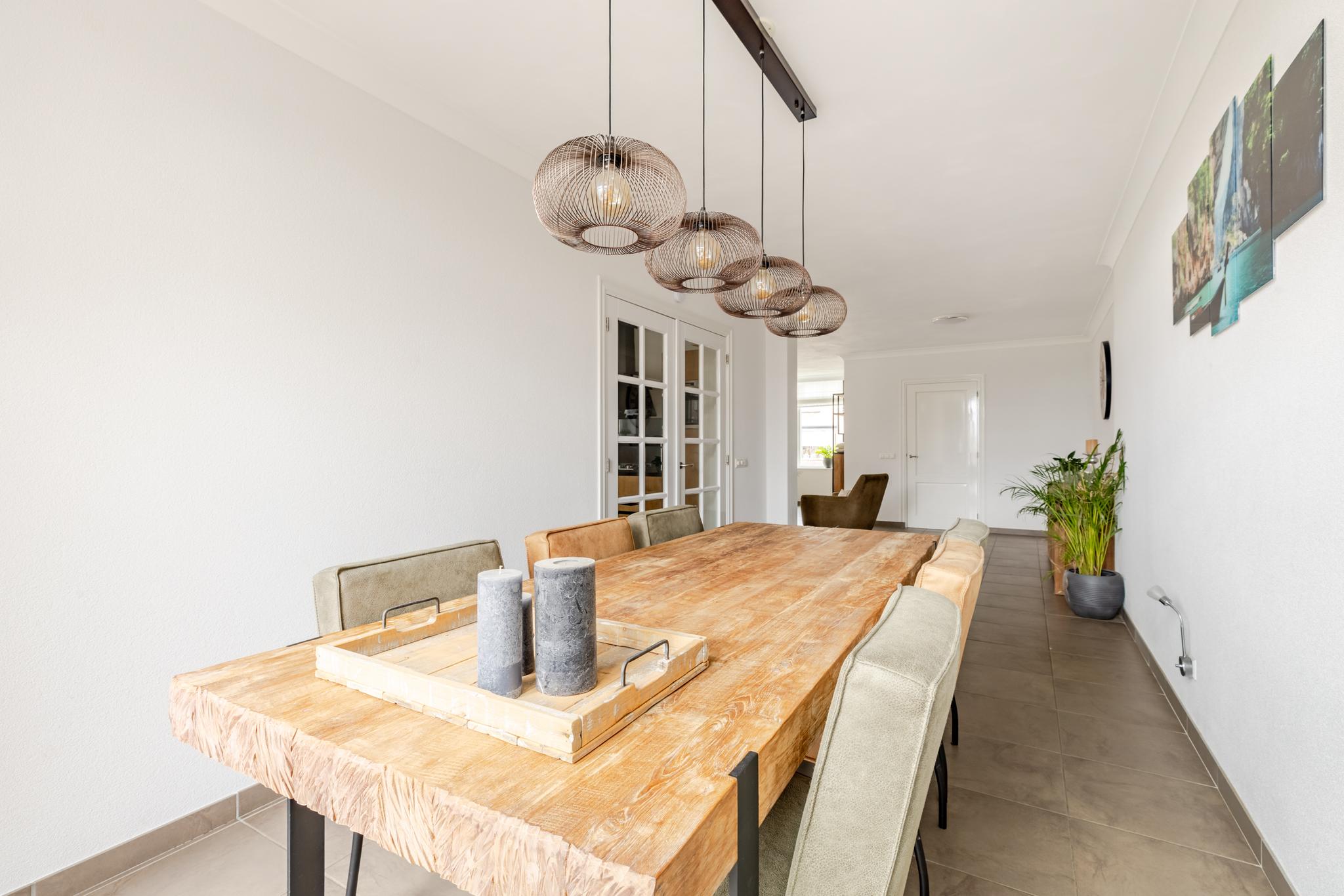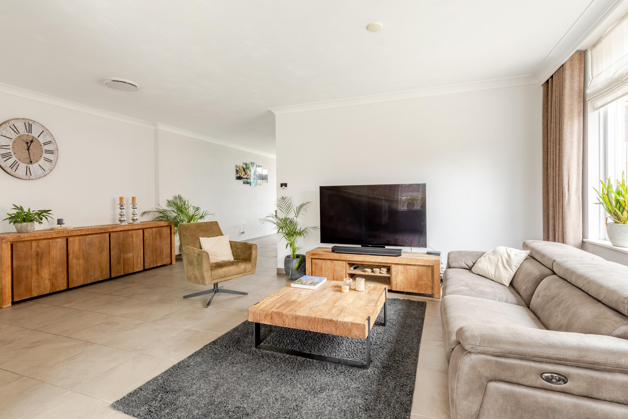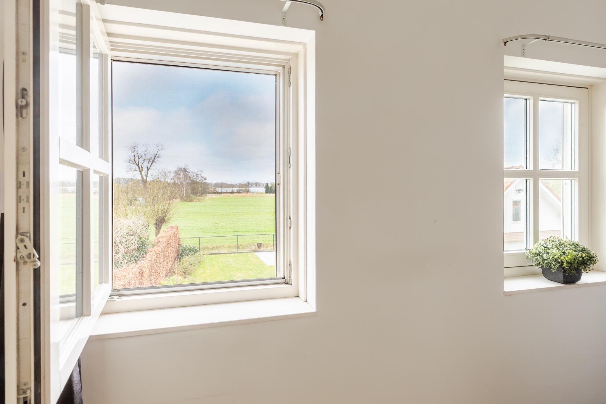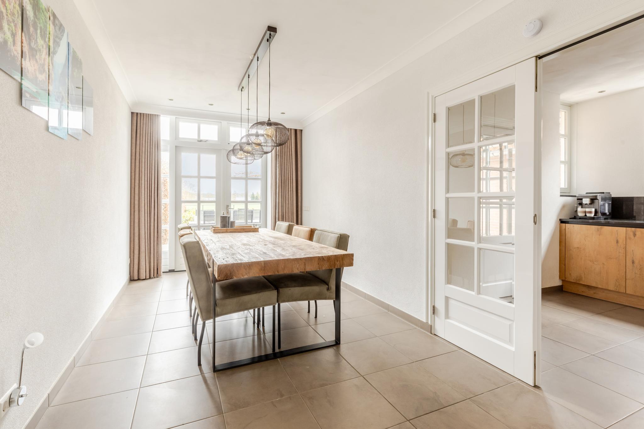 •De royale lichte woonkamer met tegelvloer en comfortabele vloerverwarming heeft een gezellige zithoek met gashaard en een eetgedeelte aan de tuinkant. Door de tuindeuren met roedeverdeling is er direct vrij uitzicht over de tuin en de weilanden erachter.