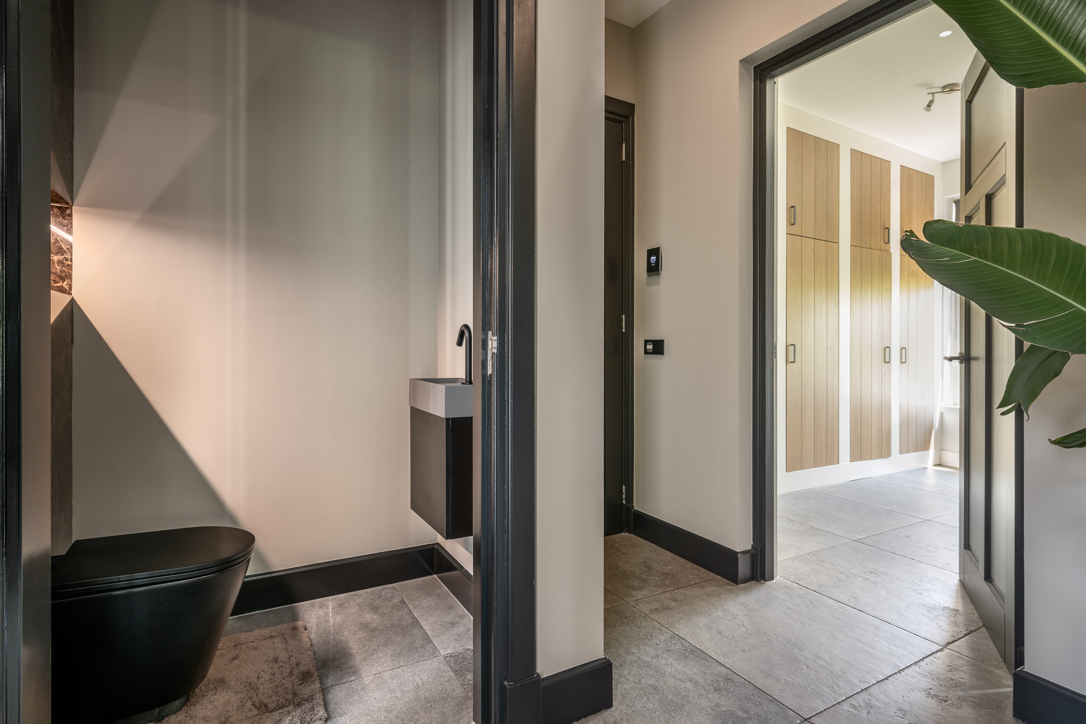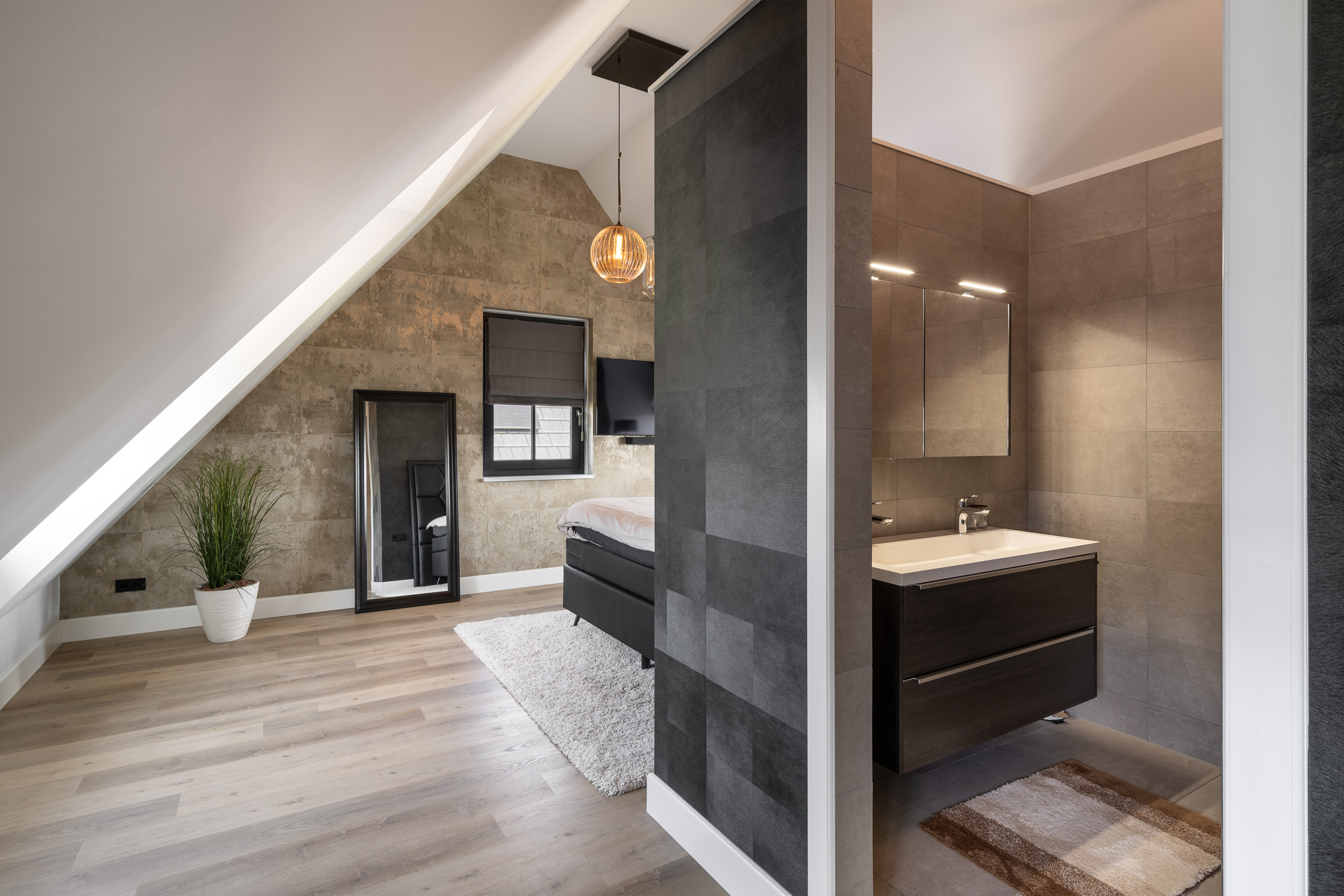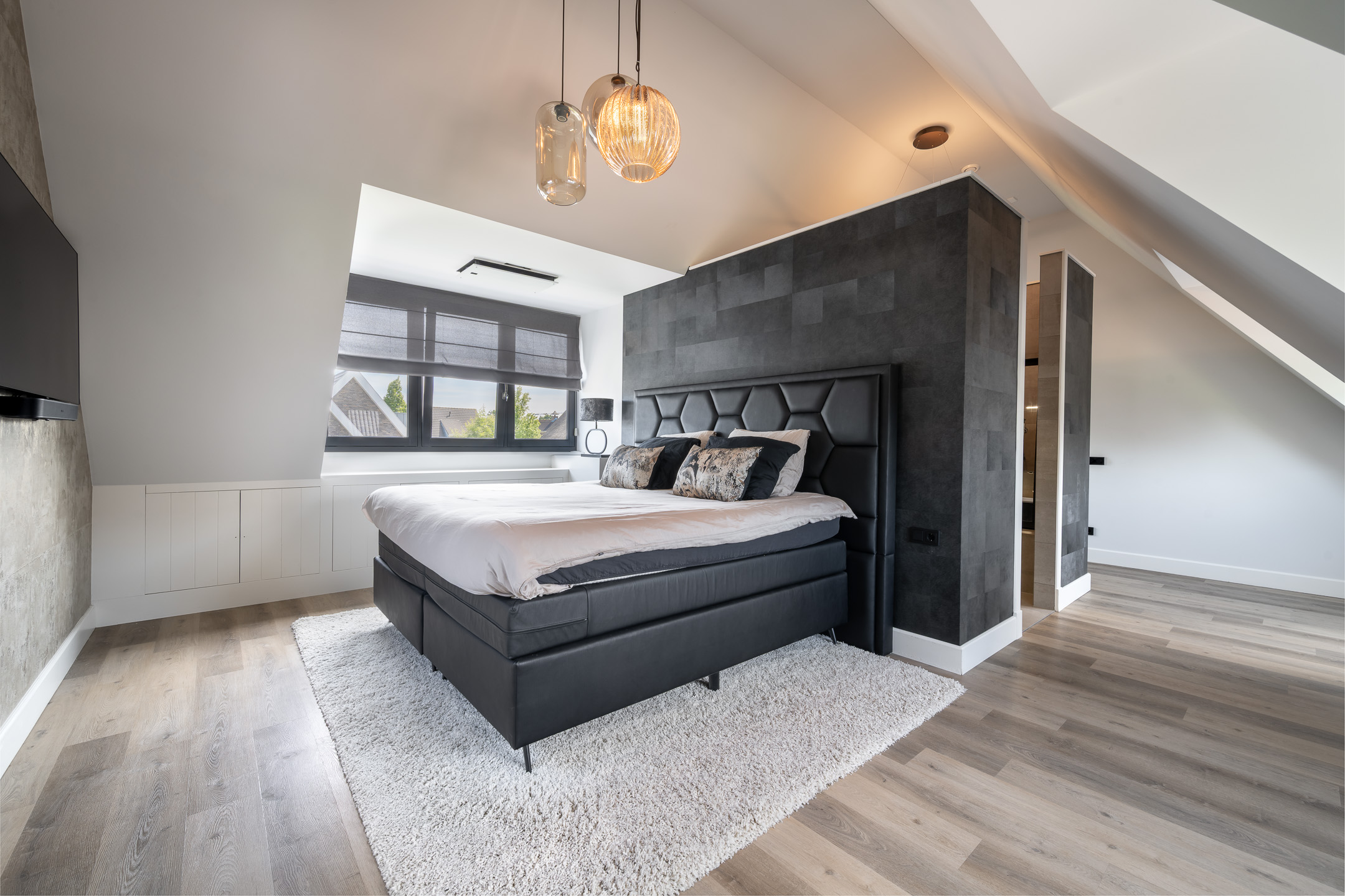De eerste verdieping bereik je via de trap in de entreehal. Hier vind je vier royale slaapkamers, een inloopkast, een moderne badkamer en een apart toilet. De hoofdslaapkamer is bijzonder ruim en straalt pure luxe uit, met een eigen badkamer voorzien van dubbele wastafel en inloopdouche, ingebouwde kasten én extra ruimte voor een inloopkast. Dankzij de dakkapellen geniet je hier van een prachtig licht en extra vloeroppervlak. De overige drie slaapkamers zijn ook groot genoeg voor tweepersoonsbedden en beschikken deels over inbouwkasten. Eén van de kamers wordt momenteel gebruikt als doorloop naar de tweede verdieping, maar is uiteraard ook als slaapkamer in te richten. Vanuit de overloop heb je toegang tot de tweede badkamer, voorzien van een ligbad, inloopdouche en dubbele wastafel met modern meubel.