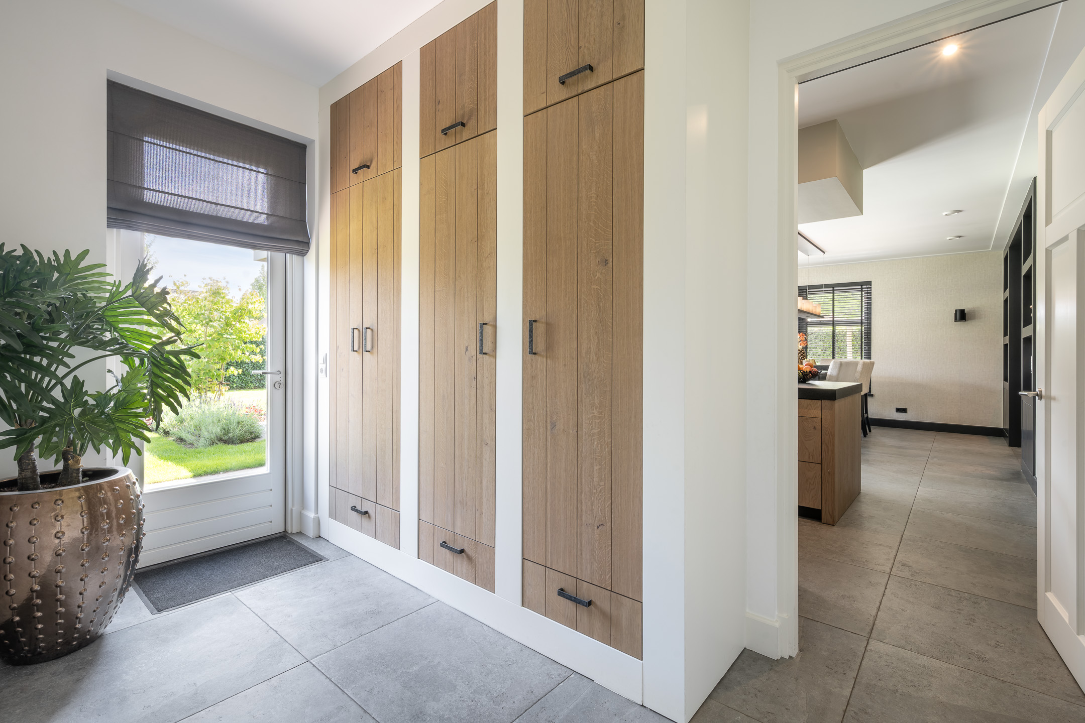Bij binnenkomst in de woning word je direct verwelkomd door een ruime entreehal met een prachtige vide die direct een gevoel van luxe en openheid geeft. Vanuit de hal heb je toegang tot het toilet, de trap naar de eerste verdieping, de woonkamer en de keuken. De royale woonkamer is een heerlijke leefruimte met volop daglicht dankzij de grote raampartijen. Hier is meer dan genoeg ruimte voor een comfortabele zithoek én een grote eettafel. De keuken ensuite is een echte eyecatcher: luxe uitgevoerd met een kookeiland en inbouwapparatuur zoals een koelkast, combi-oven en vaatwasser. De schuifpui in de keuken opent naar de overkapping en de achtertuin, waardoor binnen en buiten naadloos in elkaar overlopen. Aangrenzend aan de keuken bevindt zich de praktische bijkeuken met kastenwand, vanuit de bijkeuken is de wasruimte bereikbaar met opstelplaats voor de wasmachine en droger in de op maat gemaakte kastenwand. Tot slot is er nog een ruime inpandige garage met volop bergruimte en de opstelplaats voor de cv-ketel en meterkast. De ruimte heeft dezelfde hoogwaardige afwerking als het huis en kan ideaal gebruikt worden als fitnessruimte of speelkamer.