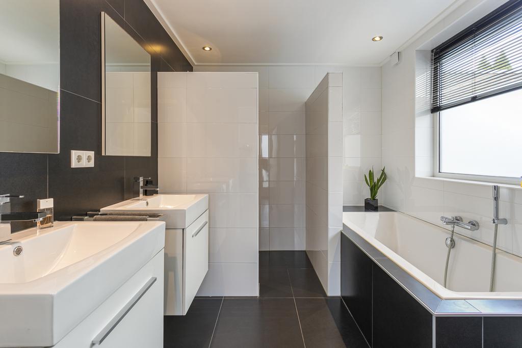 - Toilet, wastafel, wastafelmeubel, ligbad, dubbele wastafel, inloopdouche en vloerverwarming