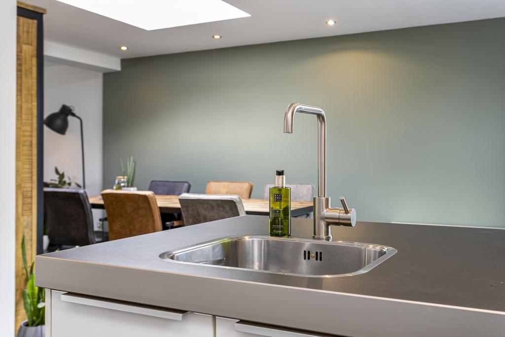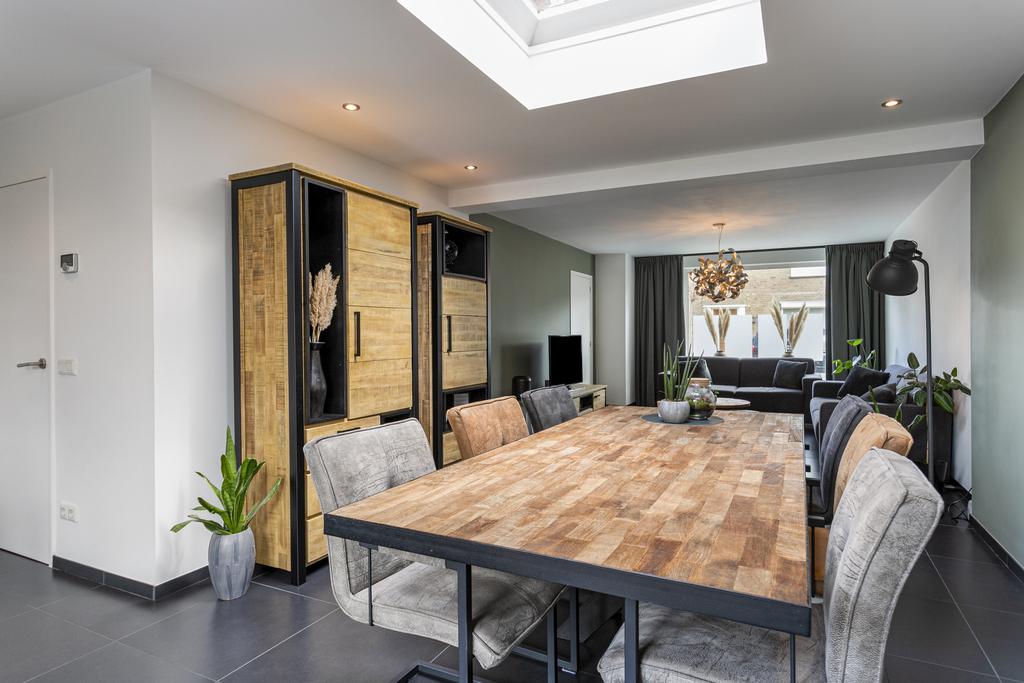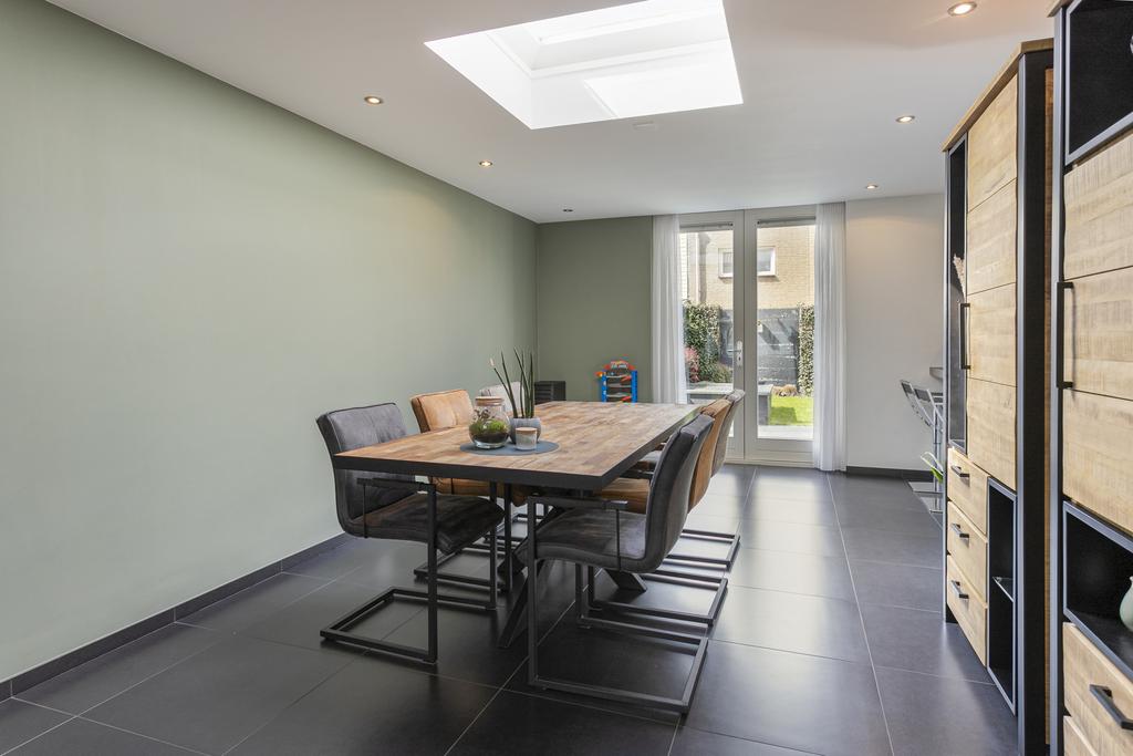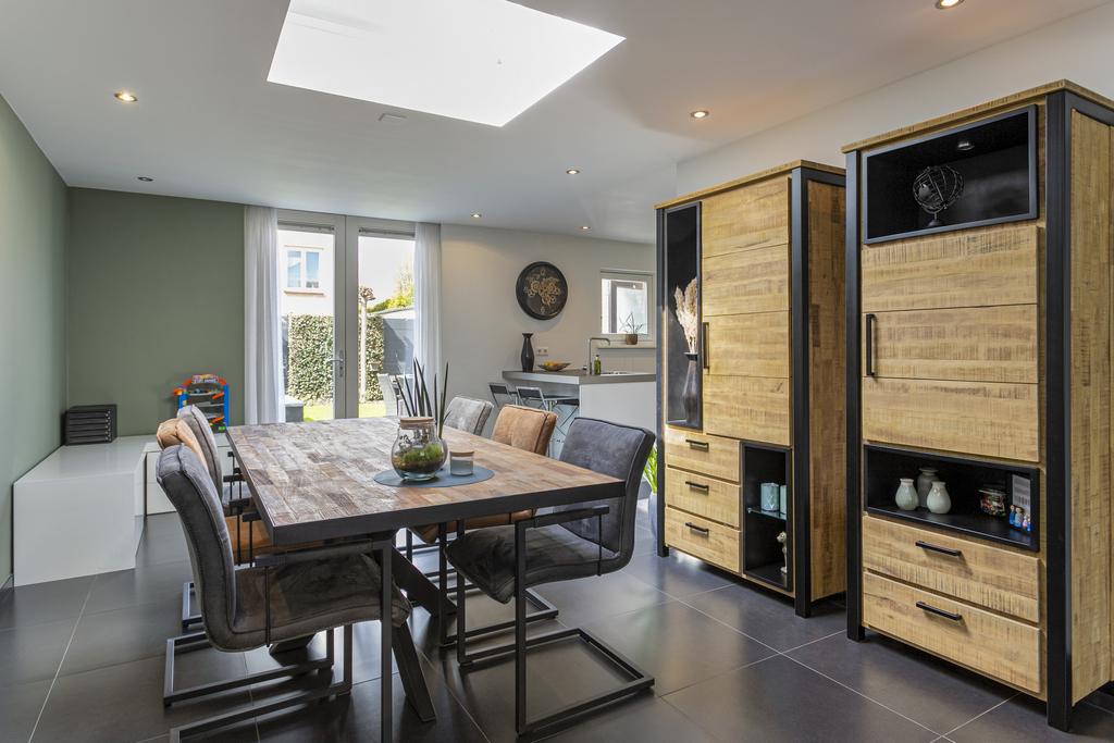 De woonkamer is ruim opgezet en heeft veel natuurlijke lichtinval door de grote raampartijen en lichtinval van de lichtkoepels die verwerkt zijn in het platte dak van de uitbouw. Zowel aan de voor- als achterzijde zijn gezellige hoeken te creëren. Het eetgedeelte is momenteel ingericht aan de achterzijde van de woning die aansluit op de keuken. De moderne keuken is voorzien van verschillende opbergkasten en inbouwapparatuur. Het spoeleiland in combinatie met de eetbar en de inbouwspots maken de keuken helemaal af. Het creëert een sfeervol en aangenaam gevoel in het eetgedeelte van de woning. De openslaande deuren geven toegang tot de fraai aangelegde tuin. Middels een loopdeur in de keuken bereikt u de hal die als inpandige berging kan fungeren, de hal geeft toegang tot het toilet met fonteintje en de garage. De diepe garage kan verschillende doeleinden dien. Hier is plaats voor auto's en fietsen en vinden we de cv-opstelling terug (bouwjaar 2022), dankzij de garagedeur met loopdeur is de garage zeer goed te betreden. Een ruimte die dus als garage en bergruimte kan fungeren. Met een oppervlakte van 35 vierkante meter is de garage daarnaast ook geschikt om bijvoorbeeld een slaapkamer of kantoor op de begane grond te realiseren. In combinatie met de badkamer op de begane grond ideaal om te wonen, ook voor op de langere termijn. De badkamer is volledig betegeld en voorzien van een ligbad. De badkamer is voorzien van een toilet en wastafel met meubel.