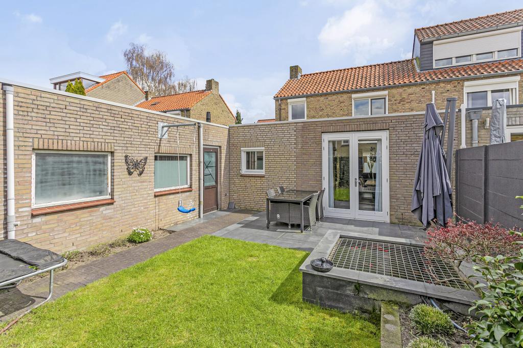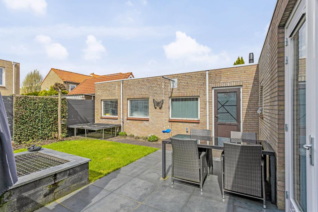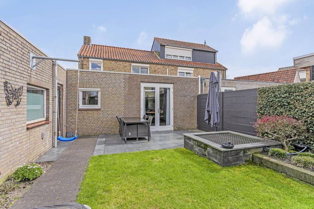 De fraai aangelegde achtertuin is gelegen op het westen, hierdoor geniet u vooral van de middag- en avondzon. Deze tuin kent veel diversiteit doormiddel van een terras, sierbestrating, gazon, bloemborder en afgeschermde vijver.