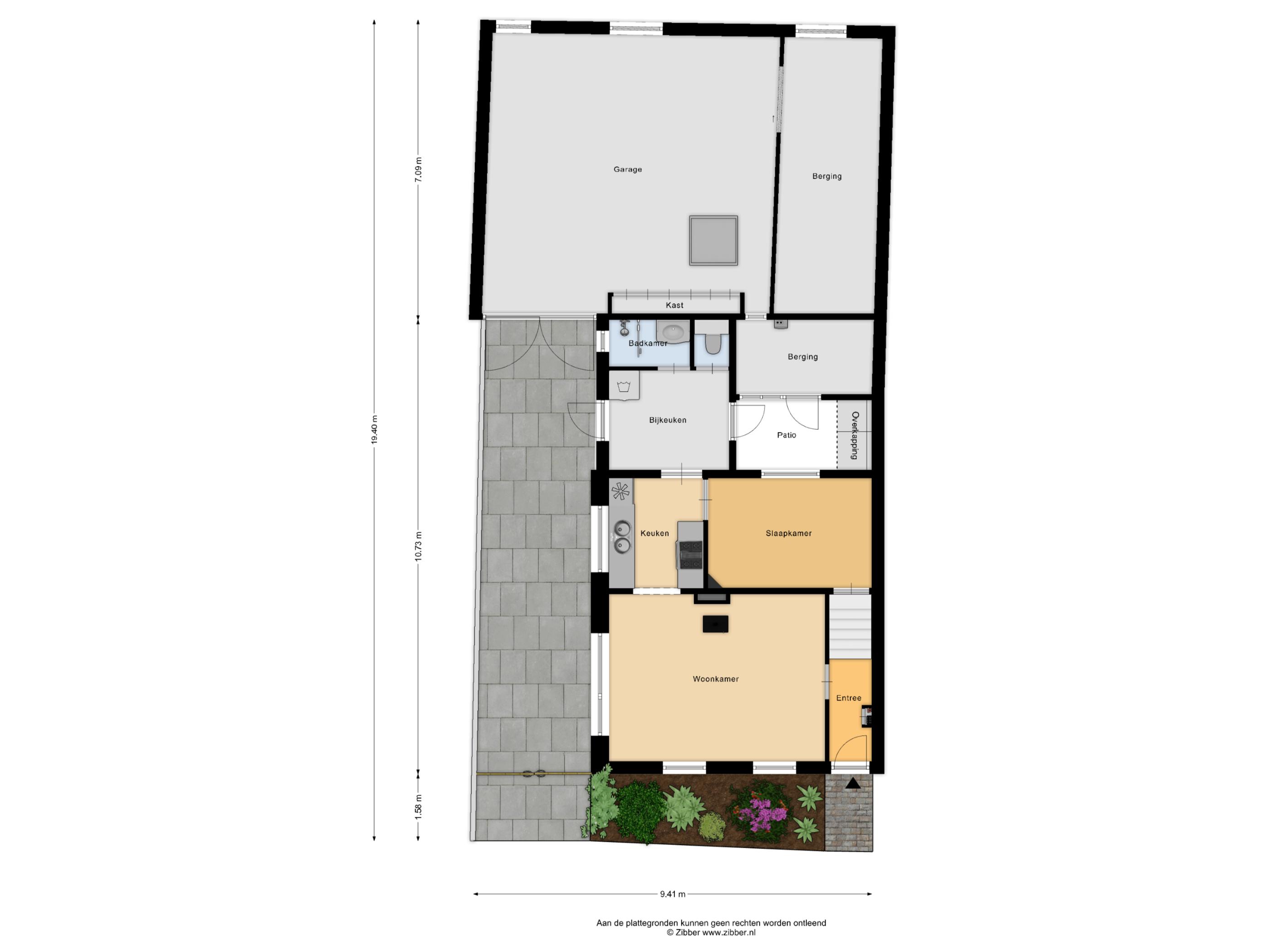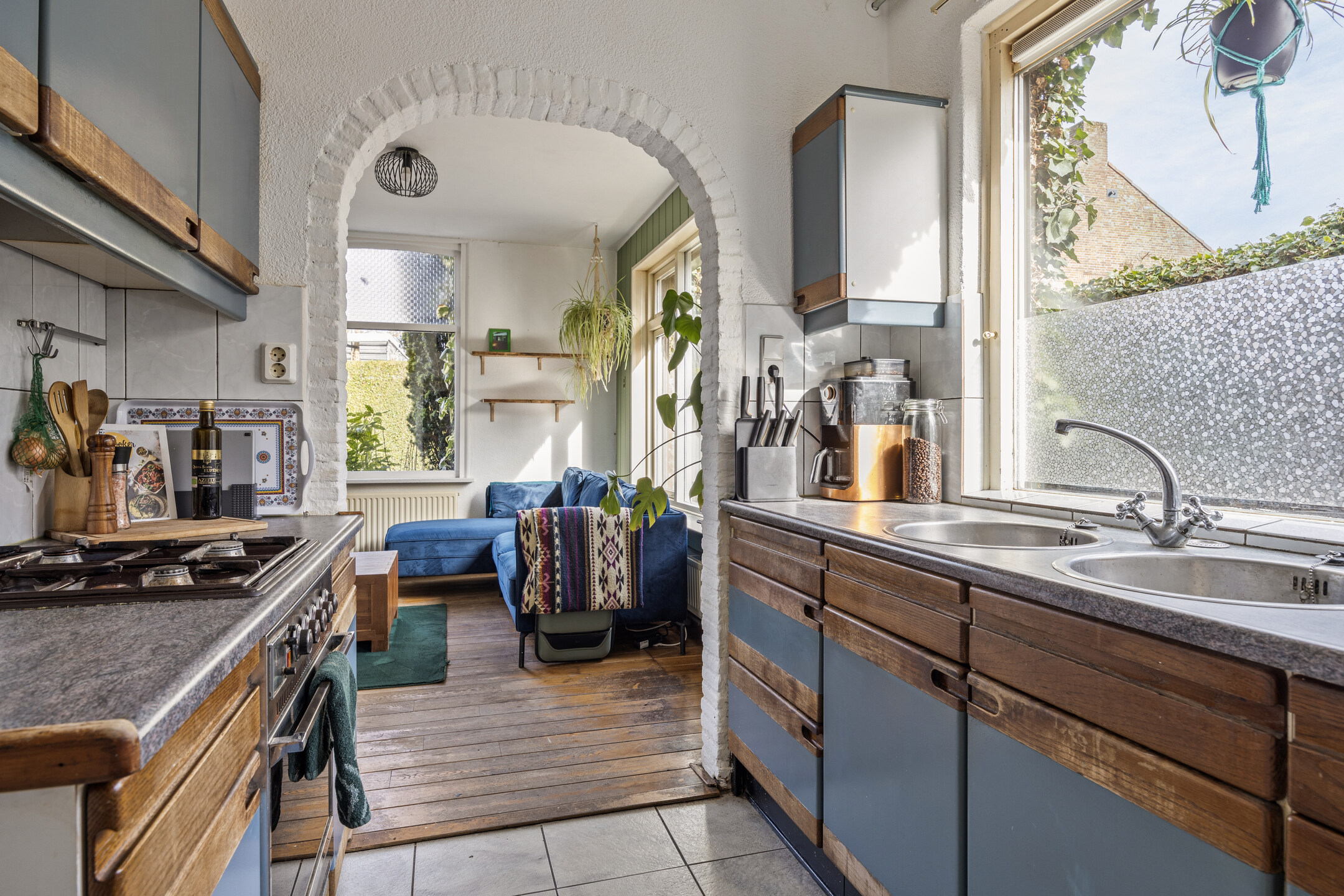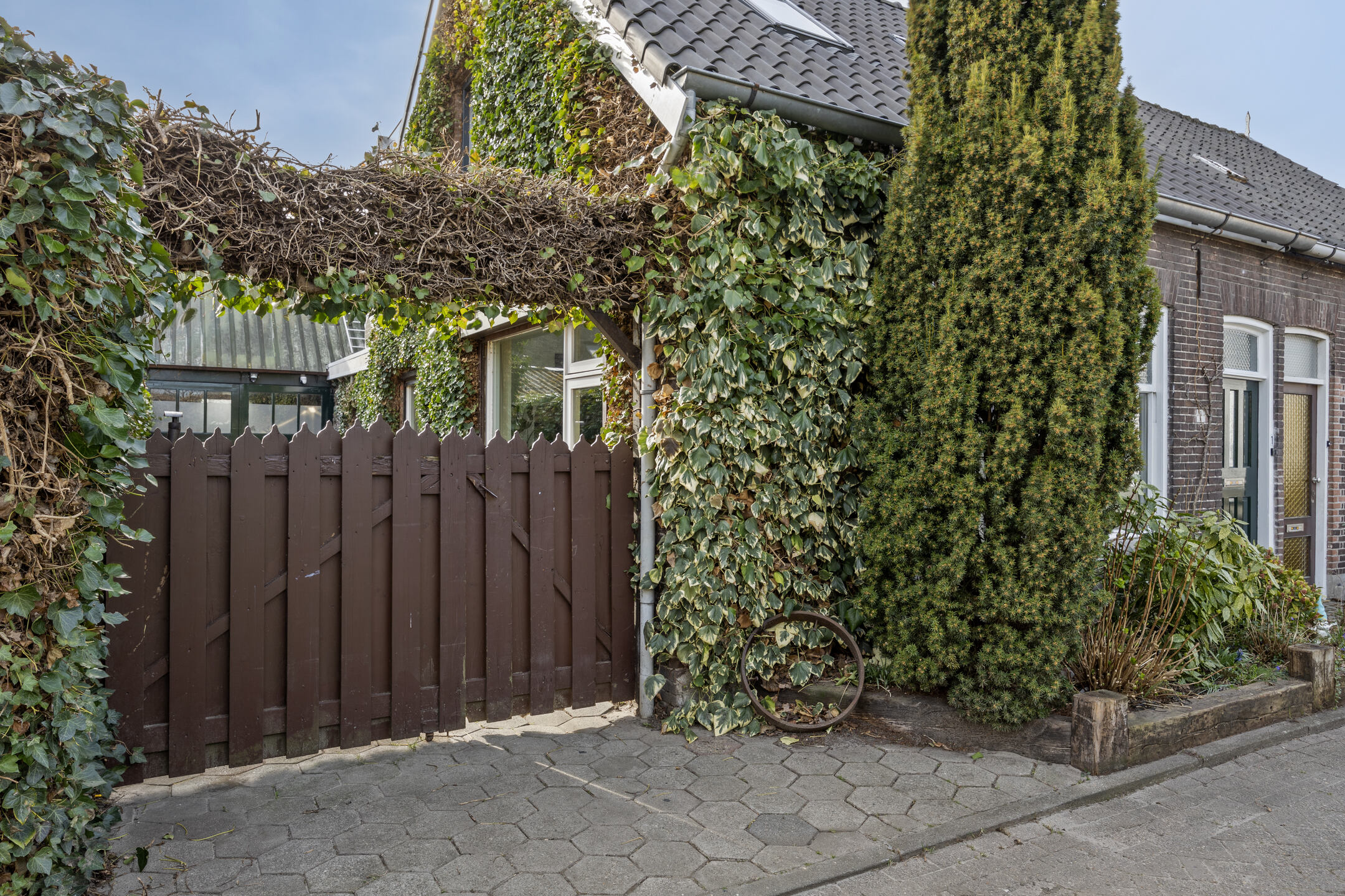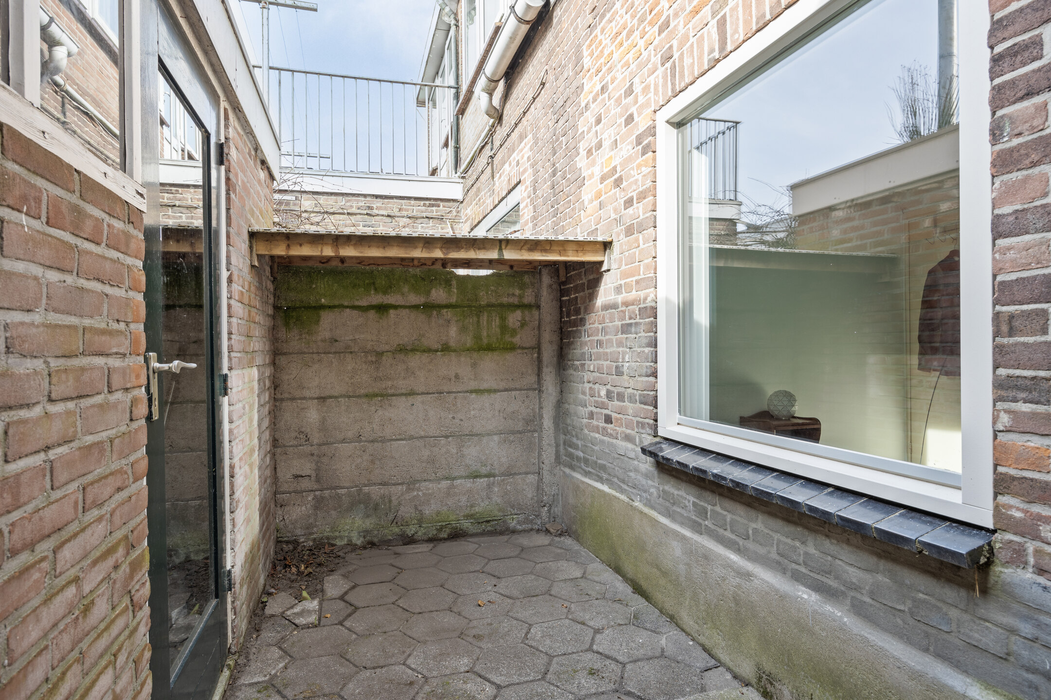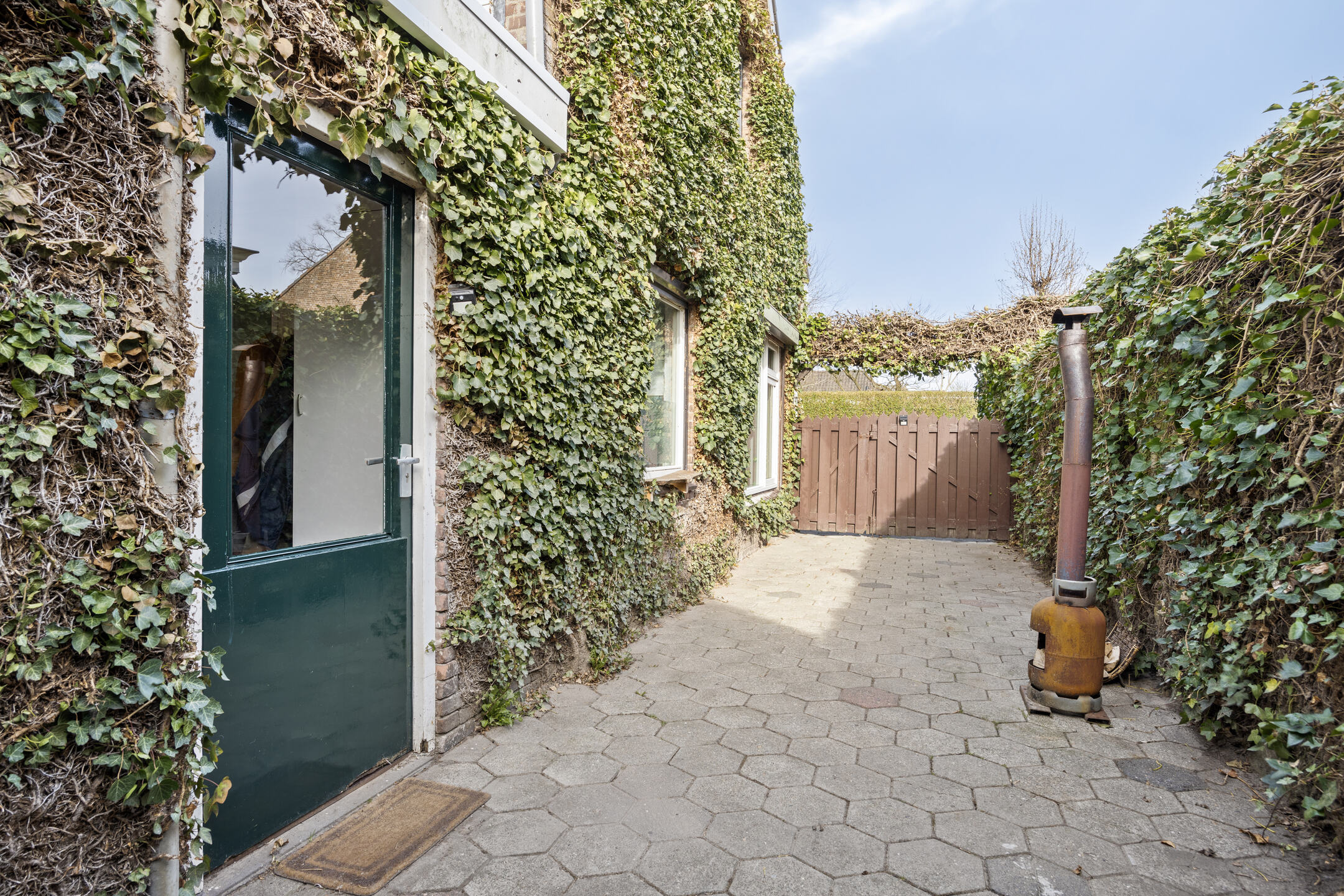 Vanuit de bijkeuken is de buitenruimte aan beide zijden van de woning toegankelijk. Aan de ene zijde vind je een sfeervolle patio, voorzien van een kleine overkapping. De patio biedt ook directe toegang tot de stenen berging, ideaal voor extra opbergruimte. Aan de andere zijde van de bijkeuken betreden we de rustige binnenplaats aan de achterzijde van de woning.