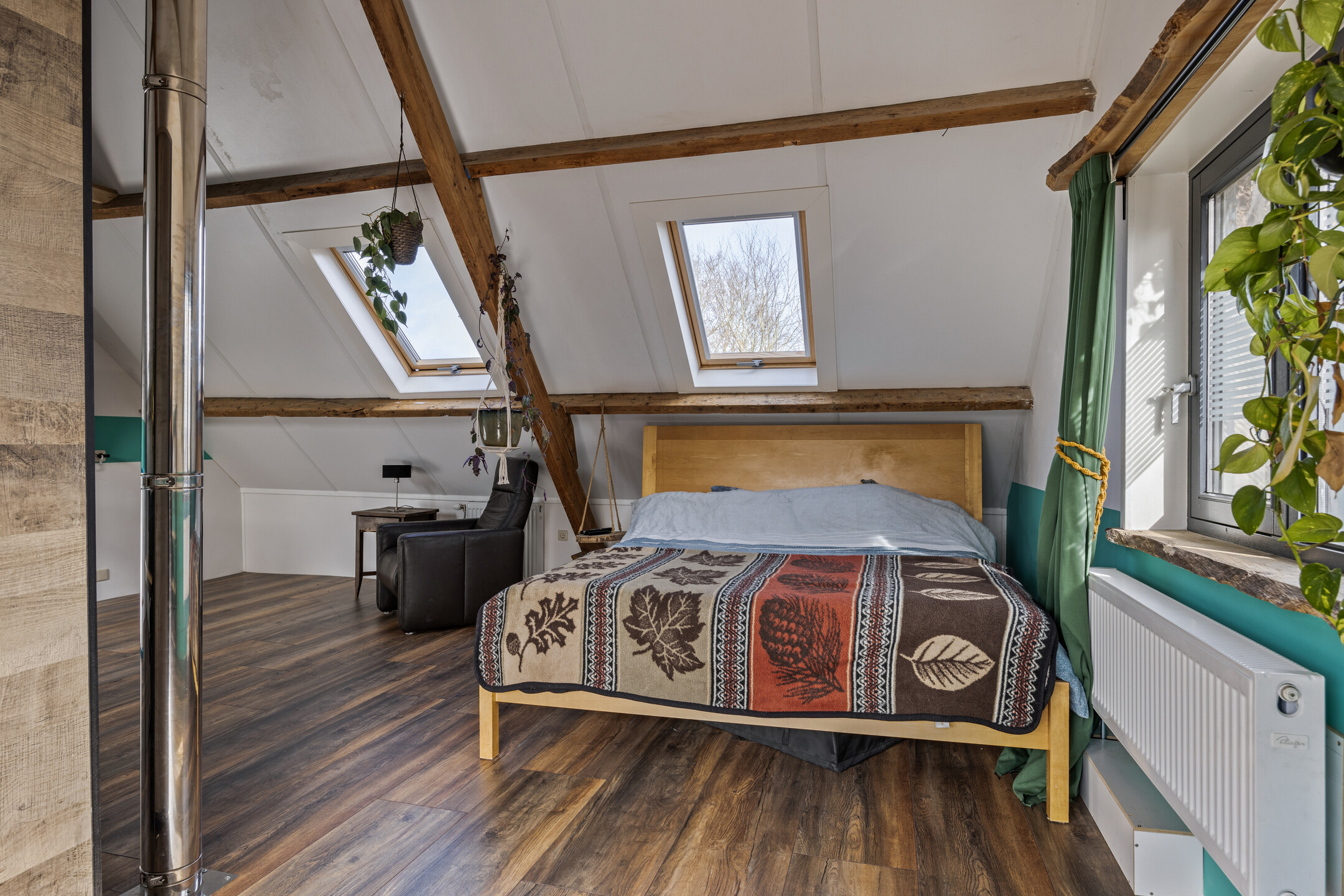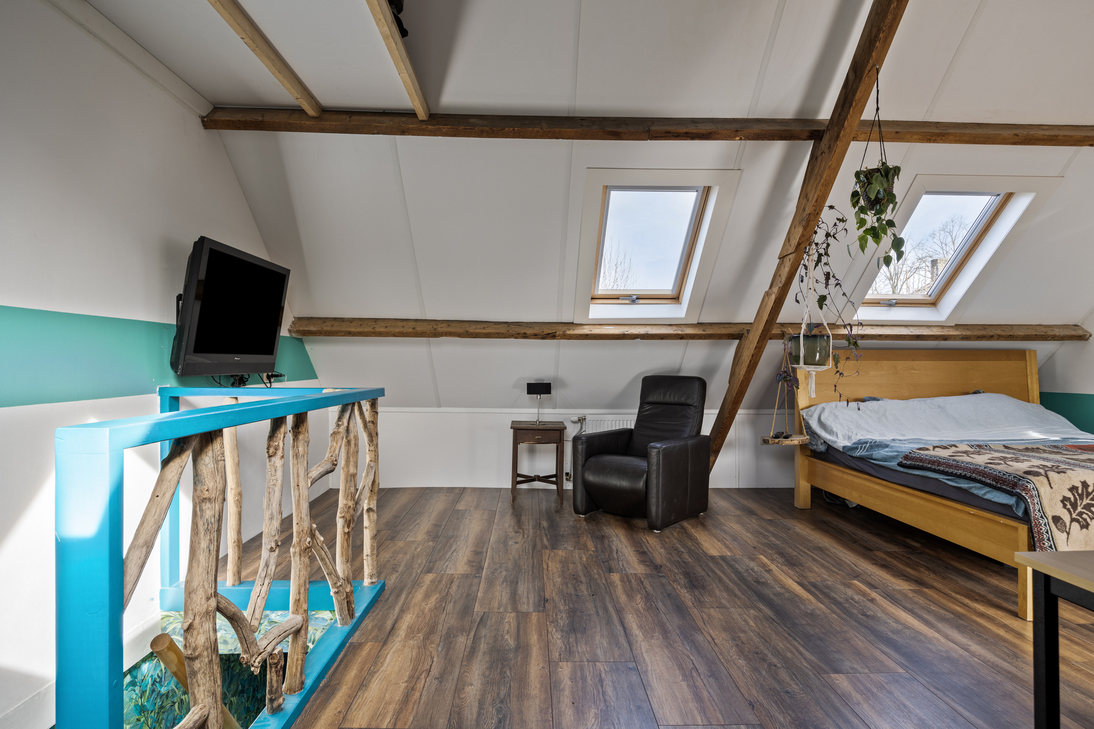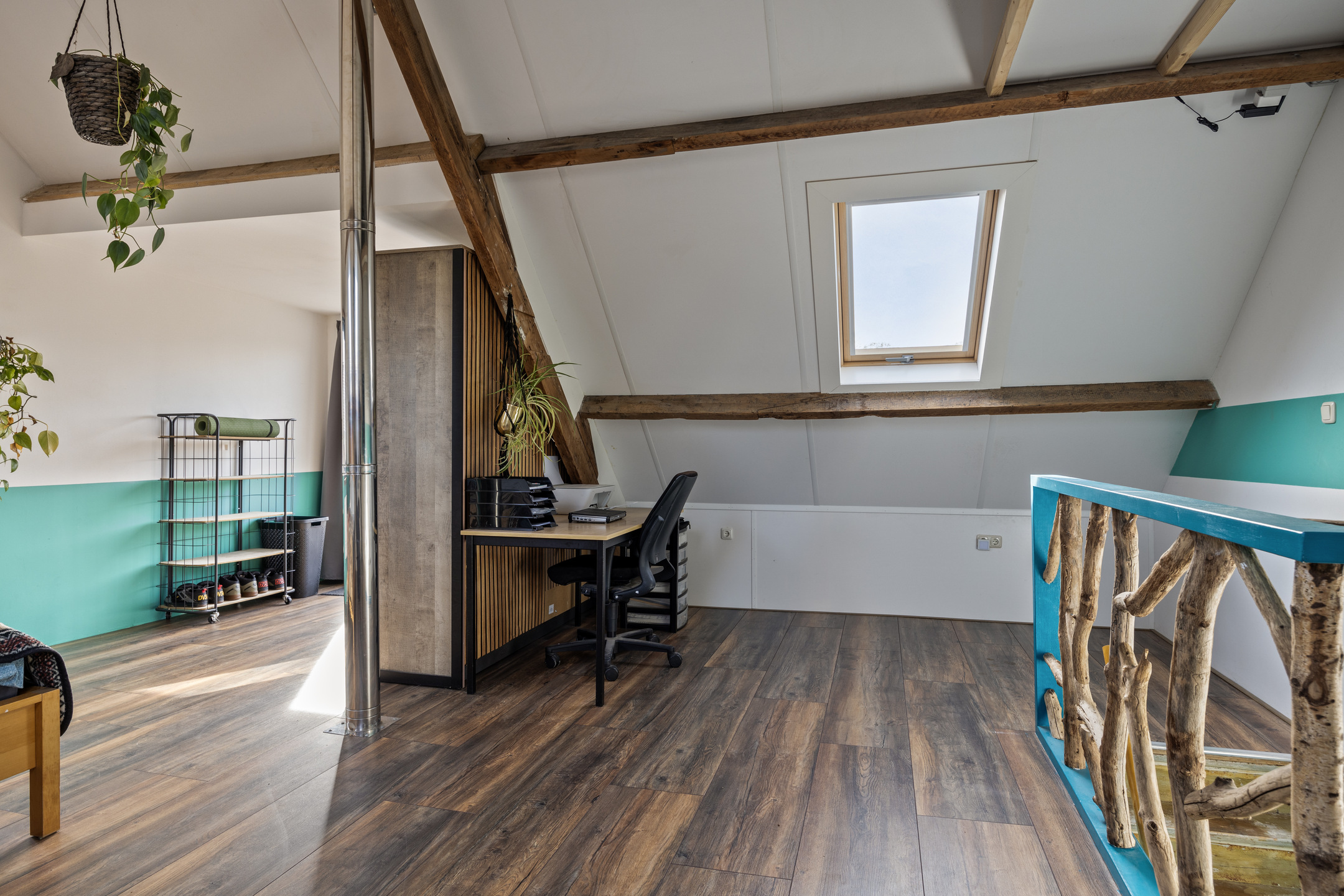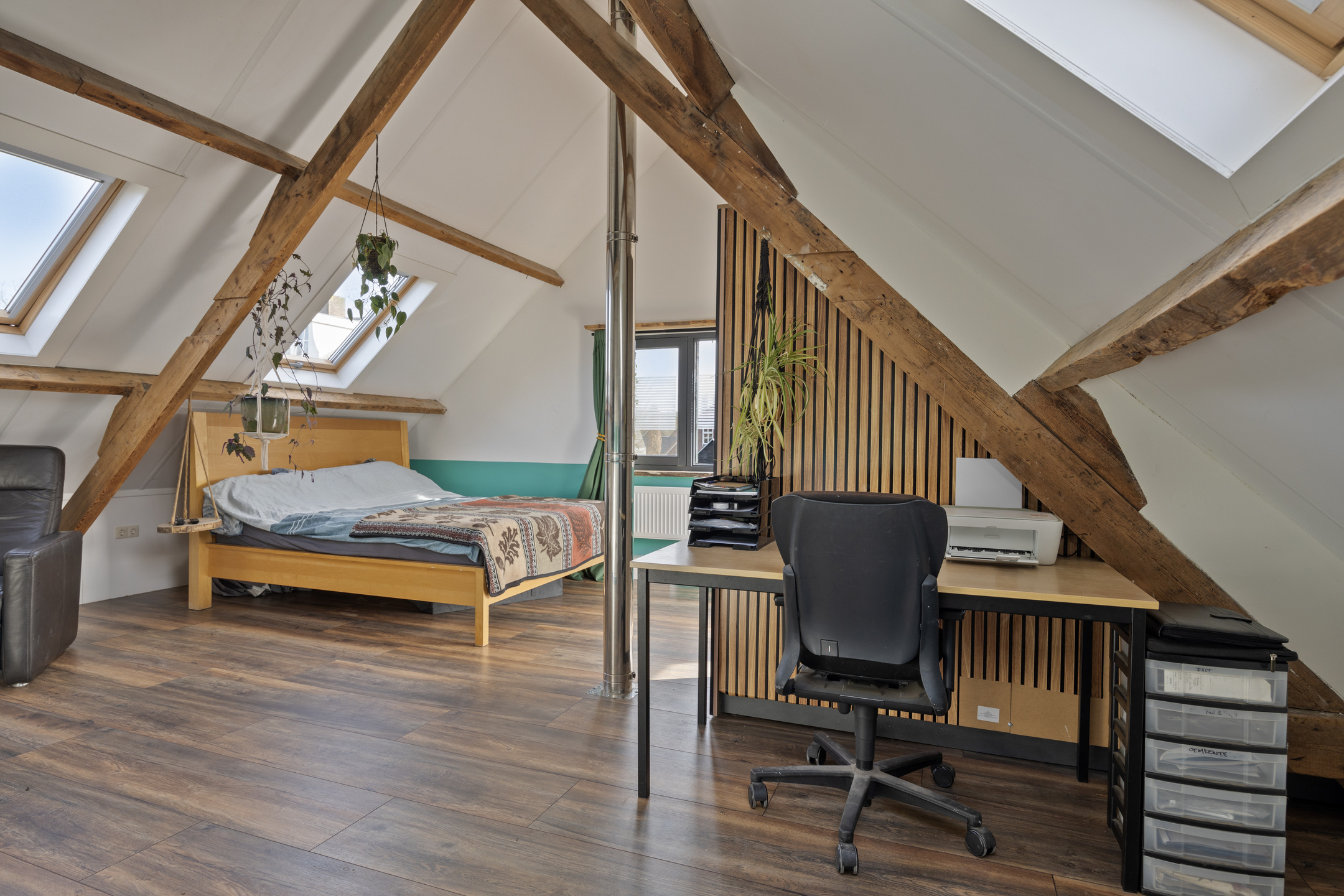 Via de vaste trap in de hal bereiken we de volwaardige en recent gerenoveerde eerste verdieping. Deze ruimte biedt momenteel plaats aan een royale slaapkamer in combinatie met een werkkamer, maar biedt volop mogelijkheden om naar eigen wens in te richten. De ruimte is afgewerkt met een nette houtlook laminaatvloer en wordt verlicht door grote Velux dakramen, waardoor er veel natuurlijk licht binnenkomt. De prachtige houten balken in het plafond geven de kamer extra charme. Om de ruimte helemaal af te maken, is er via de schuifpui toegang tot een sfeervol zonneterras. Dit terras is gelegen op het platte dak en is voorzien van een nieuwe kunststof vlonder, wat het een moderne uitstraling geeft. Deze extra buitenruimte biedt meerdere mogelijkheden en is ruim genoeg voor het plaatsen van een gezellige loungeset, perfect om te genieten van de zon of een moment van ontspanning.