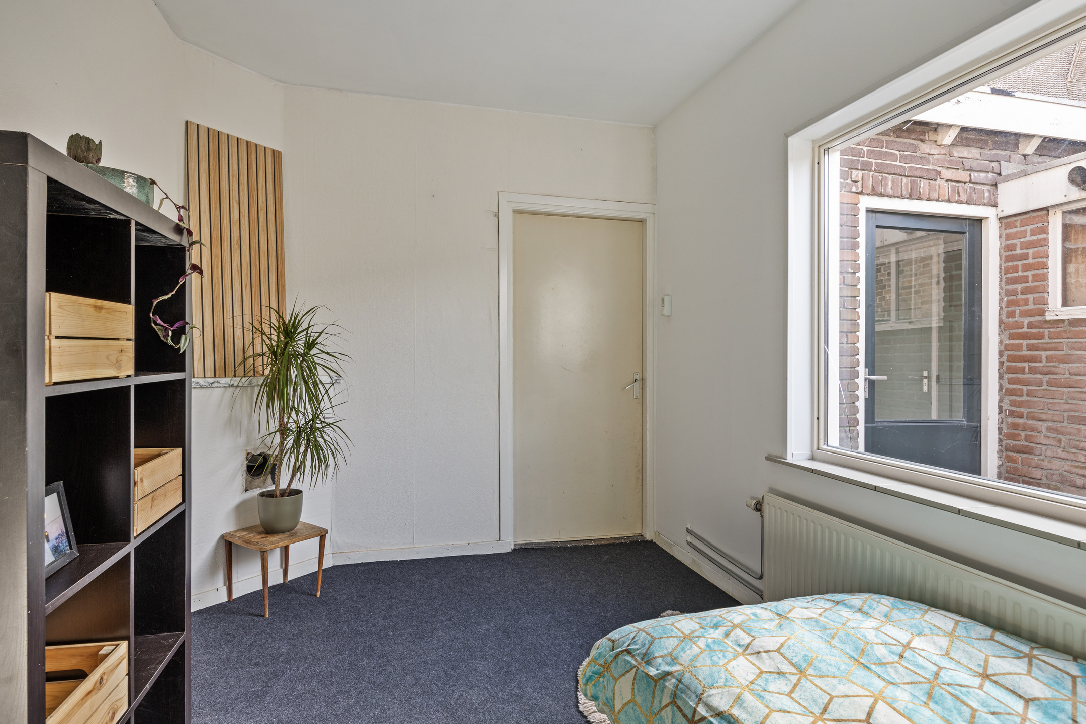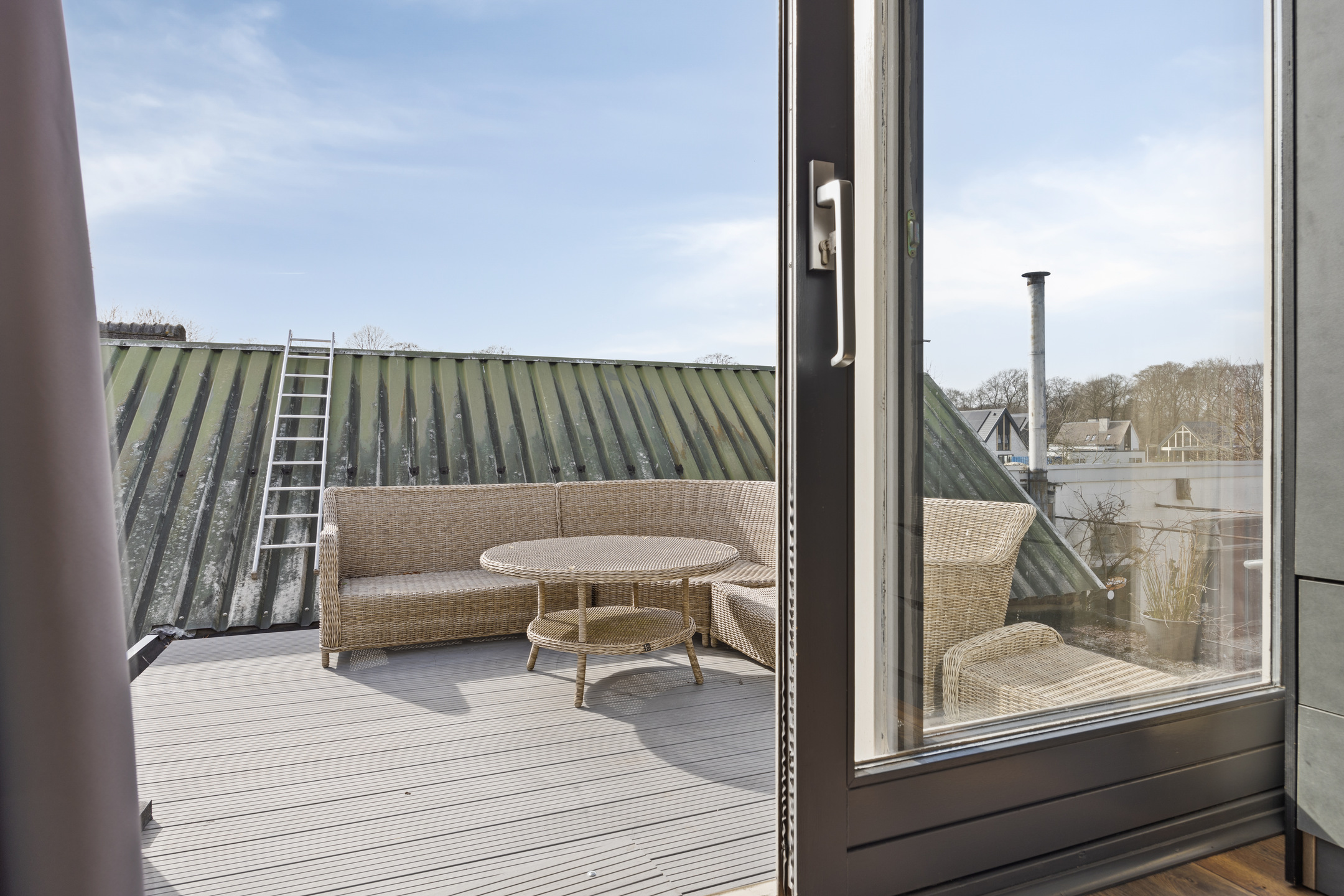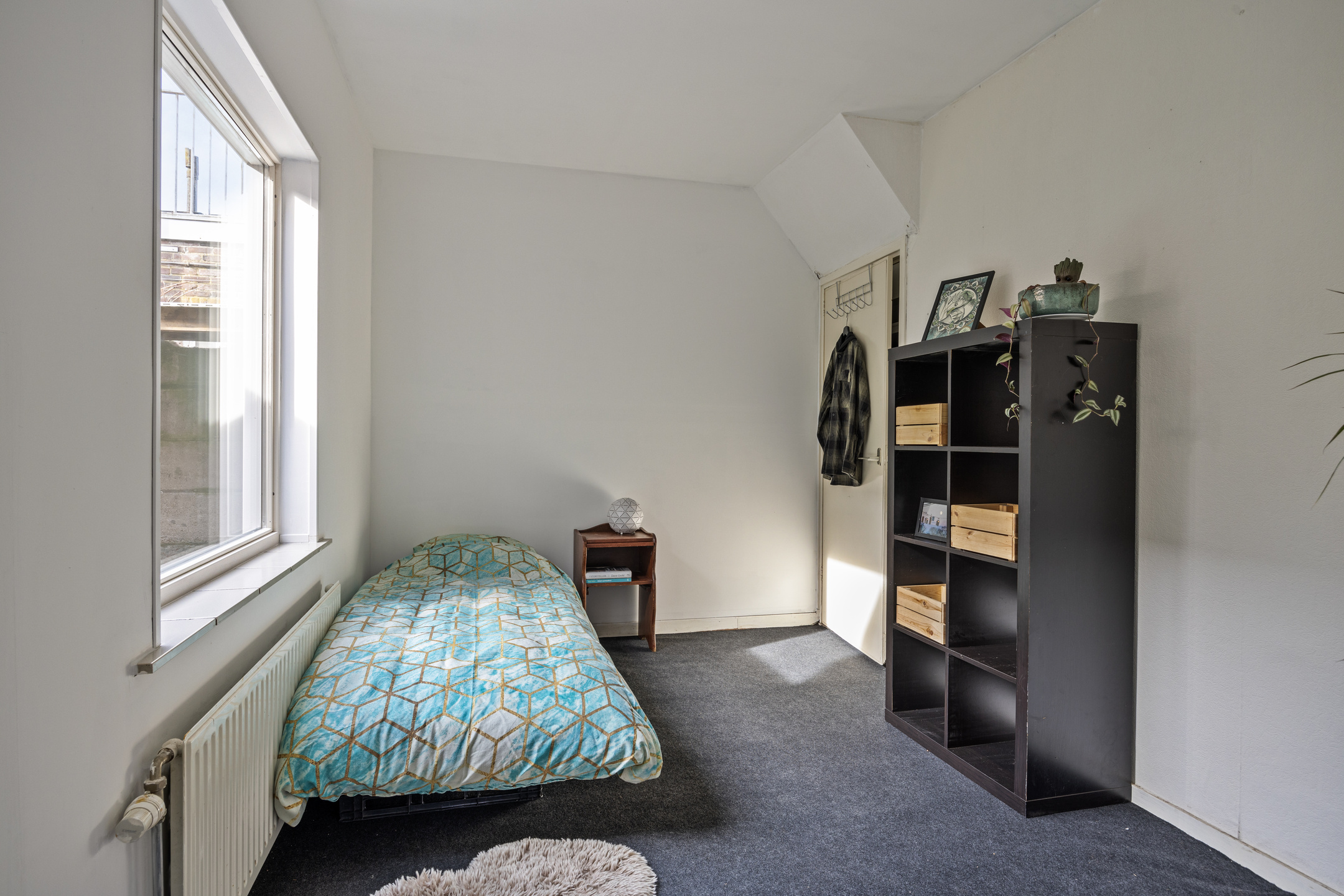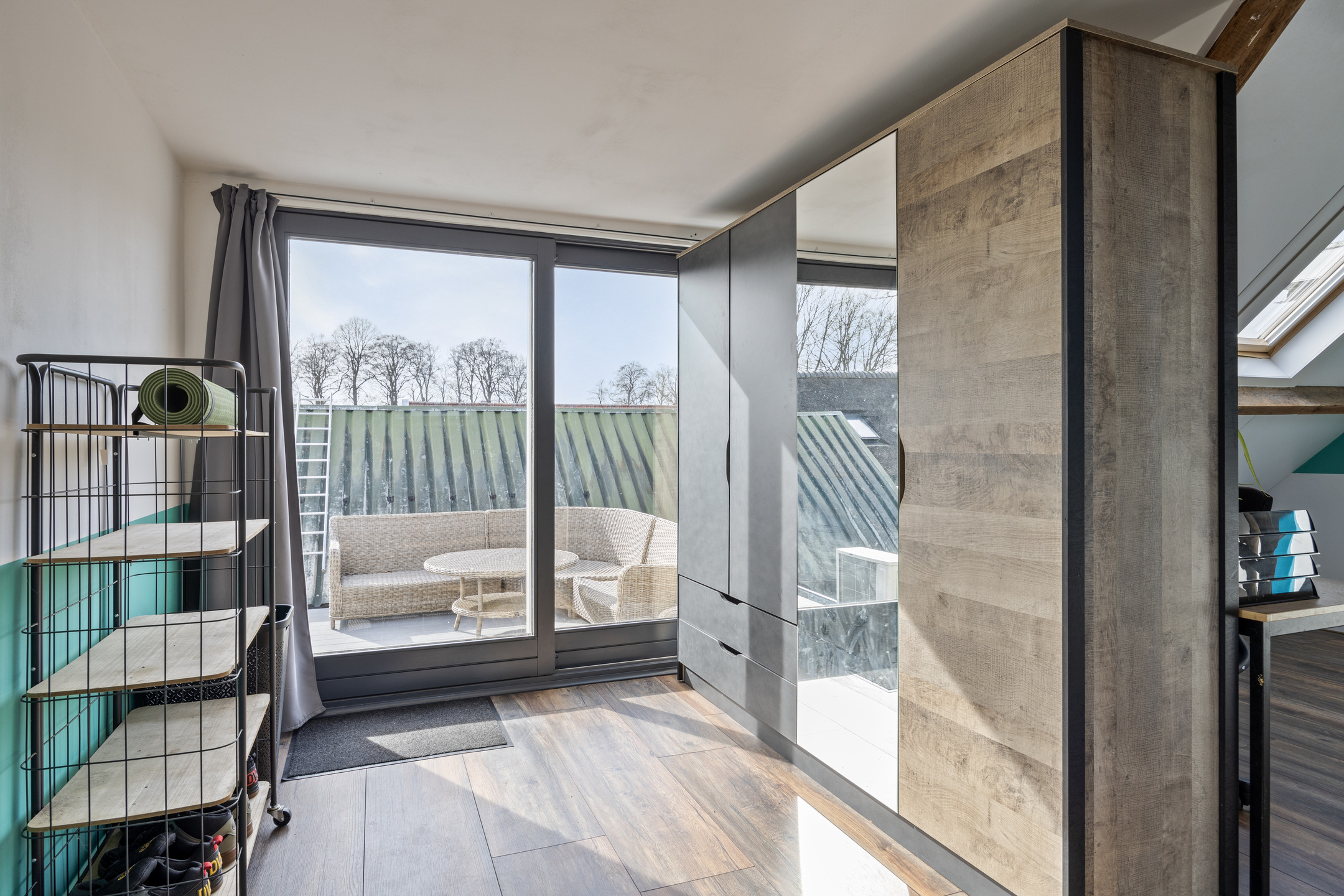 Via de vaste trap in de hal bereiken we de volwaardige en recent gerenoveerde eerste verdieping. Deze ruimte biedt momenteel plaats aan een royale slaapkamer in combinatie met een werkkamer, maar biedt volop mogelijkheden om naar eigen wens in te richten. De ruimte is afgewerkt met een nette houtlook laminaatvloer en wordt verlicht door grote Velux dakramen, waardoor er veel natuurlijk licht binnenkomt. De prachtige houten balken in het plafond geven de kamer extra charme. Om de ruimte helemaal af te maken, is er via de schuifpui toegang tot een sfeervol zonneterras. Dit terras is gelegen op het platte dak en is voorzien van een nieuwe kunststof vlonder, wat het een moderne uitstraling geeft. Deze extra buitenruimte biedt meerdere mogelijkheden en is ruim genoeg voor het plaatsen van een gezellige loungeset, perfect om te genieten van de zon of een moment van ontspanning.