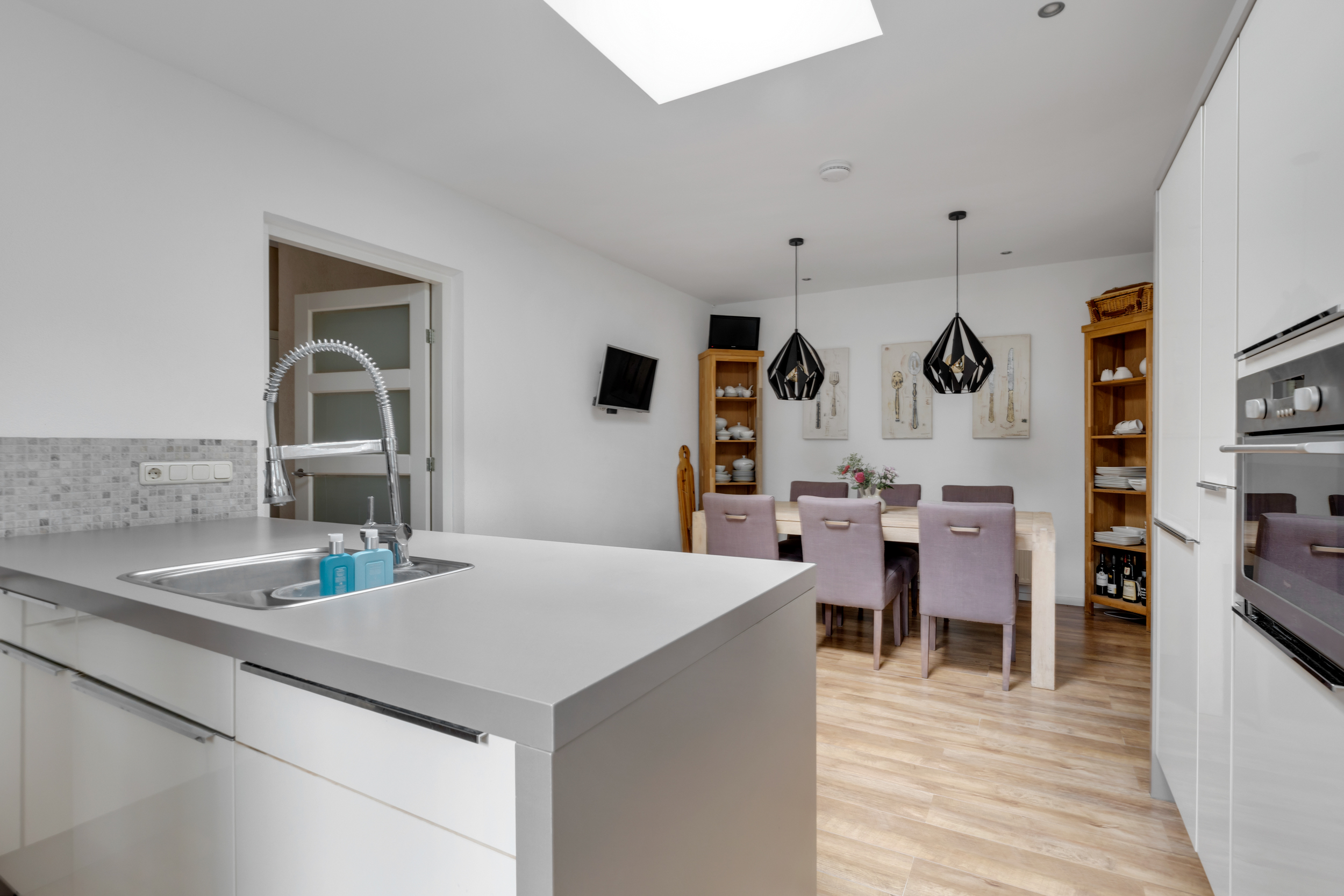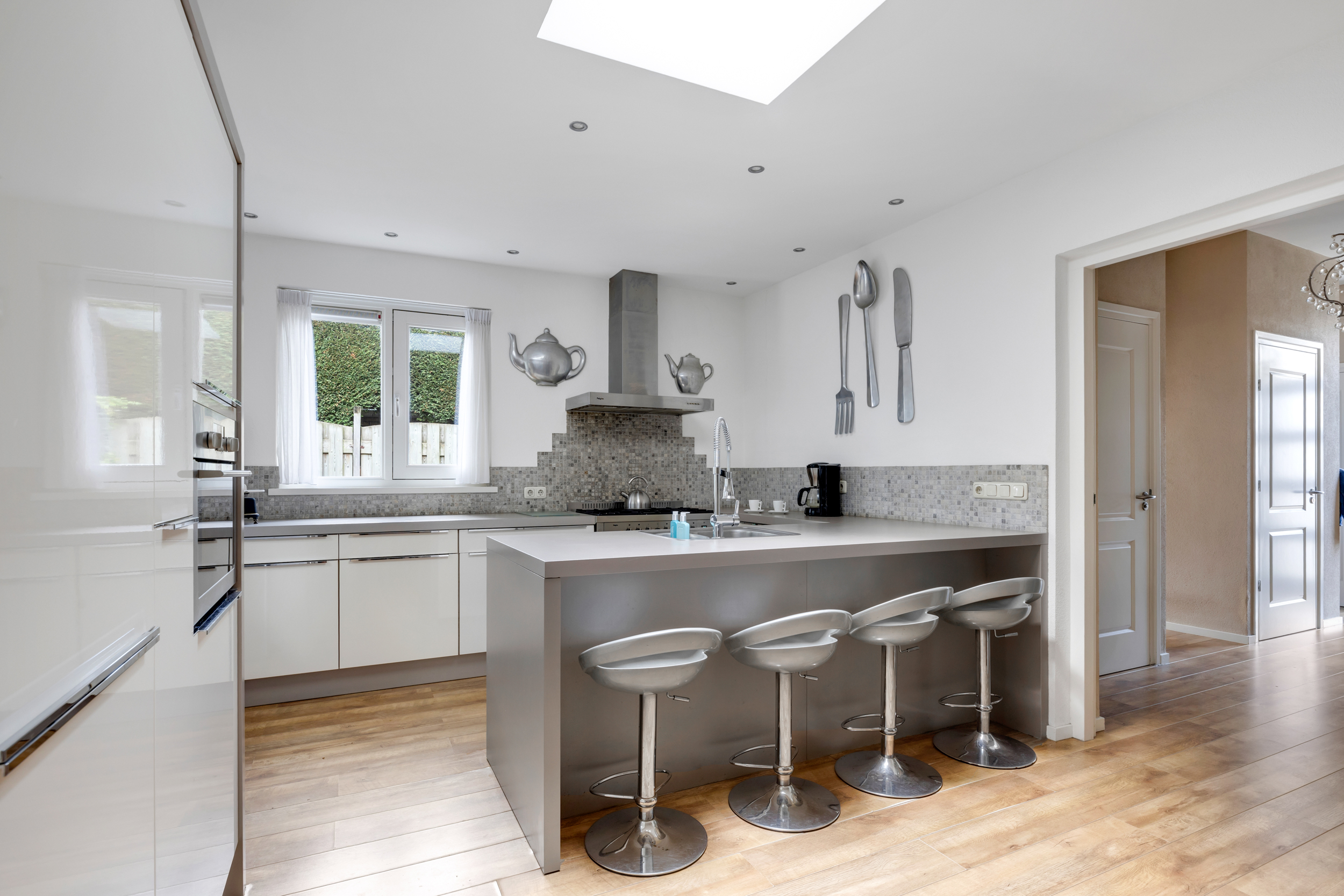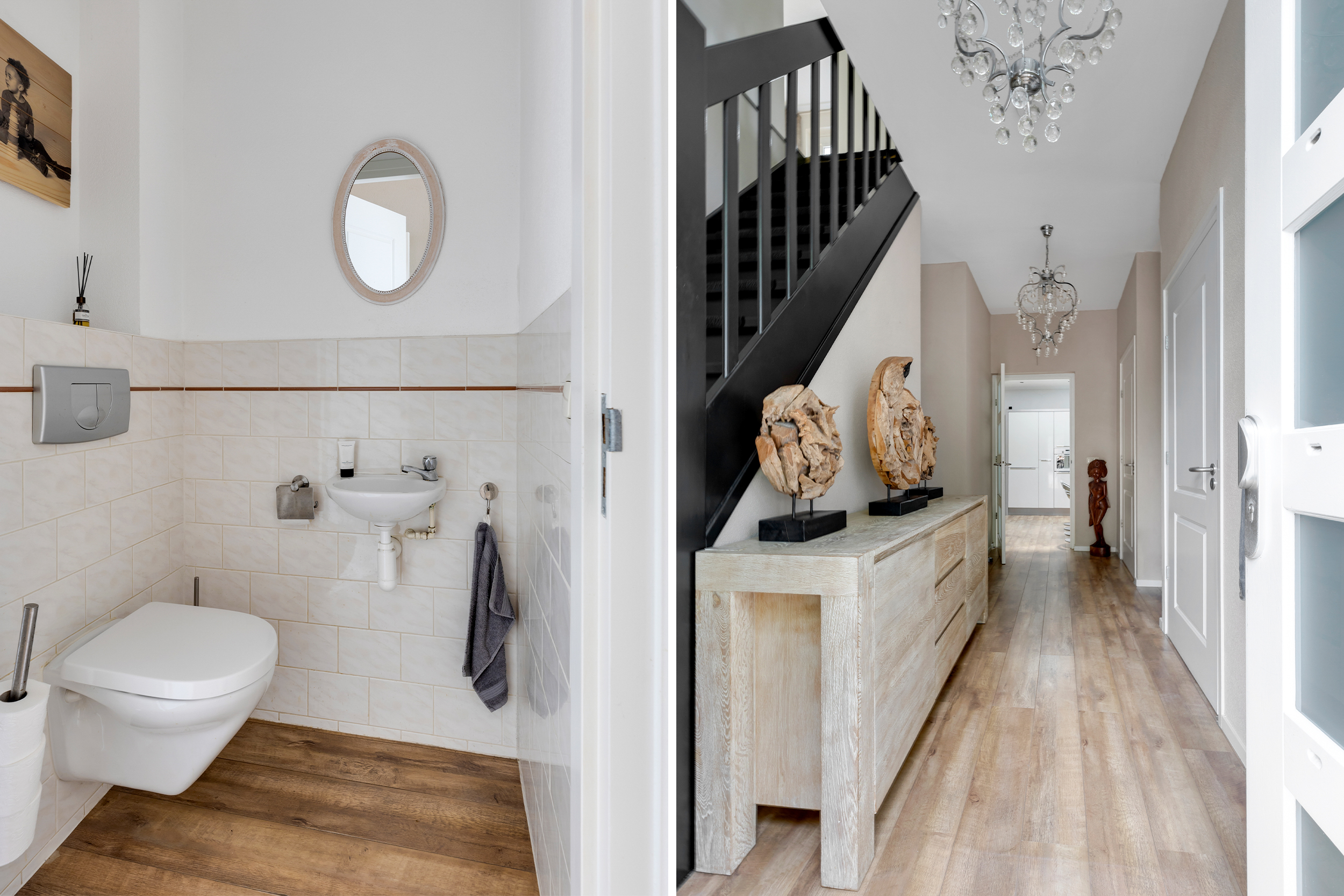 Via de oprit voor meerdere auto's komen we bij de voordeur. In de ruime hal tref je de moderne toiletruimte met wandcloset en fonteintje, praktische garderobekast en een doorgang naar de werk-/speelkamer, de kelder en de leefkeuken. De hal is afgewerkt met een laminaatvloer en strak gestuucte wanden en plafond. Een modern afwerkingsniveau wat je ook in de rest van de woning zult terug zien.