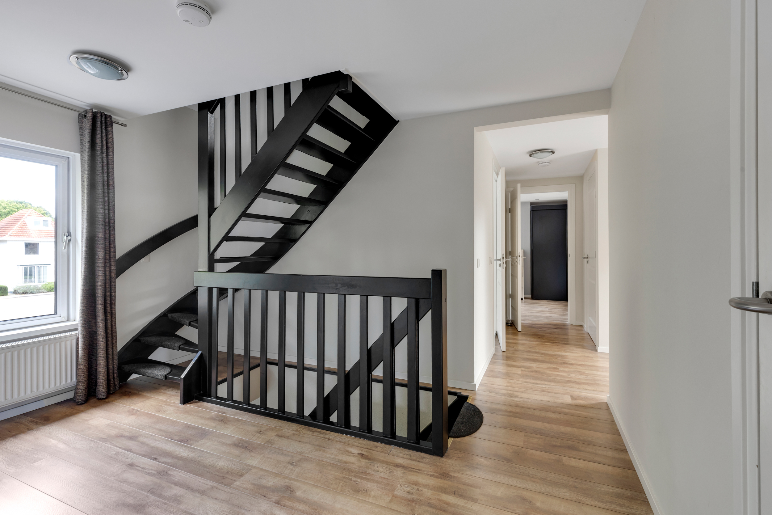 Ruime overloop met toegang tot twee grote slaapkamers van ruim 17 m2 en 20 m2, waarvan één slaapkamer beschikt over een balkonnetje. Desgewenst is deze slaapkamer eenvoudig op te splitsen in 2 slaapkamers. De moderne, zeer royale badkamer is uitgerust met een ligbad, wastafelmeubel en een inloopdouche met hand- en regendouche. Een raam biedt daglicht en ventilatie. Ook is er nog een separate toiletruimte en een flinke wasruimte met de aansluitingen voor de wasapparatuur en opstelling van de combiketel. Ook deze verdieping is afgewerkt met stucwerkwanden en plafonds en een mooie laminaatvloer.