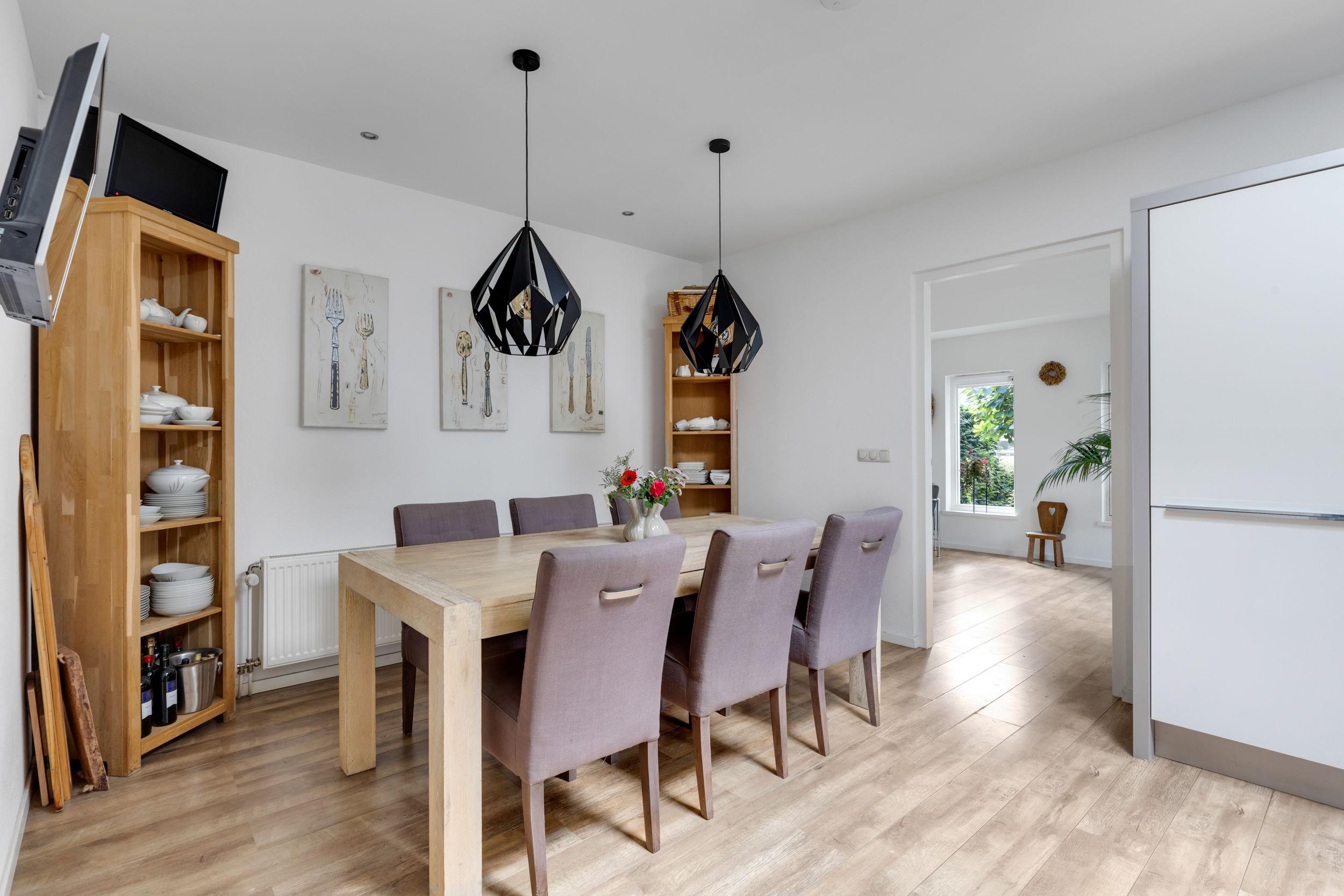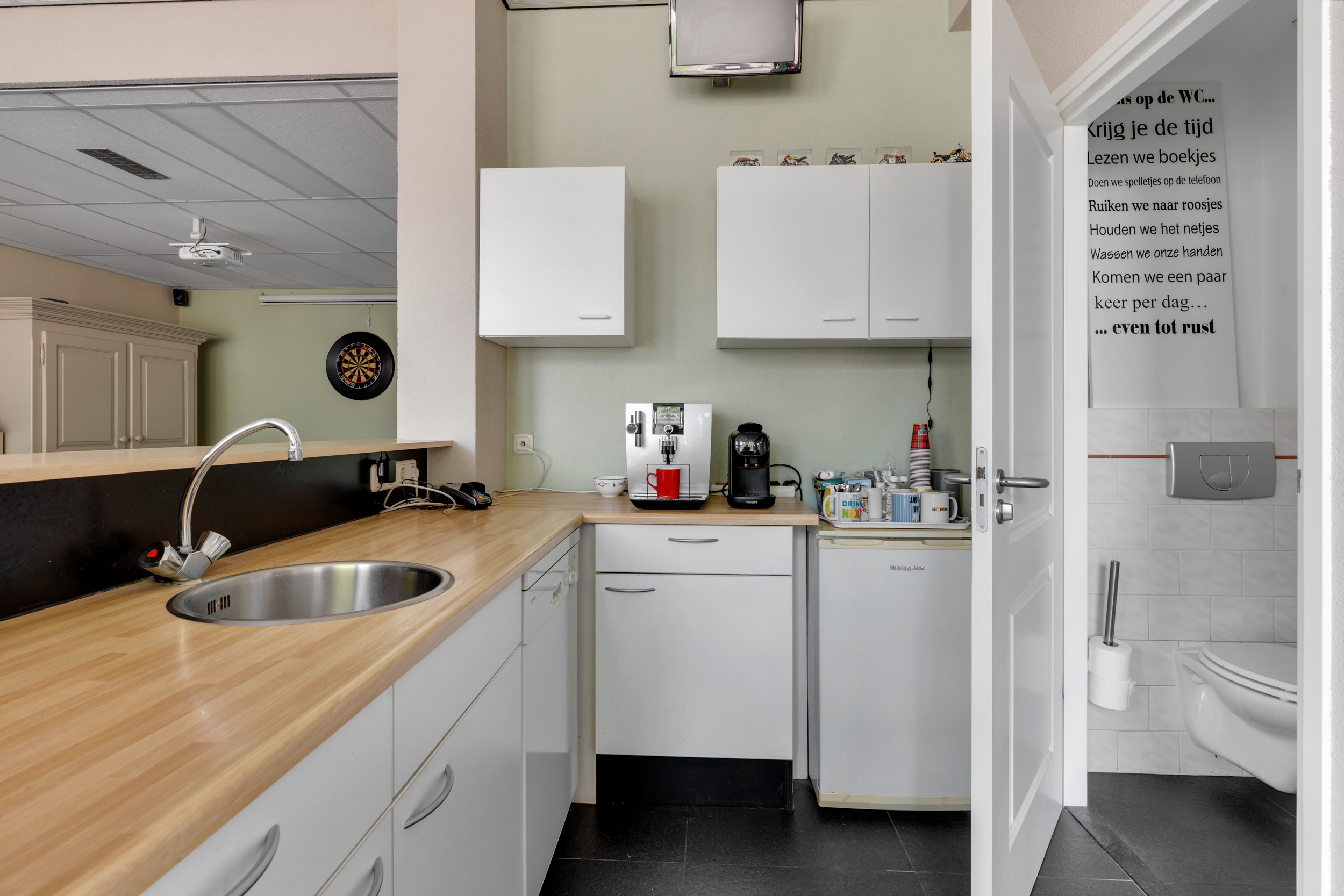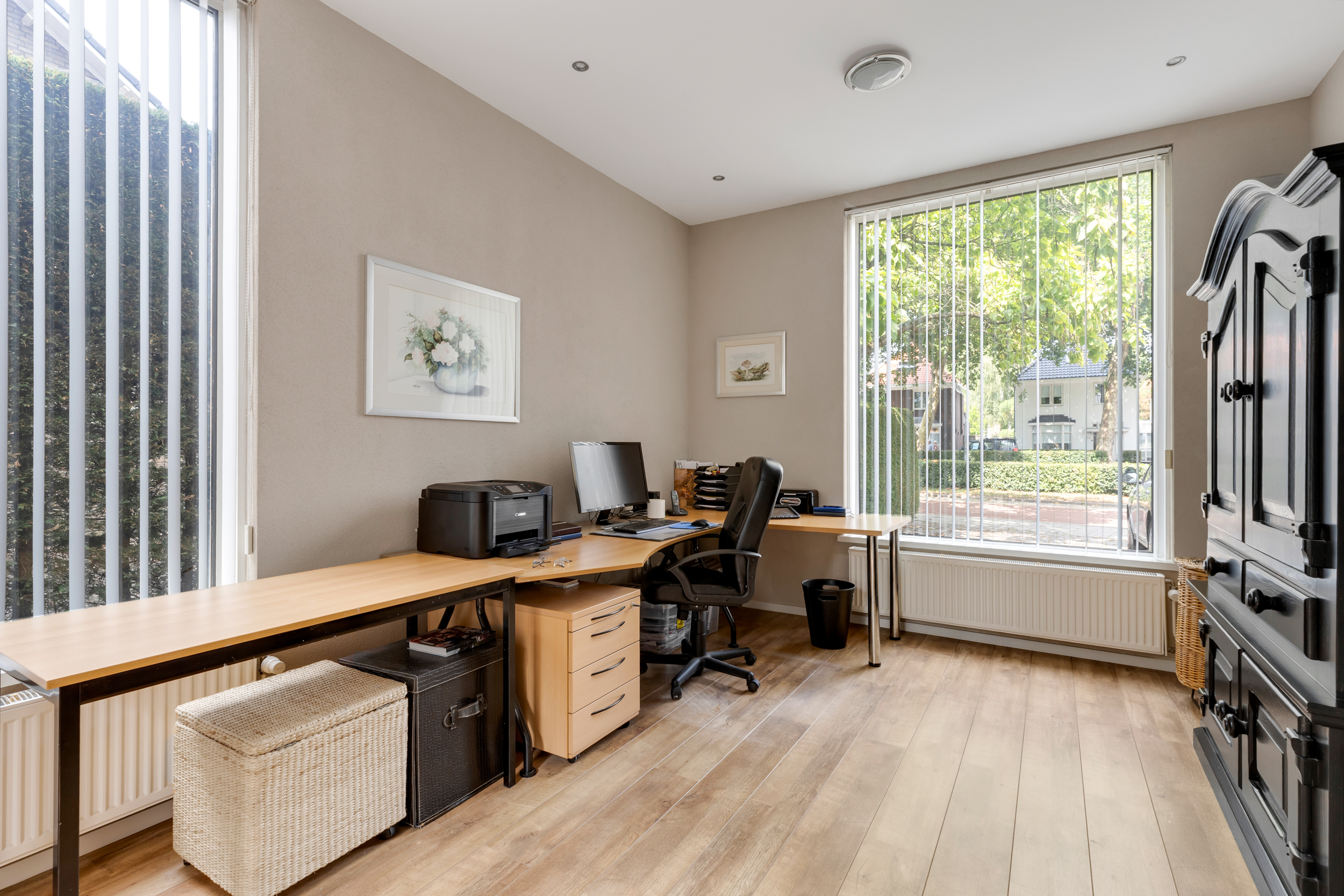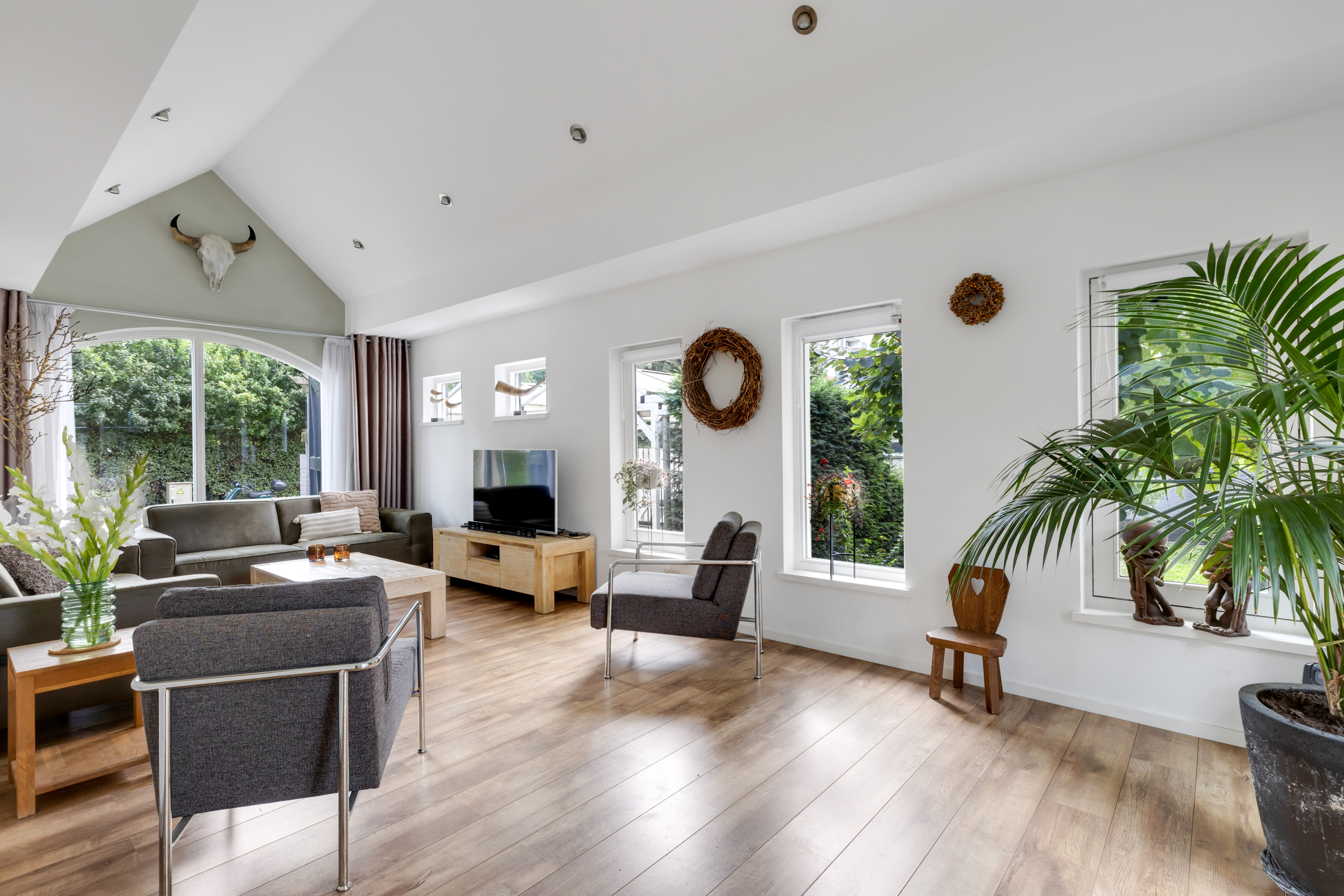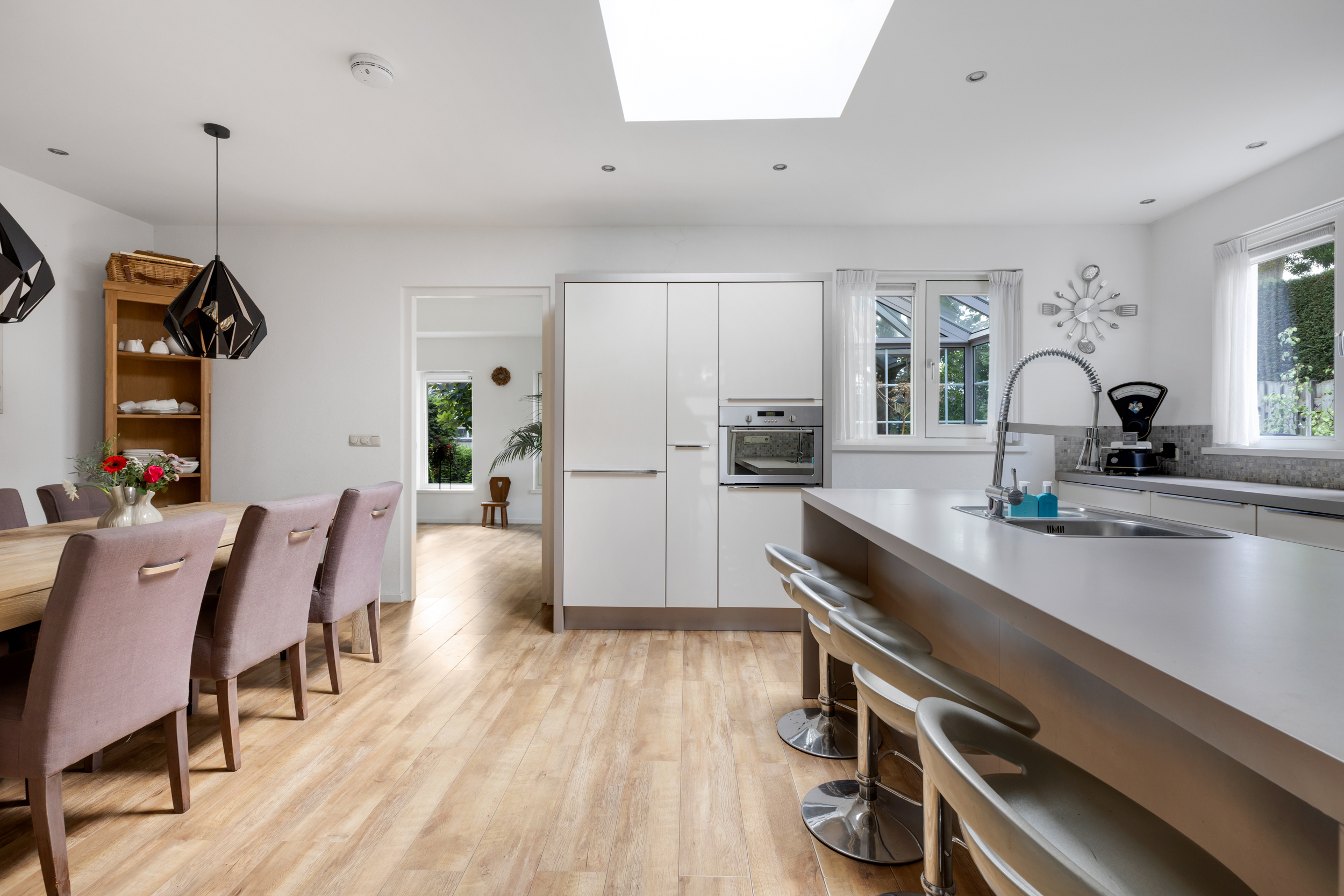 De ruime woonkeuken is ingericht met een royaal U-vormig meubel met gezellige bar en een separaat wandmeubel, beide met diverse inbouwapparatuur. Een groot daklicht zorgt voor extra lichtinval en het plafond is afgewerkt met inbouwspots. Aansluitend aan de leefkeuken bevindt zich de woonkamer met mooi uitzicht over de tuin, speels puntvormig plafond, een fijne lichtinval door de grote raampartijen en openslaande deuren naar de serre. Deze heerlijke, lichte ruimte biedt de mogelijkheid om een groot deel jaar extra van het buitenleven te genieten. Momenteel is een gedeelte van de begane grond in gebruik als kantoor met een keukenblok, toilet en een eigen voordeur. Middels een eenvoudige ingreep is een wel heel riante woonkamer te realiseren met legio indelingsmogelijkheden.