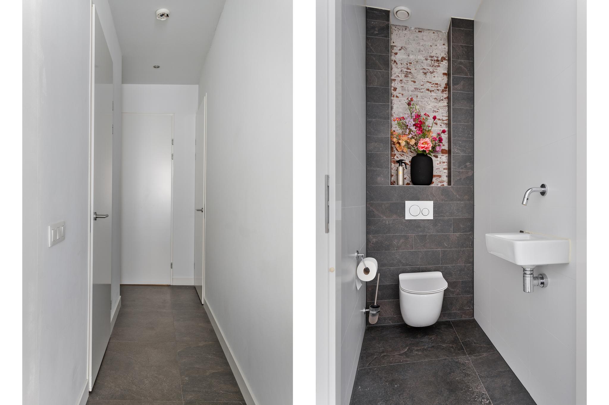 De toiletruimte is strak afgewerkt en voorzien van een hangend toilet en fonteintje. In een aparte ruimte is de wasmachineaansluiting en CV combiketel weggewerkt.