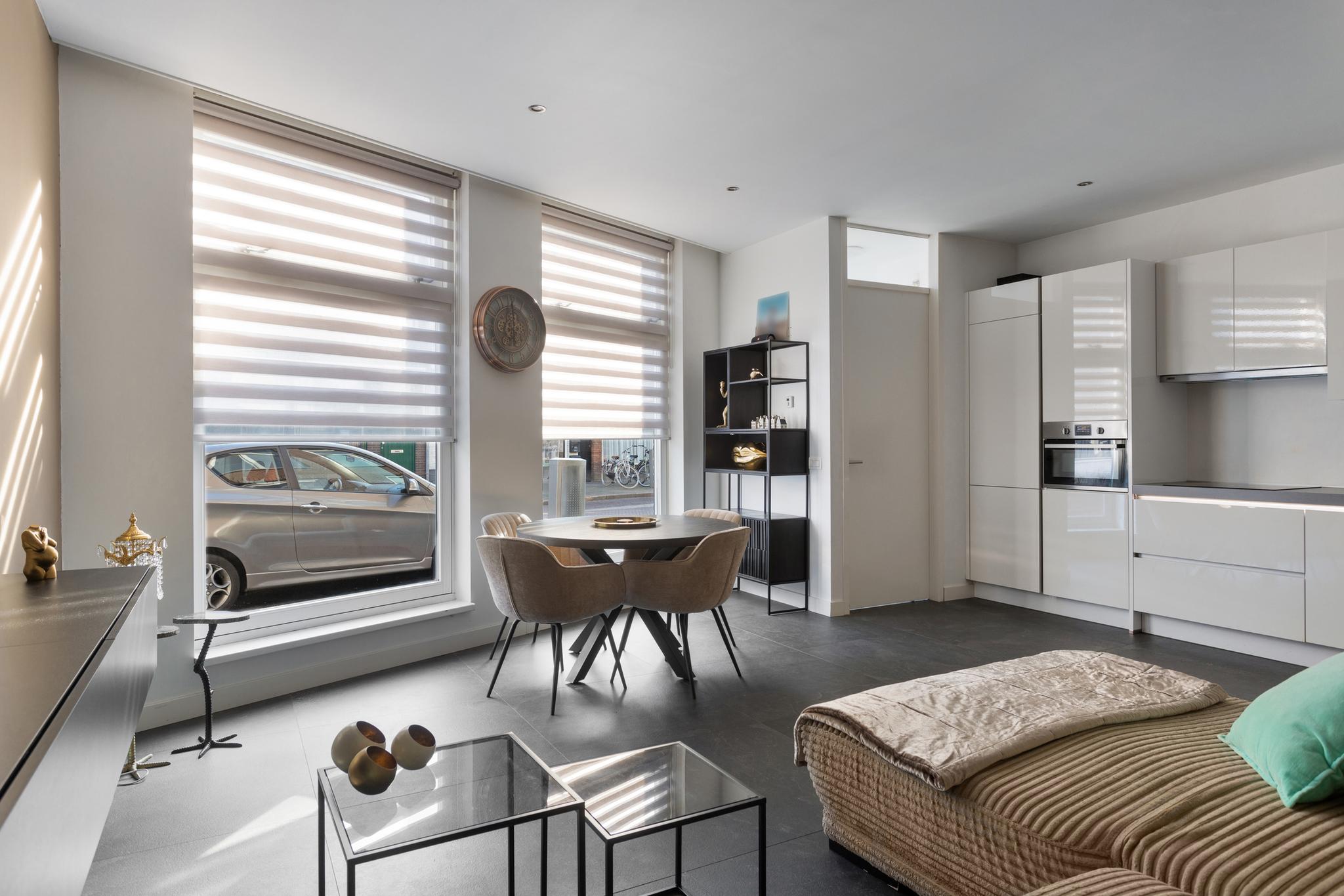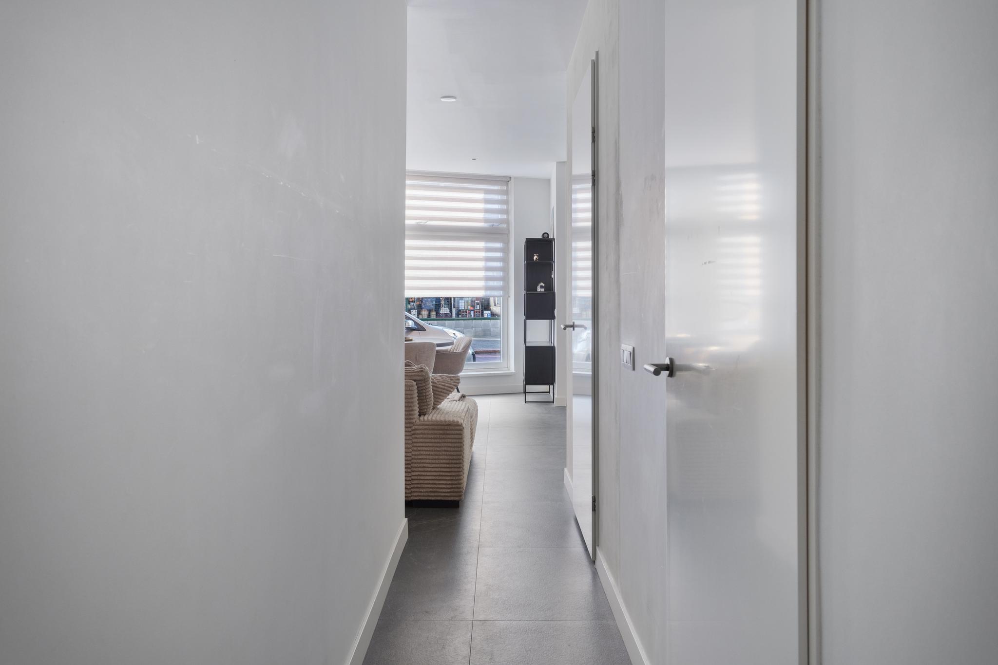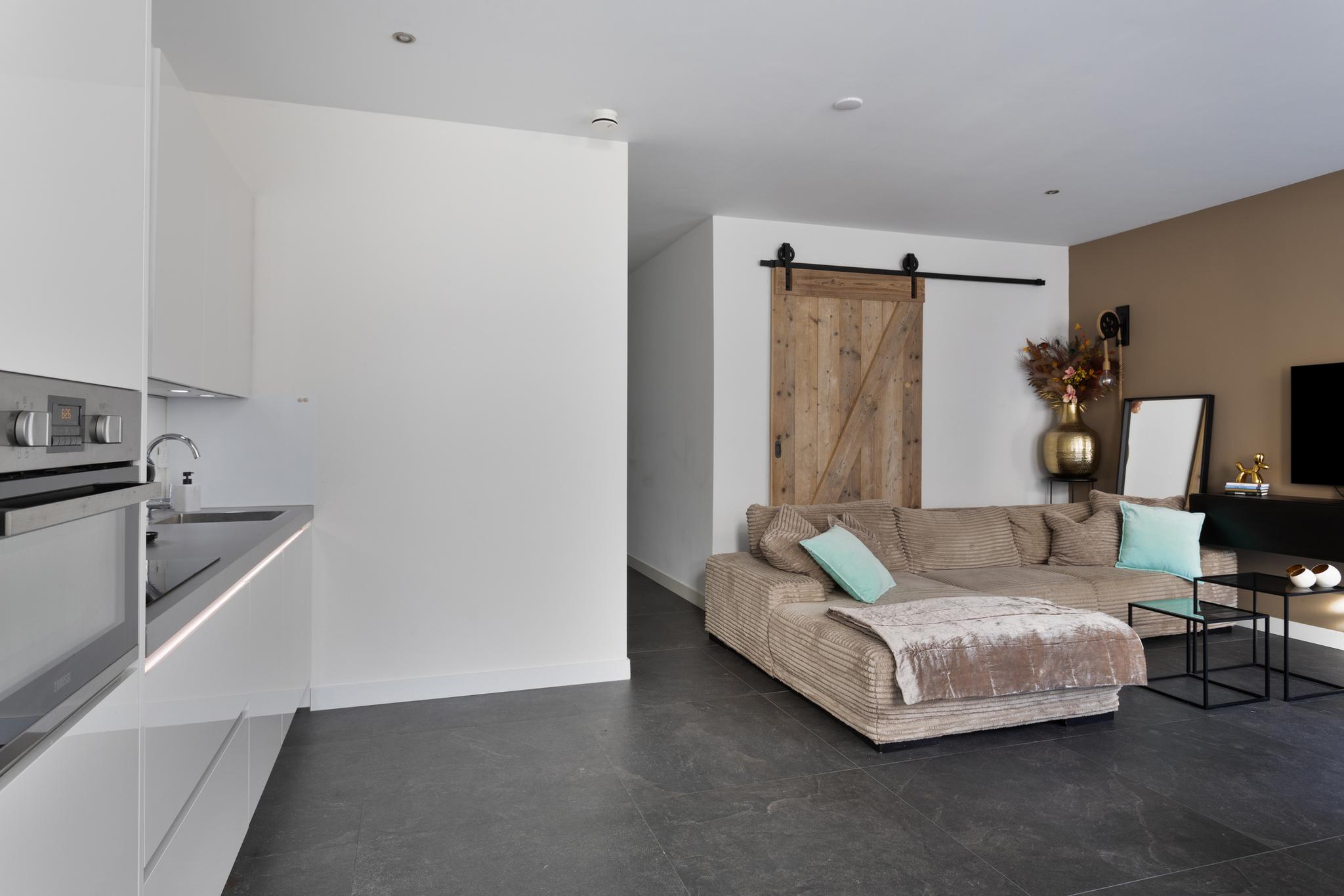 Dit appartement heeft een eigen voordeur die direct via de straat te bereiken is. De hal biedt toegang tot de garderobe en meterkast. Via een deur komen we in de woonkamer. Dit appartement uit 2017 is fantastisch afgewerkt en voorzien van grote raampartijen aan de voorzijde van het appartement. De open keuken is van alle gemakken voorzien en alle wanden zijn strak gestuct. Op de vloer ligt een tegelvloer met vloerverwarming.