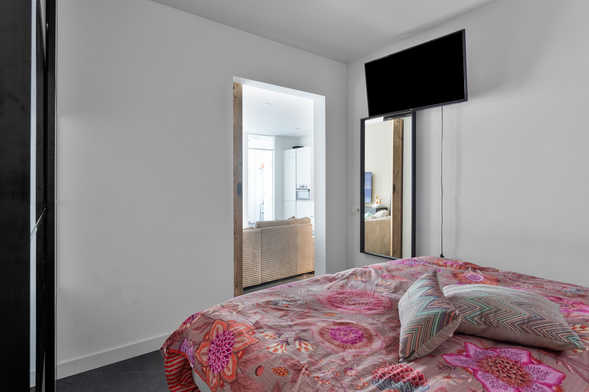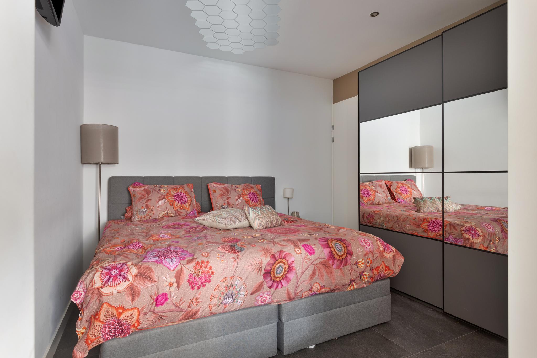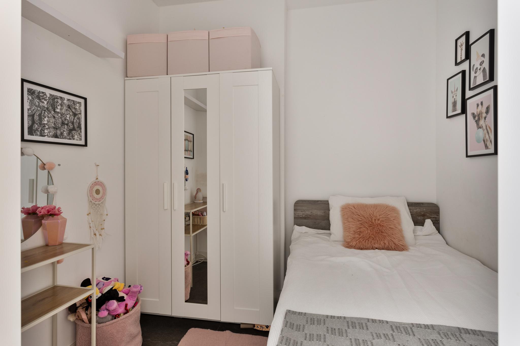 Via een houten schuifdeur is de ruime slaapkamer met vaste kast bereikbaar. Vanuit de hal zijn de overige ruimtes te bereiken. De eerste ruimte wordt door de huidige bewoner gebruikt als logeerkamer, maar is ook geschikt als kantoorruimte. Daarnaast is de voormalige eetruimte omgebouwd tot een extra kamer, die nu wordt gebruikt als babykamer, wat de flexibiliteit en mogelijkheden van dit appartement benadrukt.