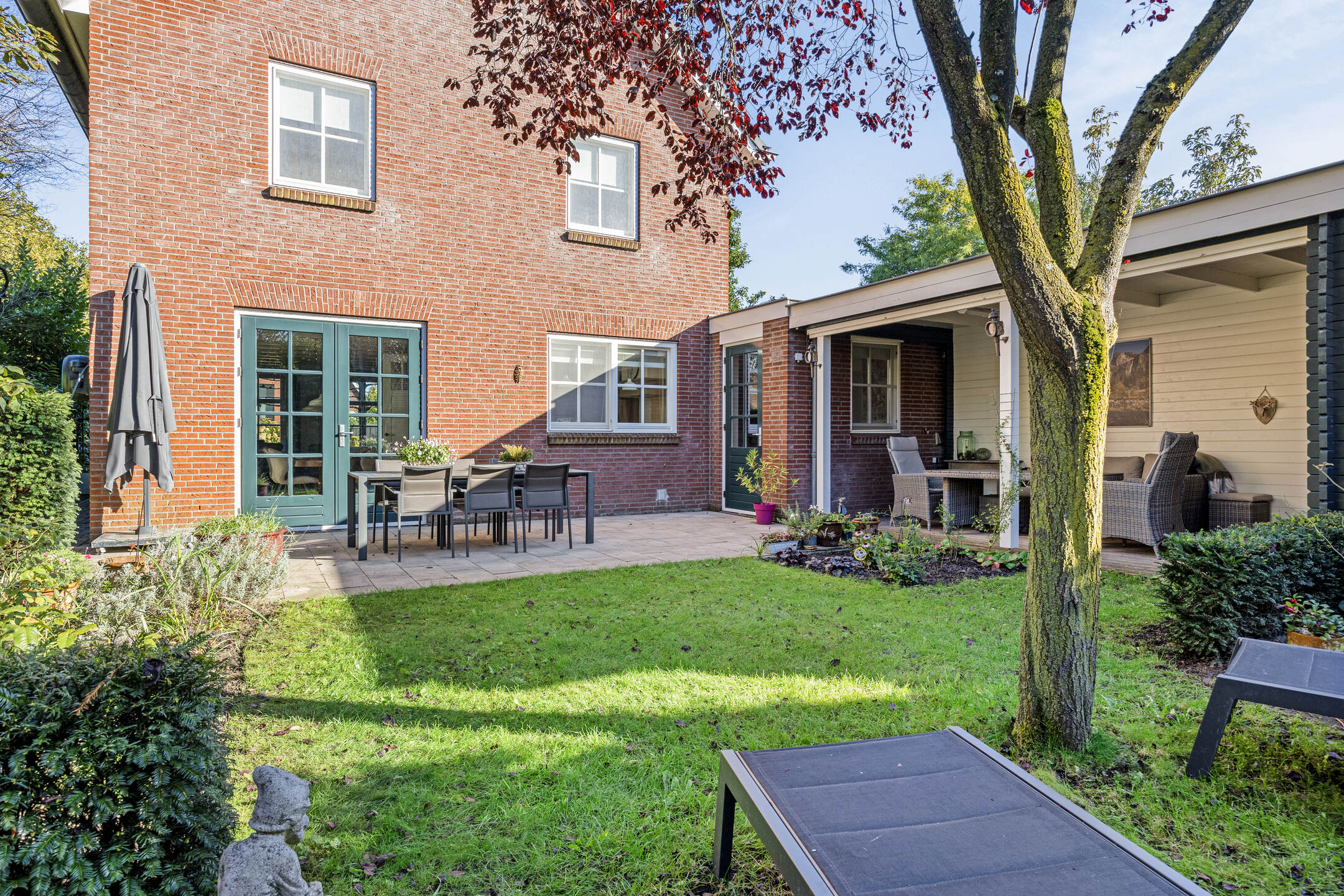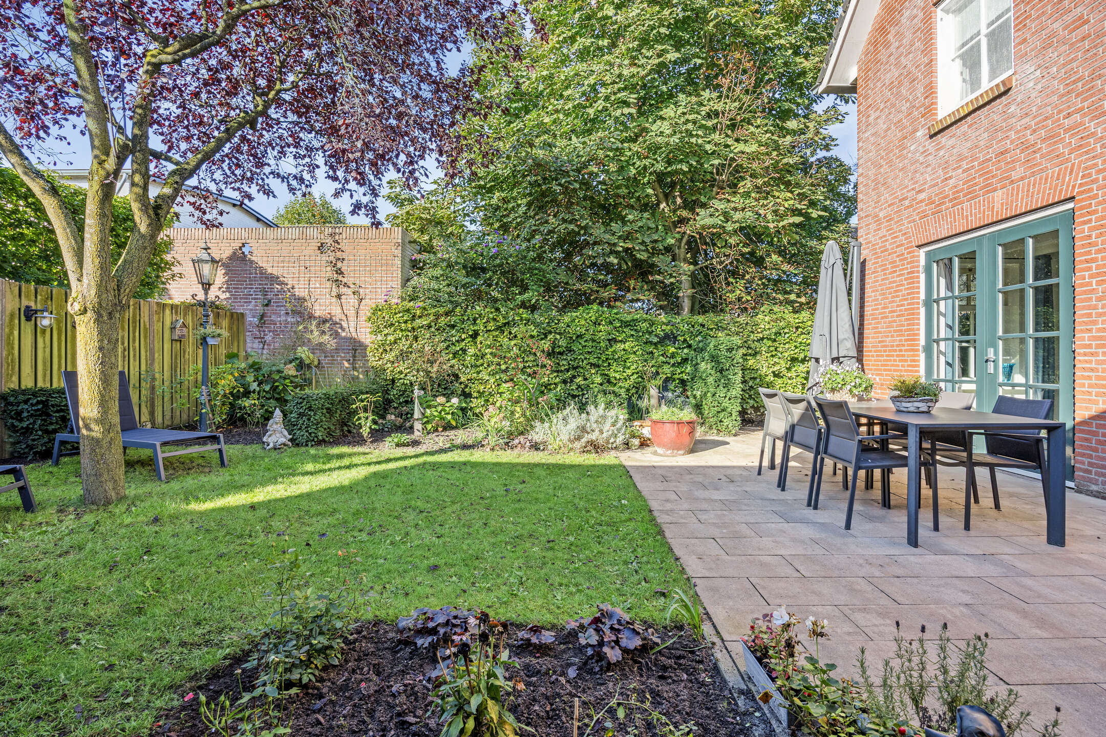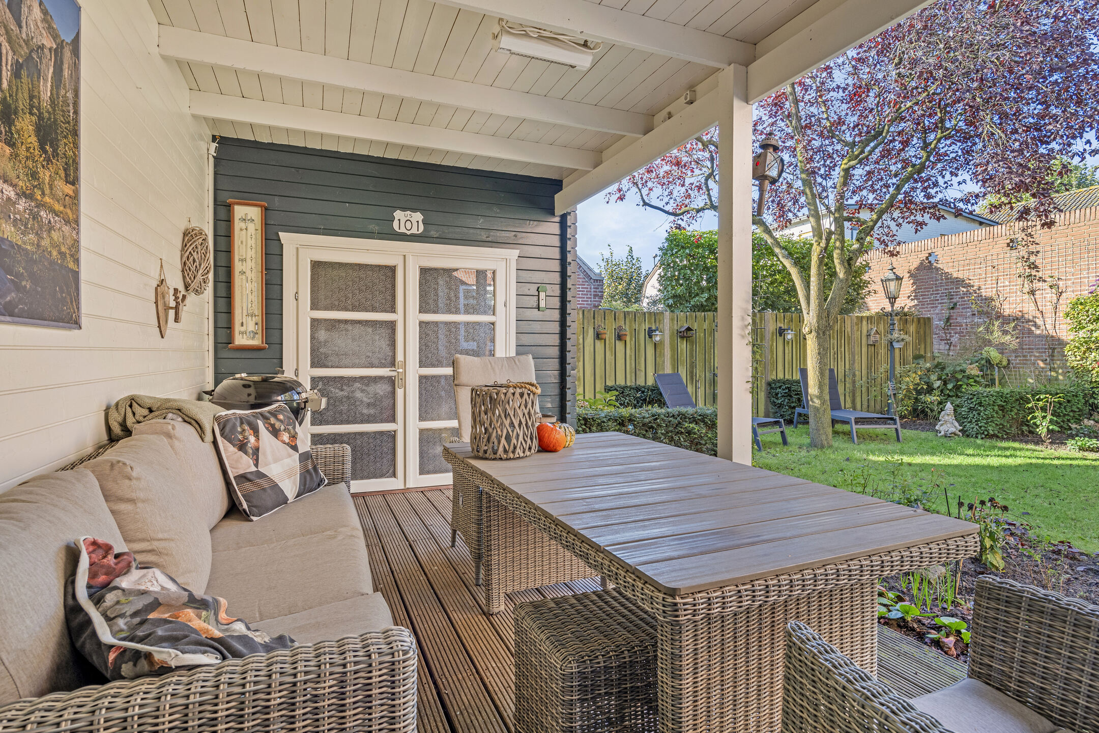 De achtertuin, gelegen op het zuiden, biedt volop privacy en is ideaal voor tuinliefhebbers. Met een diepte van 9 meter en een breedte van 12 meter heb je voldoende ruimte om te ontspannen op het terras bij de openslaande deuren, onder de overkapping (2015) of op het gazon. Via de zijkant is de tuin toegankelijk.