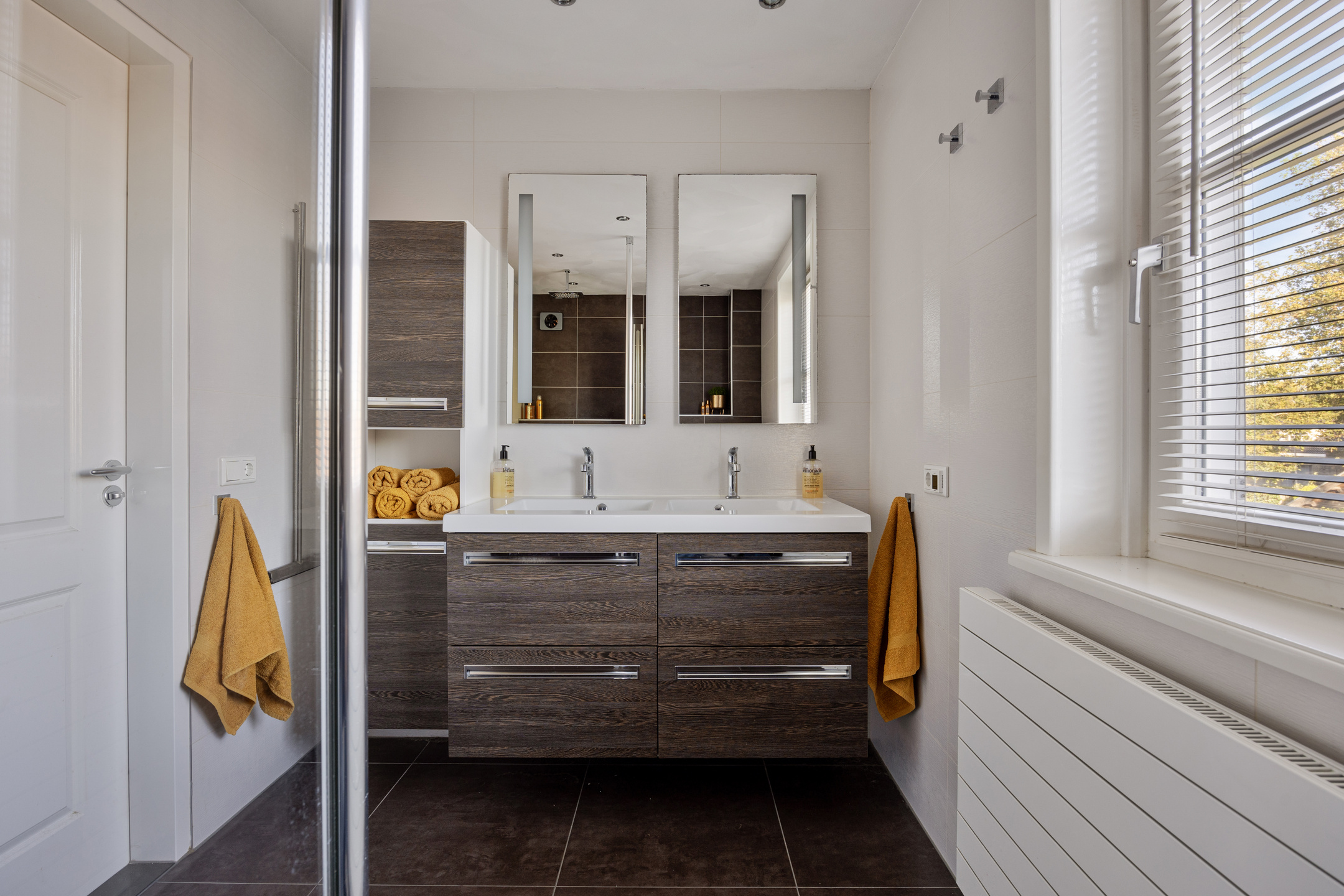 - Toilet, dubbele wastafel, wastafelmeubel en inloopdouche