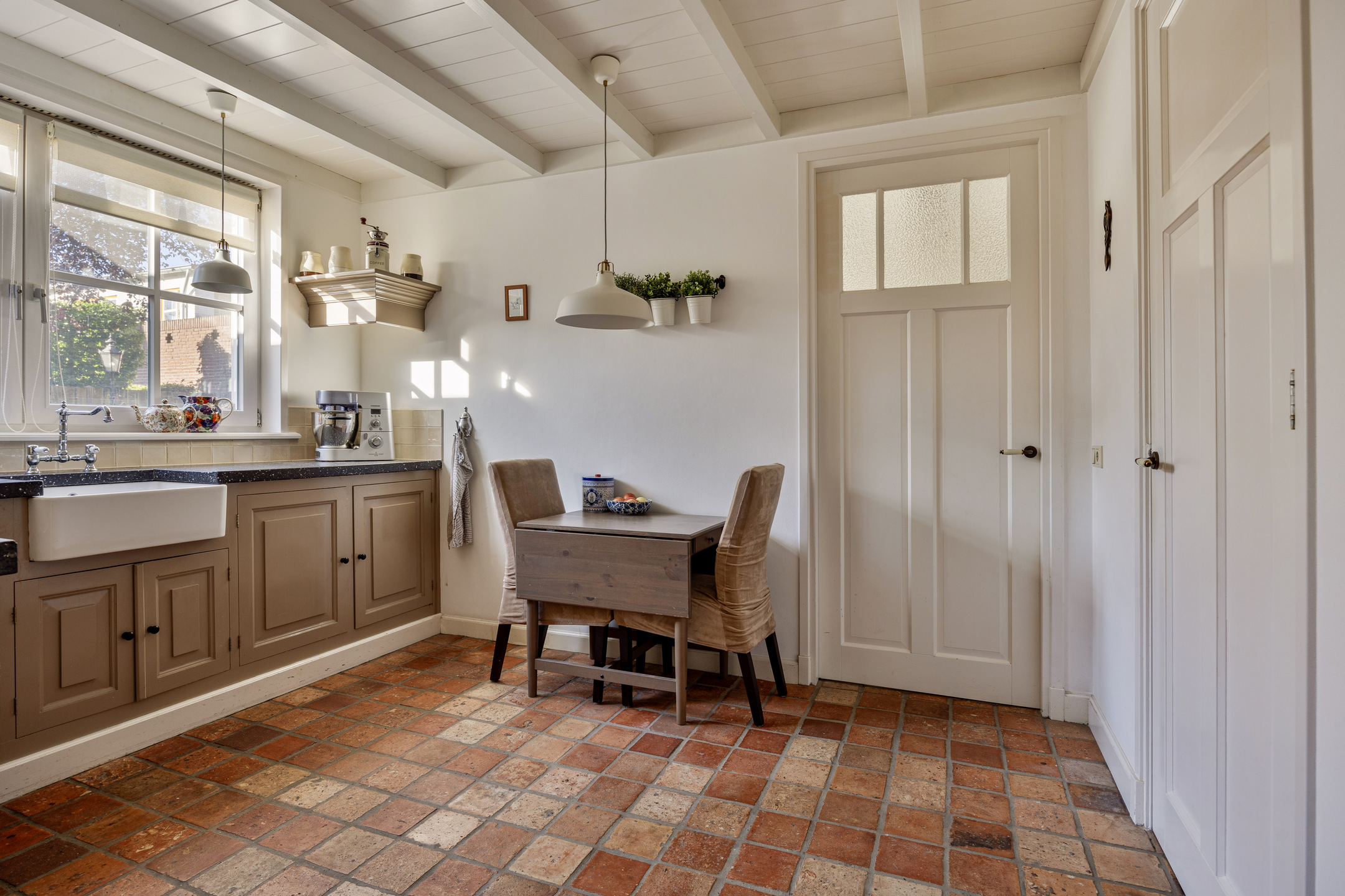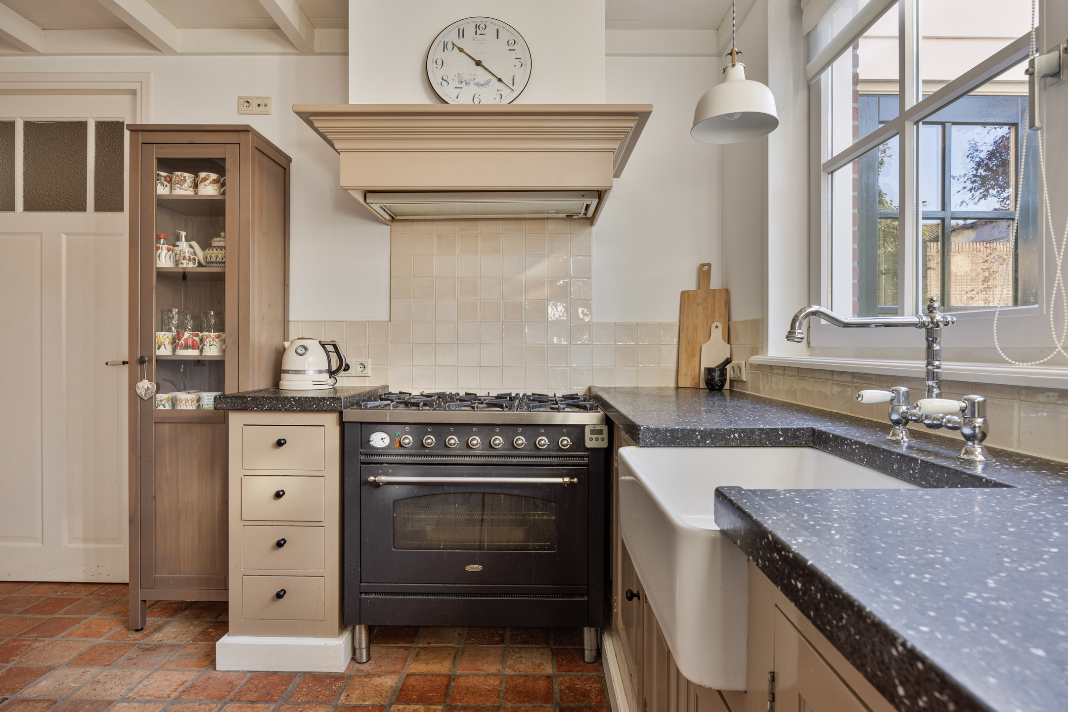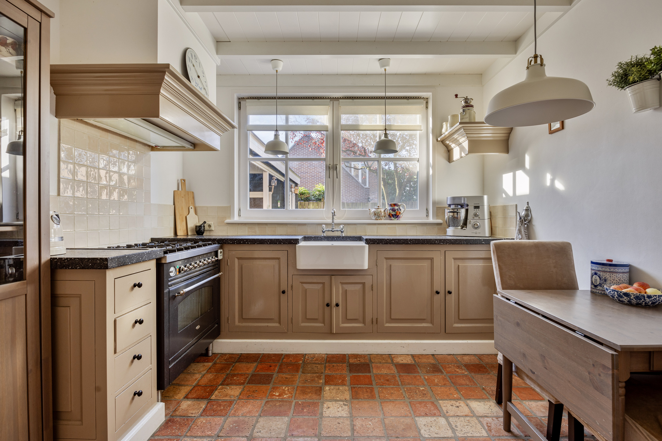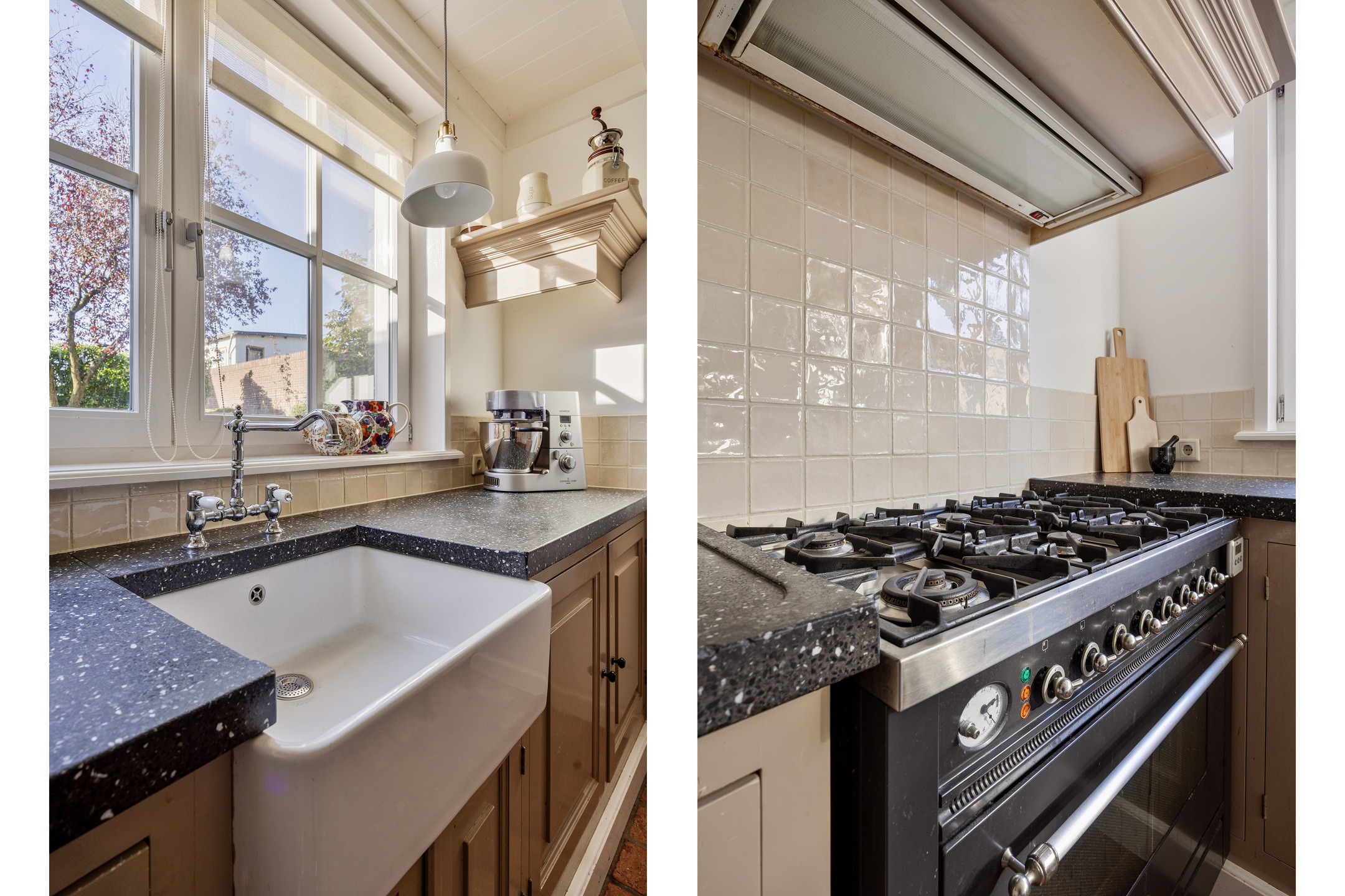 Aangrenzend ligt de gezellige woonkeuken met een praktische kelderkast en een op maat gemaakt keukenblok in hoekopstelling. De keuken is uitgerust met een Boretti 6-pits gasfornuis en oven, afzuigkap, spoelbak, granieten werkblad en voldoende kastruimte.