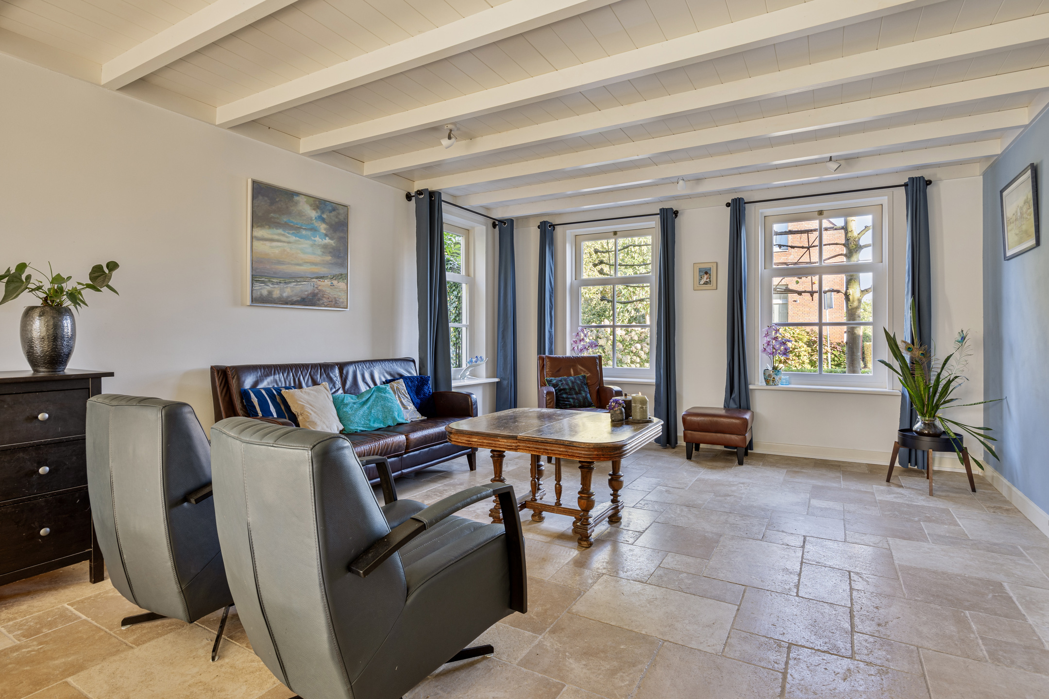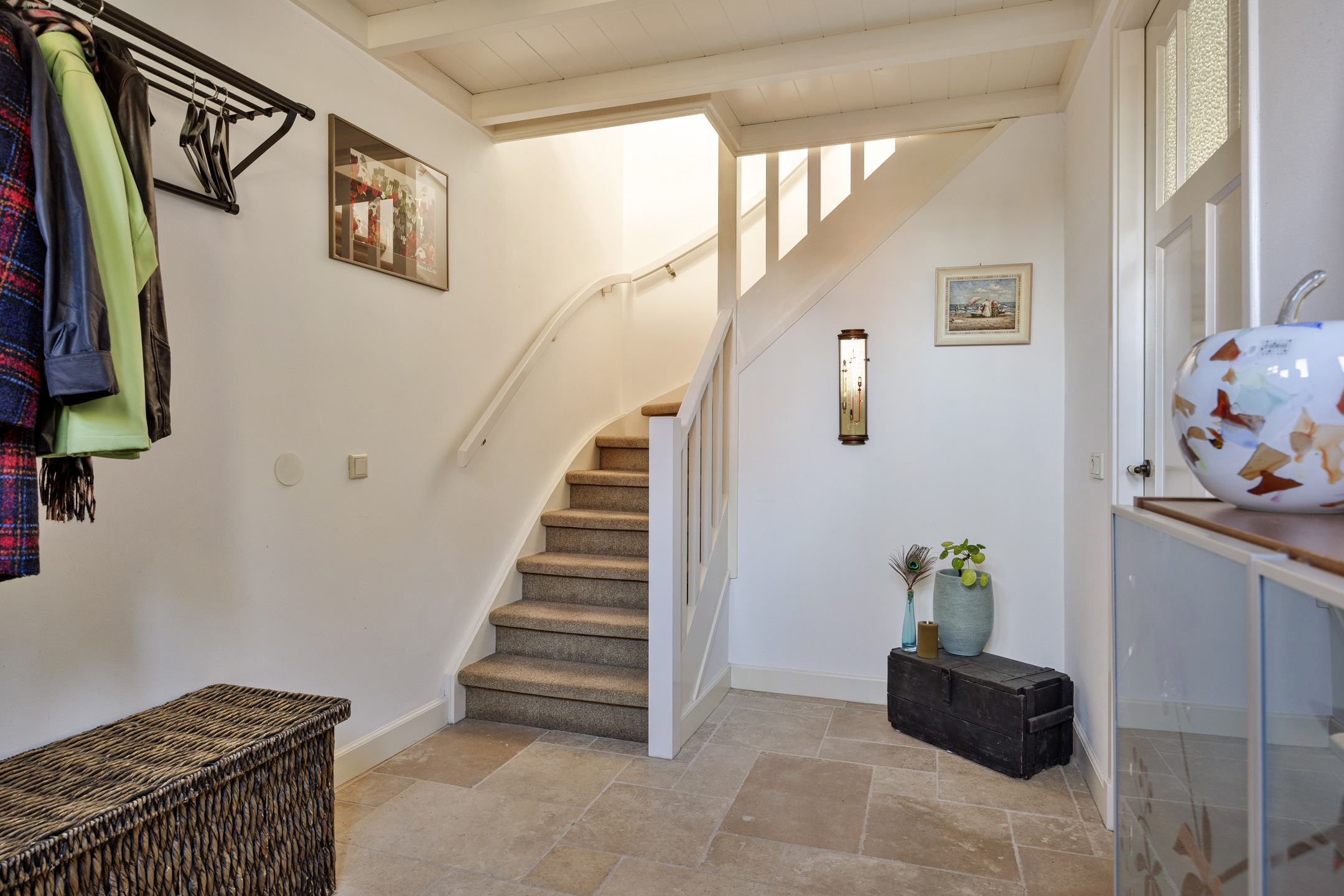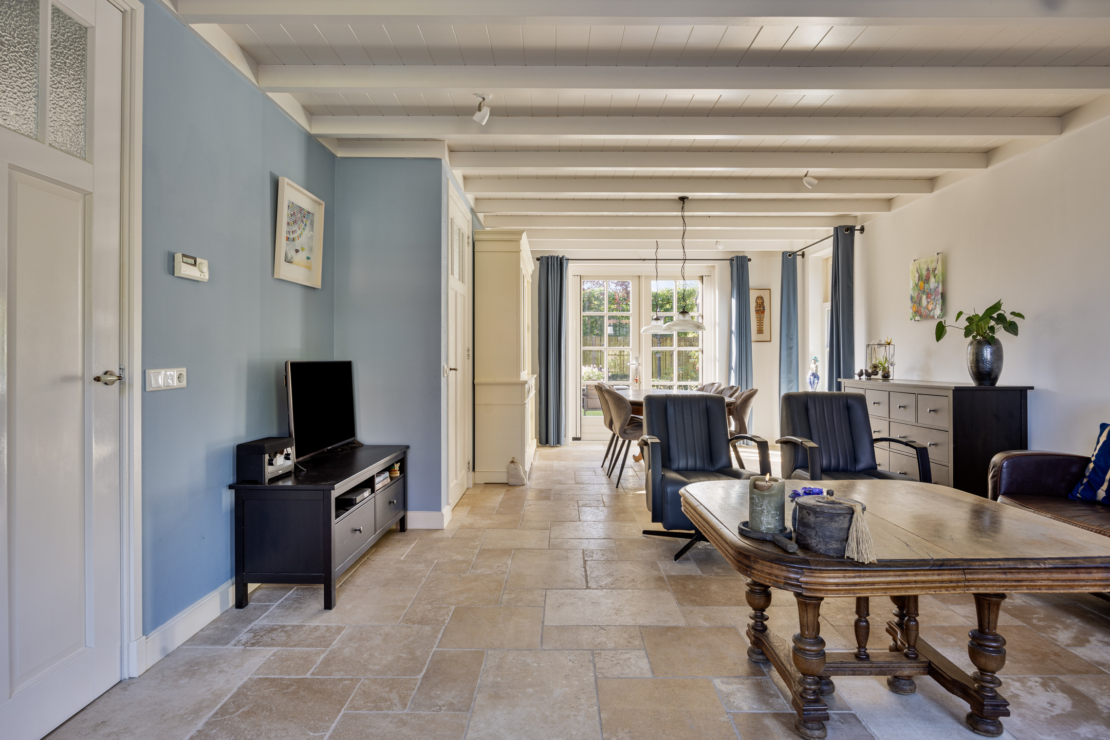 Bij binnenkomst treffen we een lichte hal met natuurstenen vloer, meterkast en trapopgang. Vanuit de hal bereiken we de ruime woonkamer, die eveneens een natuurstenen vloer heeft en voorzien is van vloerverwarming en openslaande deuren naar de tuin.