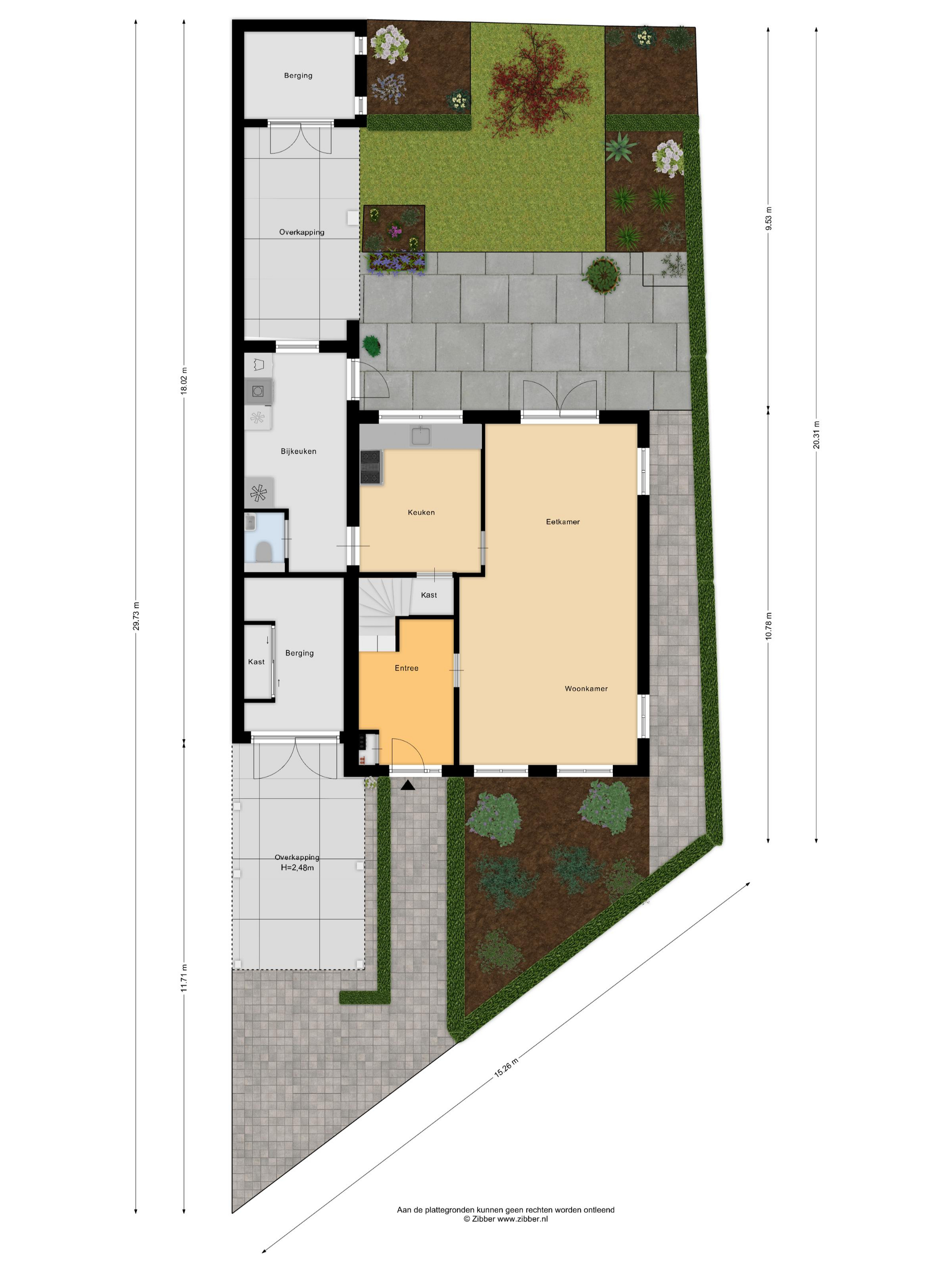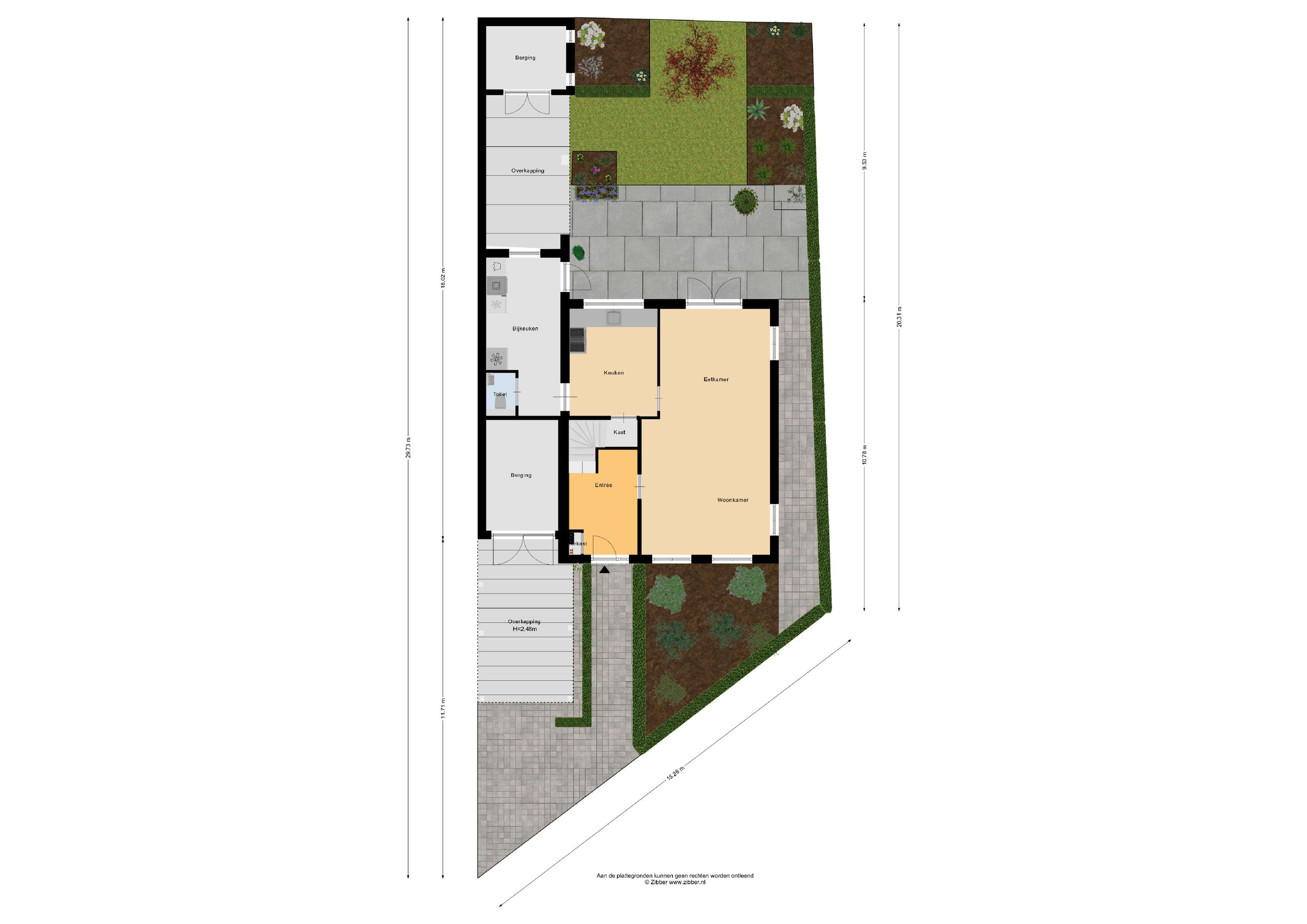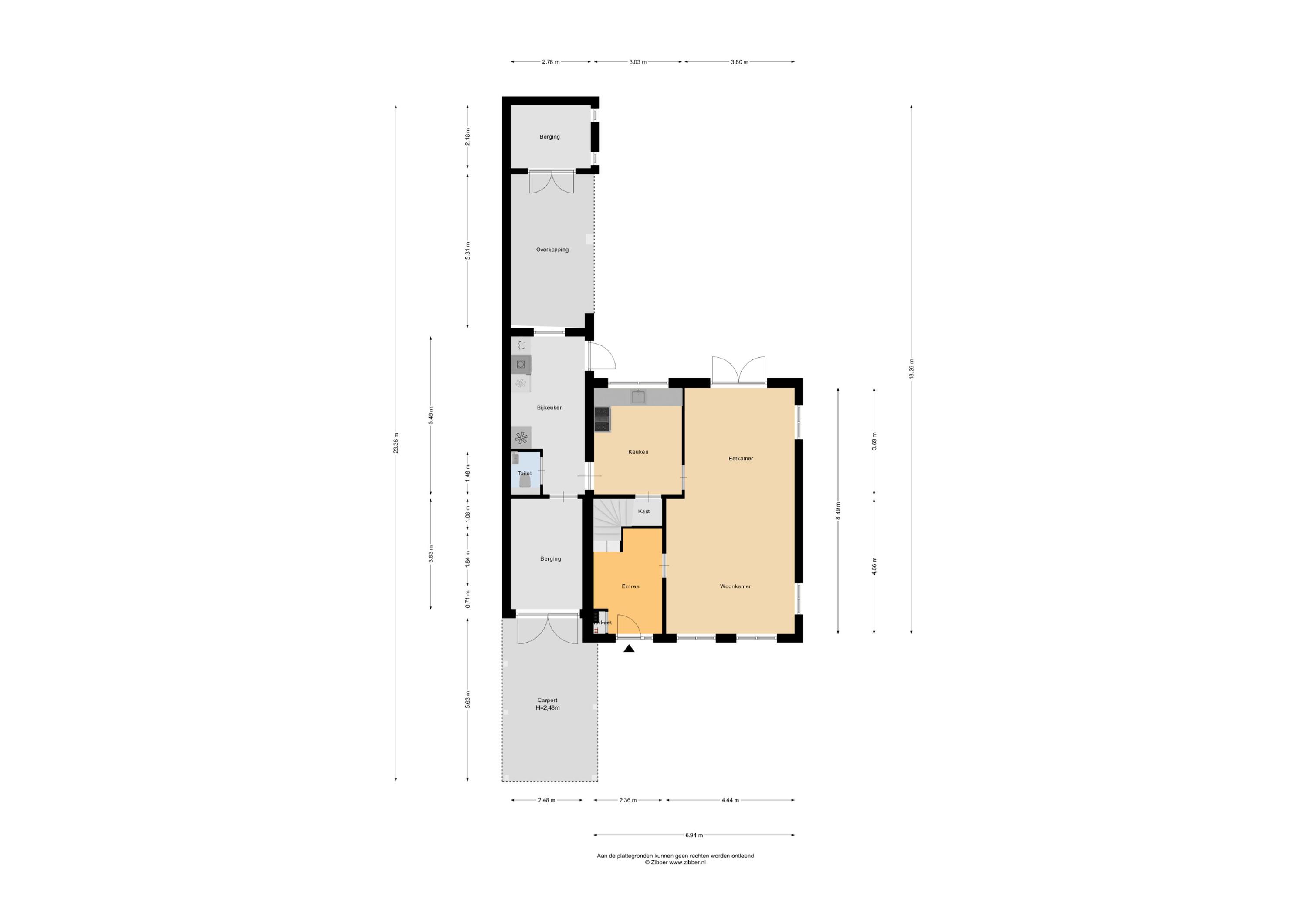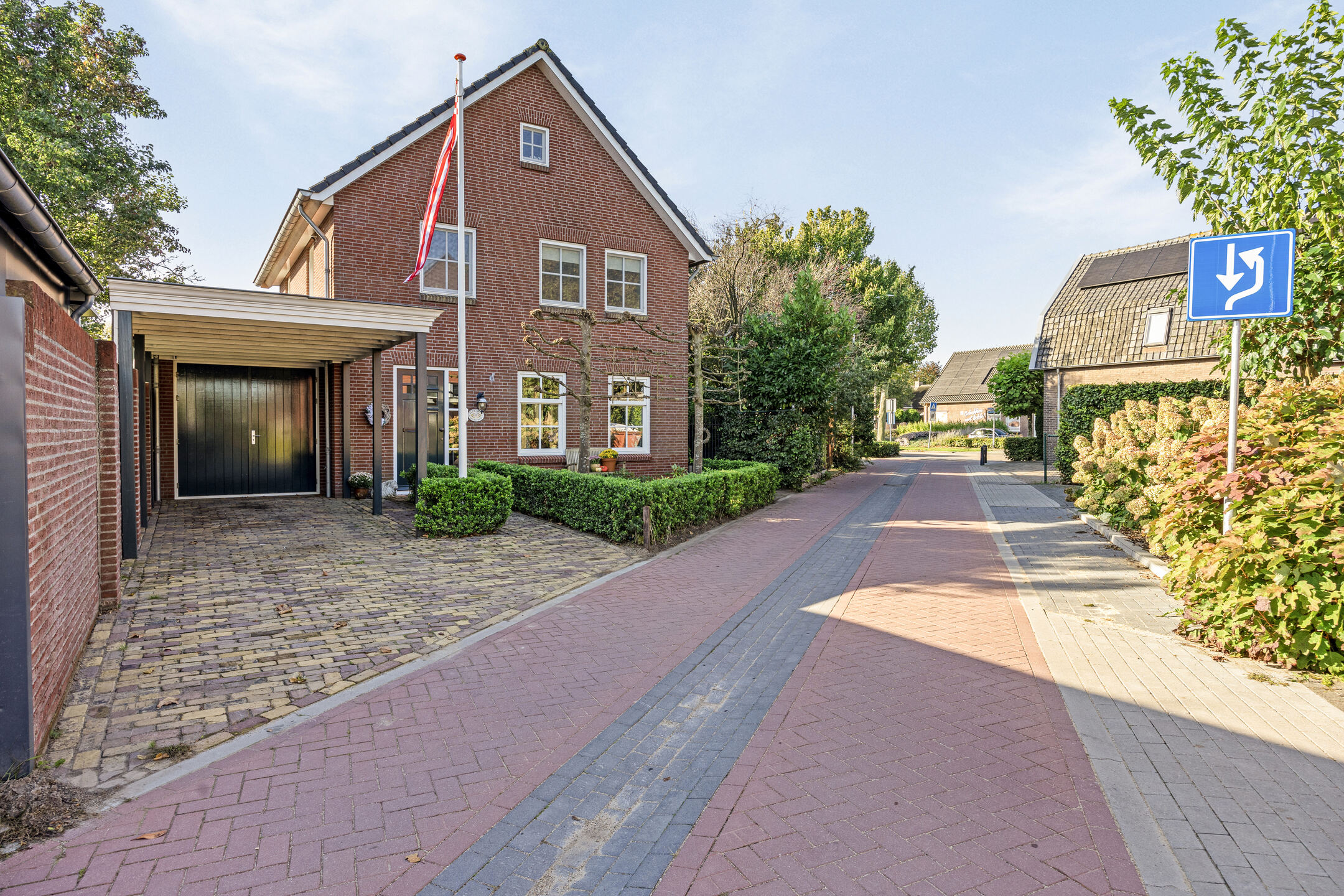 Aan de voorkant van de woning vind je de berging met een deur naar de carport, die toegang geeft tot de oprit. De carport biedt extra beschutting voor de auto.