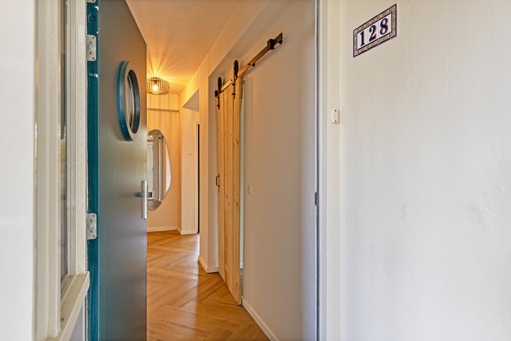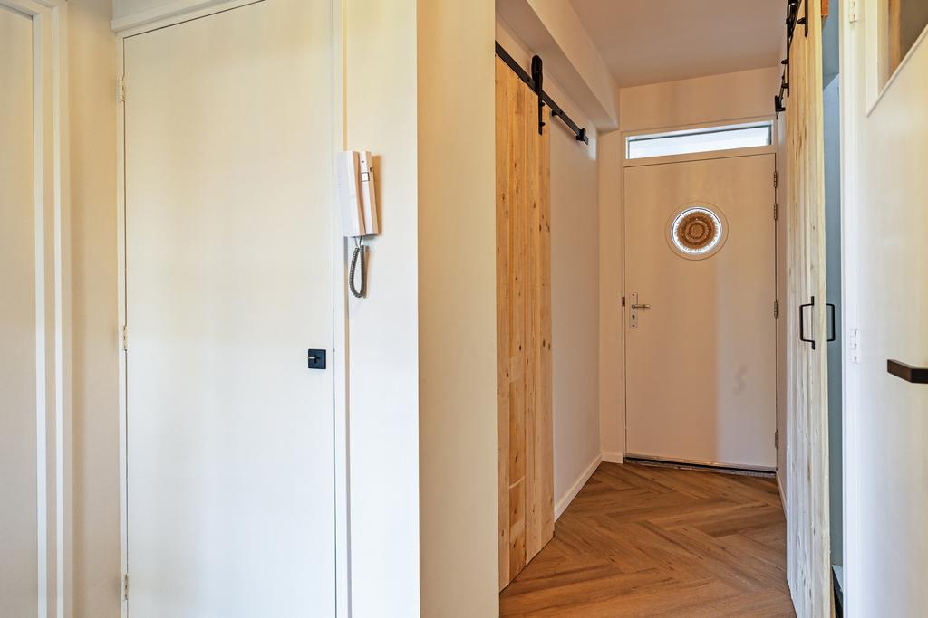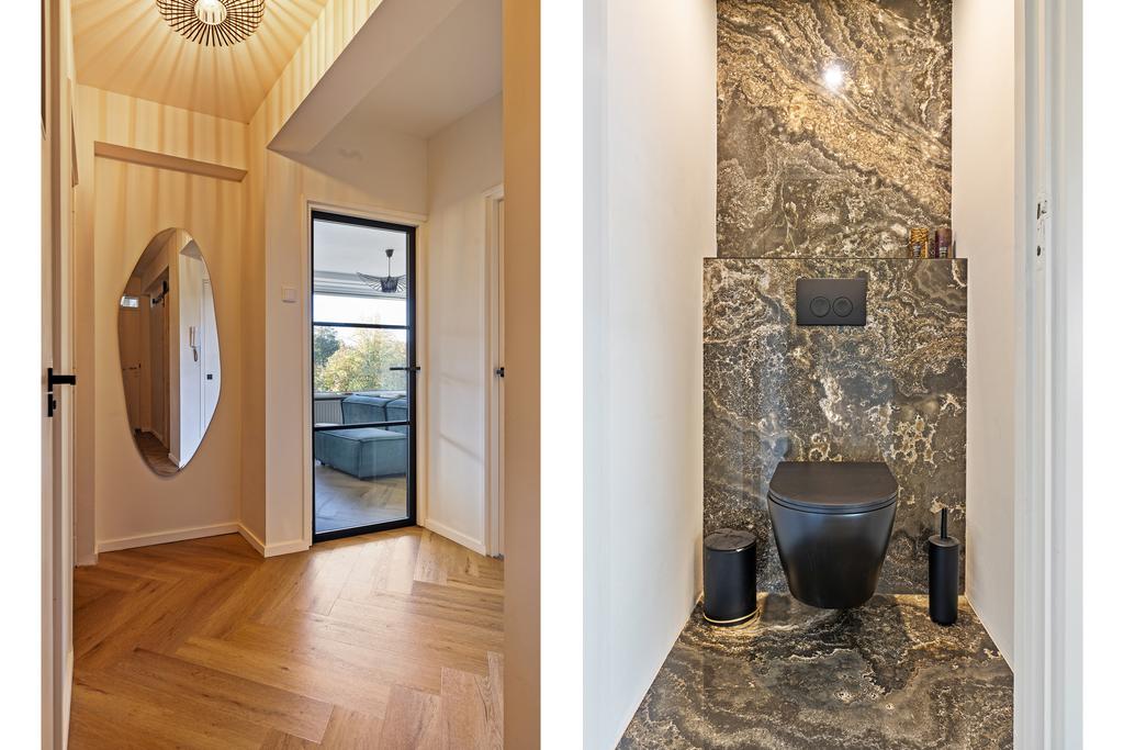 Achter de voordeur van het appartement bevindt zich de entreehal, die toegang biedt tot alle vertrekken en is voorzien van een mooie visgraat vloer die is doorgelegd naar de woon- en slaapkamers. De badkamer, gelegen aan de achterzijde van het appartement, is ruim opgezet en zeer luxe afgewerkt. De ruimte is in 2023 vernieuwd en uitgerust met een mooi meubel met dubbele wastafel en een royale inloopdouche. De badkamer wordt verlicht met inbouwspots en is afgewerkt met fraaie zwarte inbouwkranen. Het toilet is eveneens fraai afgewerkt in dezelfde stijl als de badkamer en voorzien van een wandcloset.