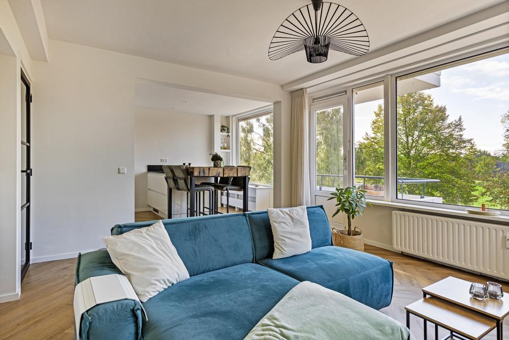 De ruime woonkamer is voorzien van een prachtige vloer en strakke wanden. Aan de voorzijde heeft de woonkamer een zeer brede raampartij, die voor een geweldige lichtinval in de ruimte zorgt. Vanuit de woonkamer heeft u een openslaande deur naar het balkon. Het balkon is gelegen op het zuiden met een fraai en vrij uitzicht.