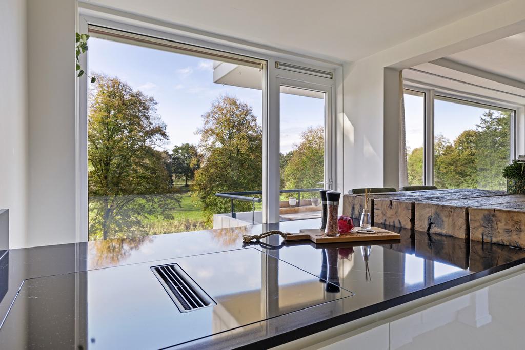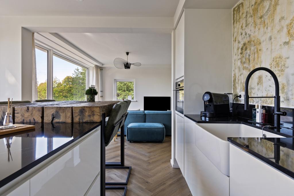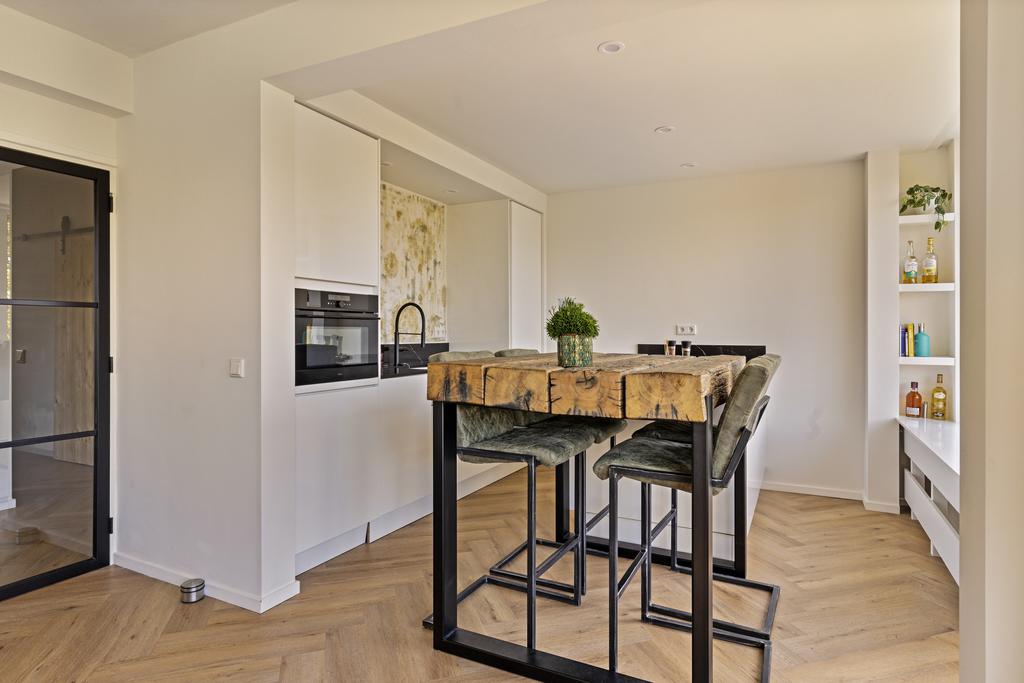 De zeer luxe keuken is in 2023 vernieuwd en fraai ingericht met een hoogglans witte inrichting afgewerkt met een mooi natuurstenen werkblad. U beschikt hier over de volgende apparatuur: vaatwasser, ijskast, inductie kookplaat met ingebouwde afzuiging en een combi-oven. Ook in de keuken geniet u van veel daglicht dankzij de aanwezigheid van een groot raam.